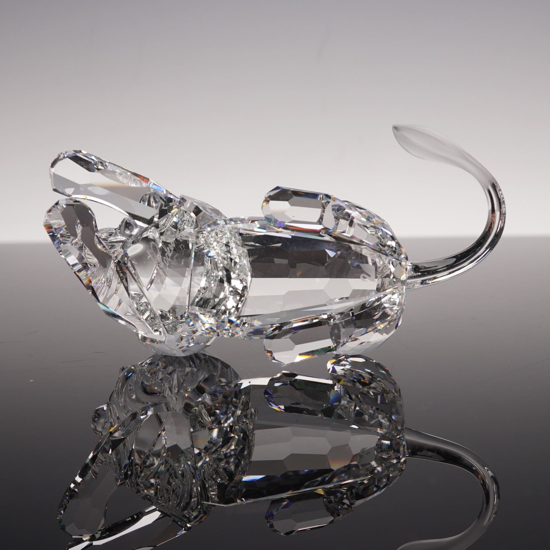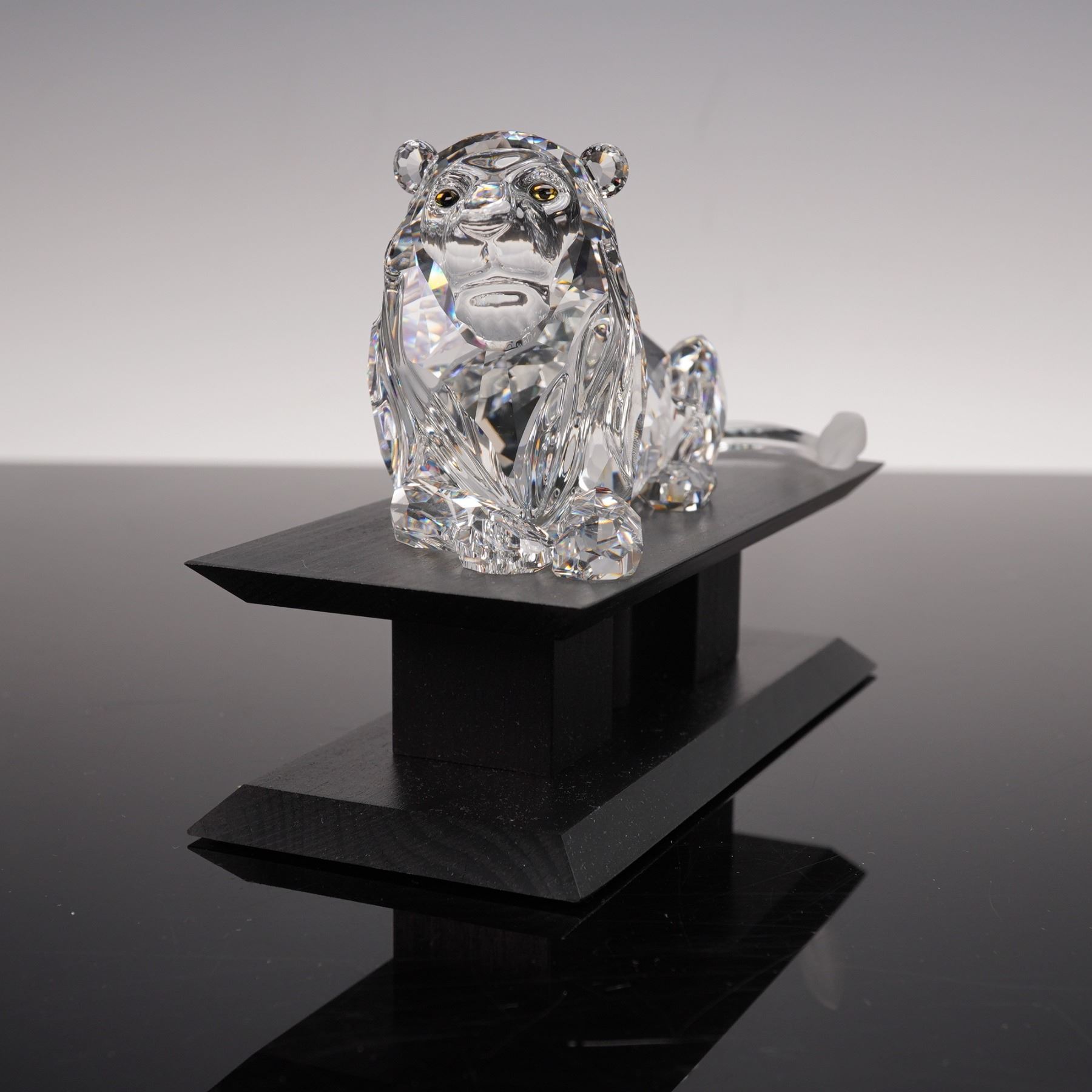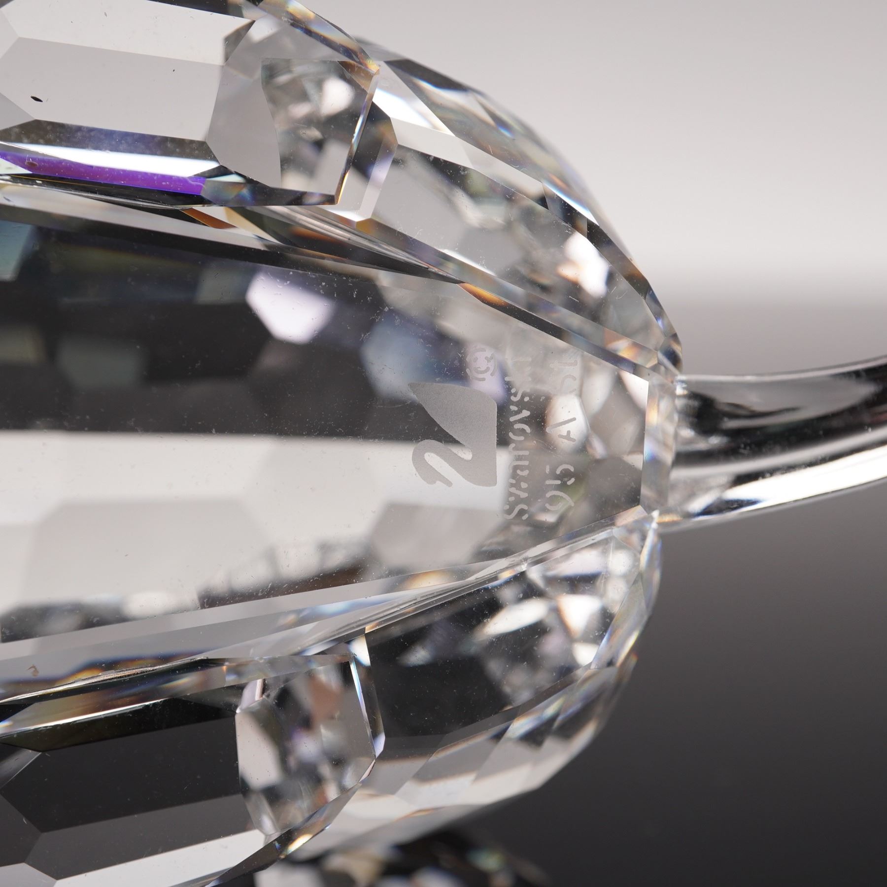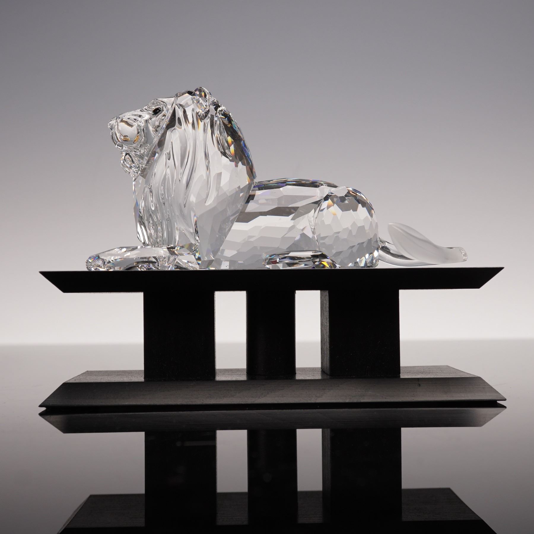 Elegant Swarovski Crystal Society (SCS) 1995 Annual Edition figurine, titled Lion, designed by Adi Stocker as part of the Inspiration Africa trilogy (1993-1995). Expertly faceted from clear crystal with a frosted tail tip and mane details, the lion embodies regal strength and precision craftsmanship. The underside is engraved with the Swarovski swan logo, SCS. Designer signature "AStocker 1995" on plaque. This lot includes the original SCS presentation box, display base, and etched crystal plaque reading SCS Inspiration Africa 1993-1995. The complete three-piece ensemble is presented in excellent display-ready condition and exemplifies Swarovski's artistry during the mid 1990s collector era. 185410.