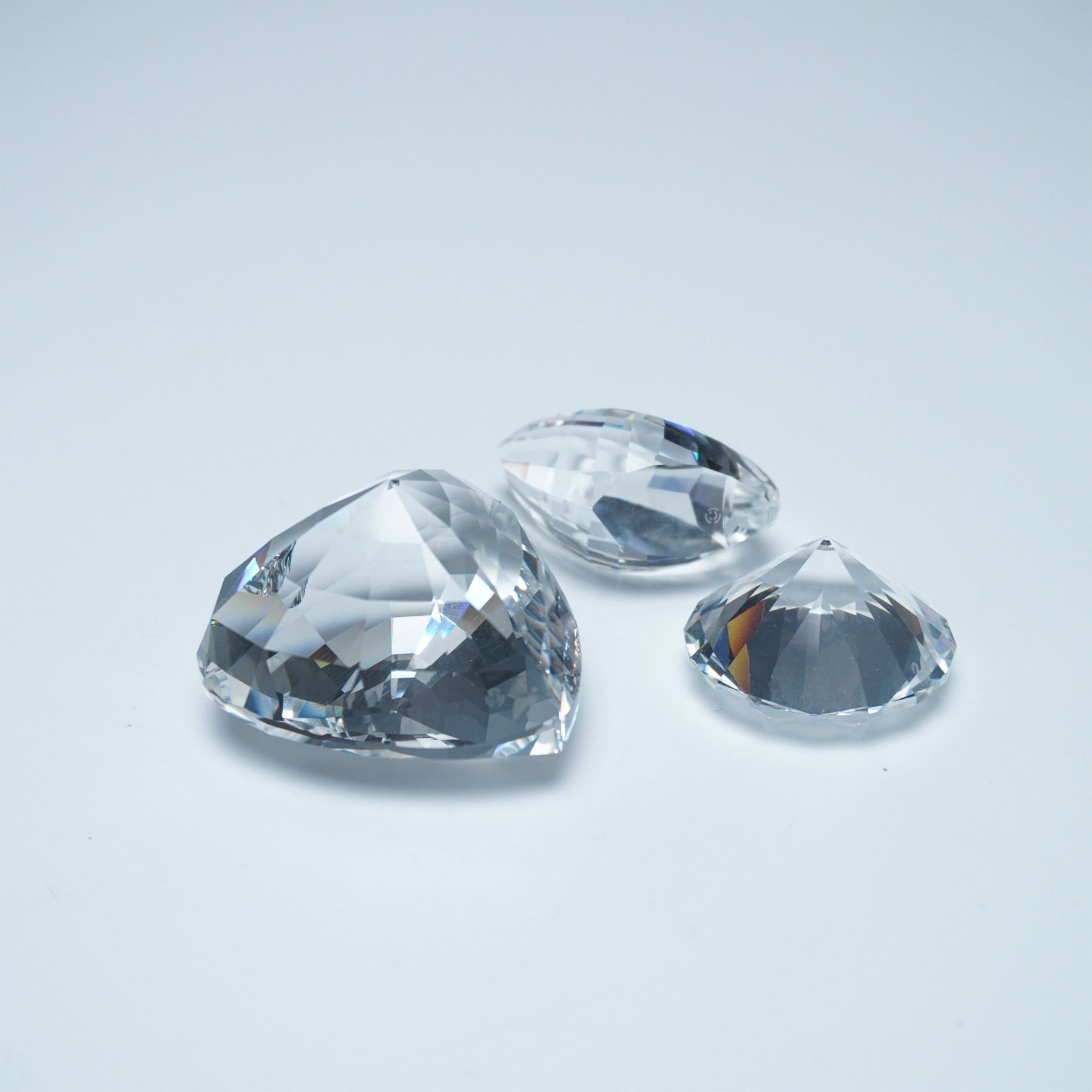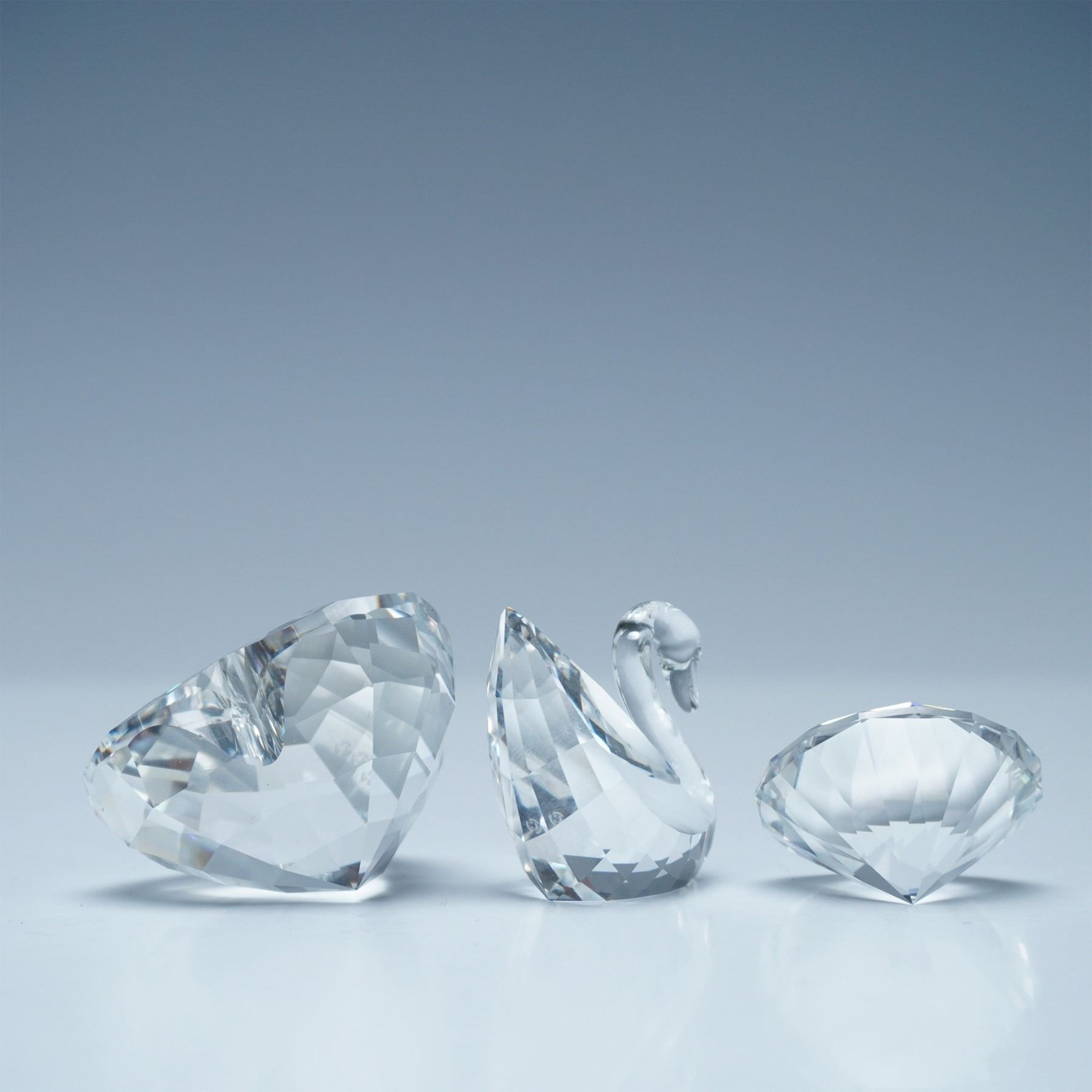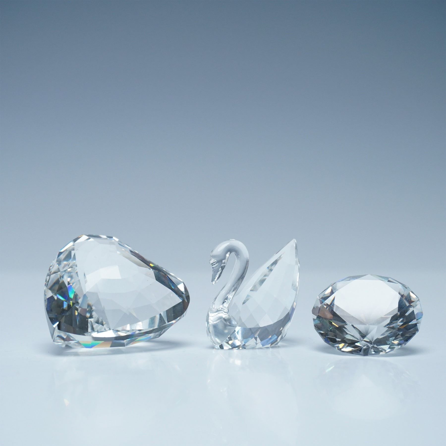 This collection includes the Chaton 1990 Renewal Gift paperweight, the Heart 1996 Renewal Gift paperweight, and the Mini Swan figurine. Each piece features precise faceting, reflecting Swarovski's signature craftsmanship. The Chaton and Heart paperweights were exclusive membership renewal gifts for Swarovski Collectors Society members, making them highly sought-after pieces. The Mini Swan, an iconic representation of the brand, showcases a sleek, elegant design. A desirable set for collectors and enthusiasts of Swarovski crystal artistry. Chaton 1990 Renewal Gift: 1.25"W x 0.75"H. Heart 1996 Renewal Gift (199130): 1.5"L x 1.25"H. Swan Mini (010021): 1"H; c. 1982 - 1988; Max Scheck.