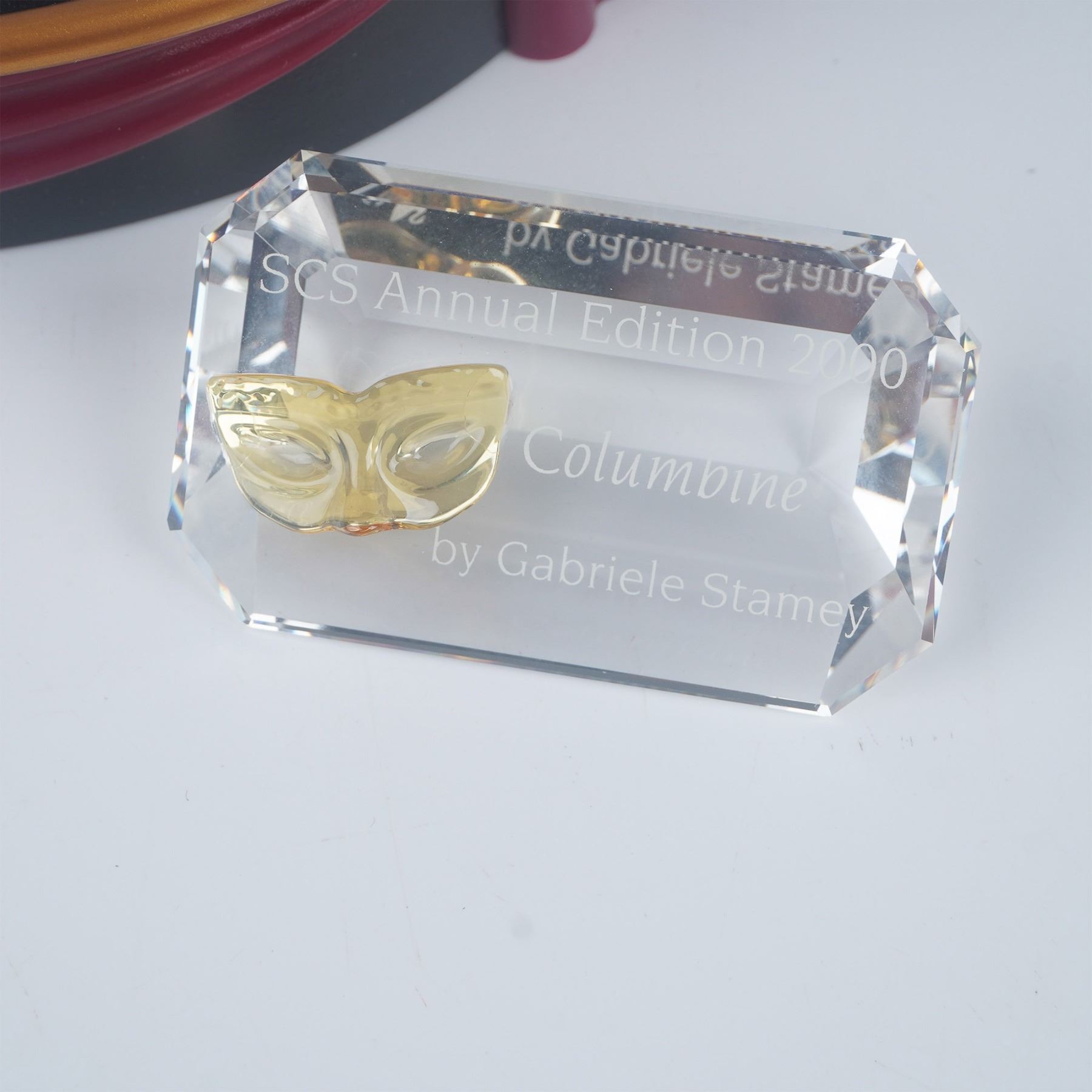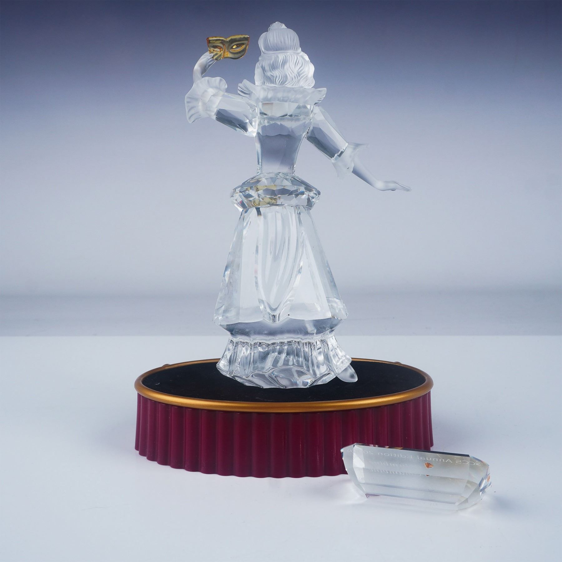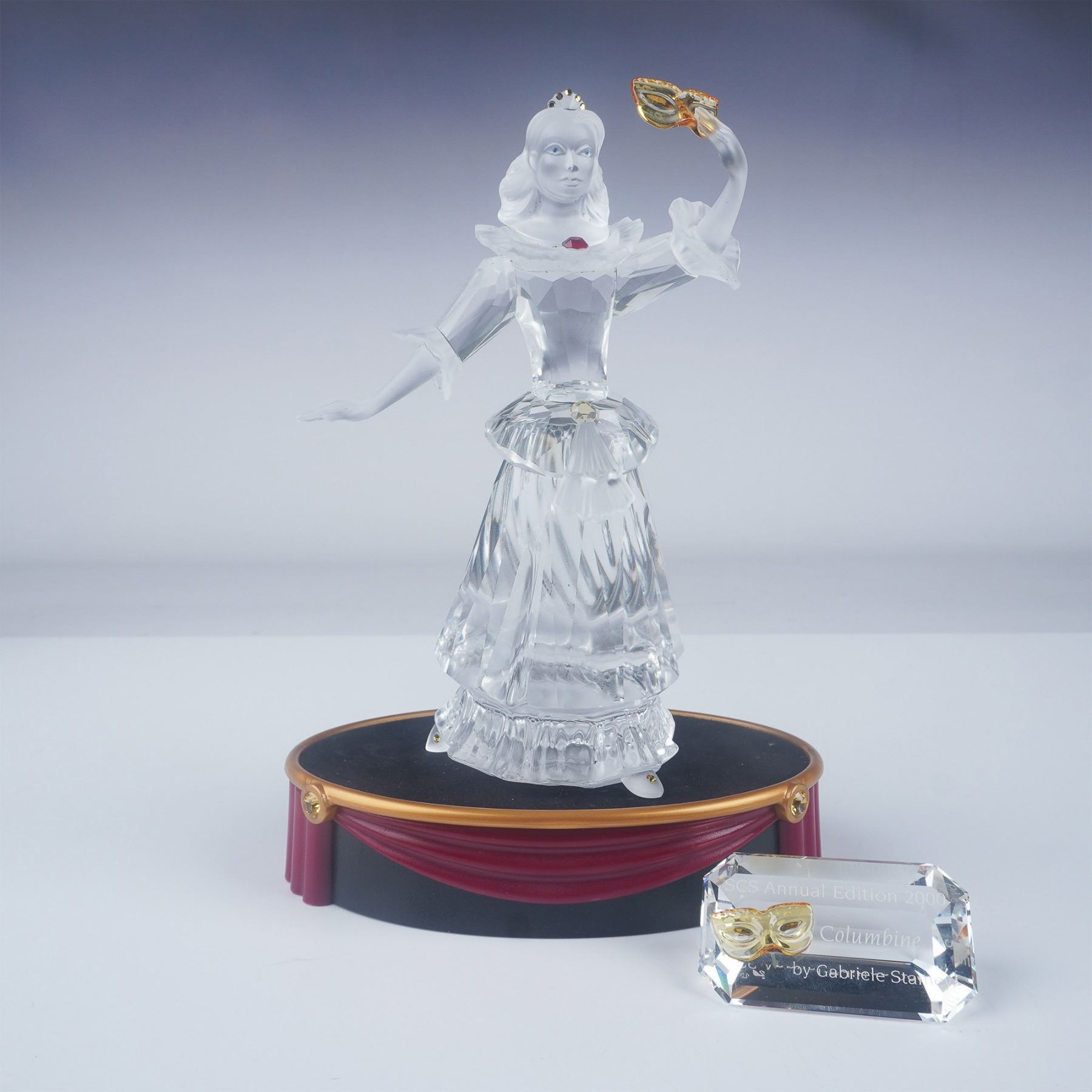 The second piece of the Masquerade trilogy. This Swarovski crystal figurine, Columbine, represents a captivating character from the Commedia dell'Arte tradition. Designed by Gabriele Stamey, this elegant piece features a frosted face and delicate details, including a gold mask and vibrant red accents. The lot includes the original theatrical base and an etched plaque with a gold-tone mask emblem. Both original boxes are included, ensuring the preservation and authenticity of this collectible. Swarovski swan mark. 242032. Plaque: 1"H. Base: 1.25"H.