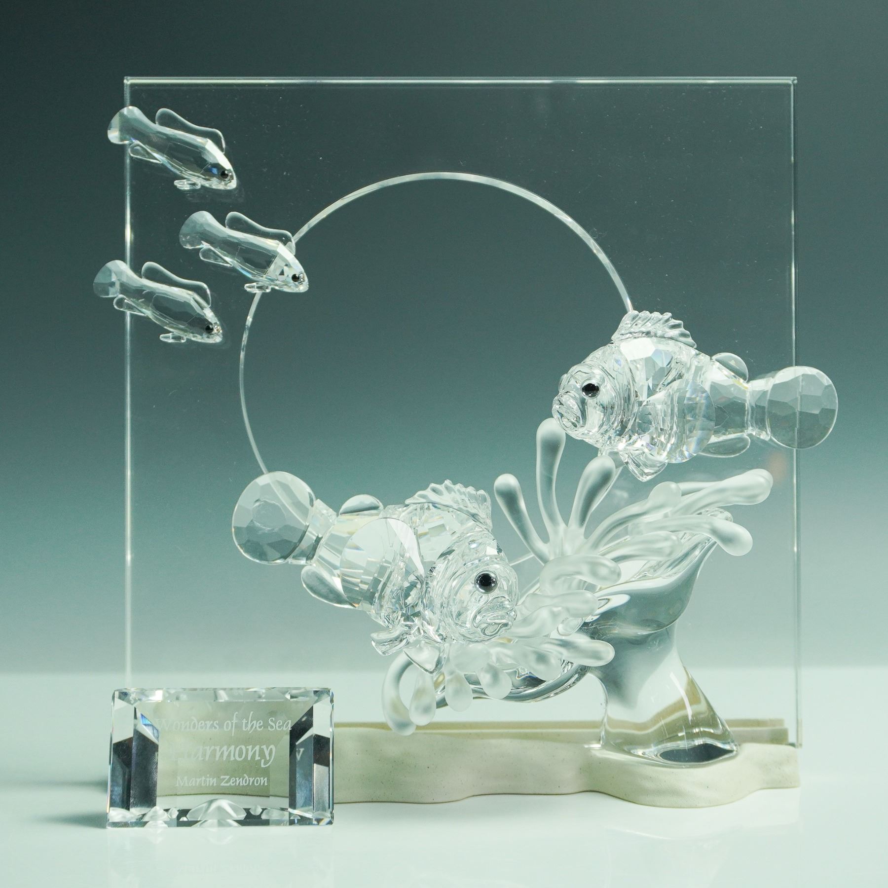 The Swarovski annual edition for 2005, 'Harmony', is the first release in the 'Wonders of the Sea' trilogy, marking a return to Swarovski's renowned animal trilogies. Designed to interlock with the subsequent editions, this piece creates a seamless underwater scene when displayed as a set. 'Harmony' features a small school of fish in the upper left corner and a frosted crystal anemone in the lower right, where two clownfish elegantly swim. This collection also includes the 2005 annual edition 'Harmony' plaque, adding to its collectible appeal. A stunning piece for Swarovski collectors and marine life enthusiasts alike. Swarovski marked. 681823. This item has a base included: 7.5"L x 0.75"H. Plaque (698560): 1.25"H.