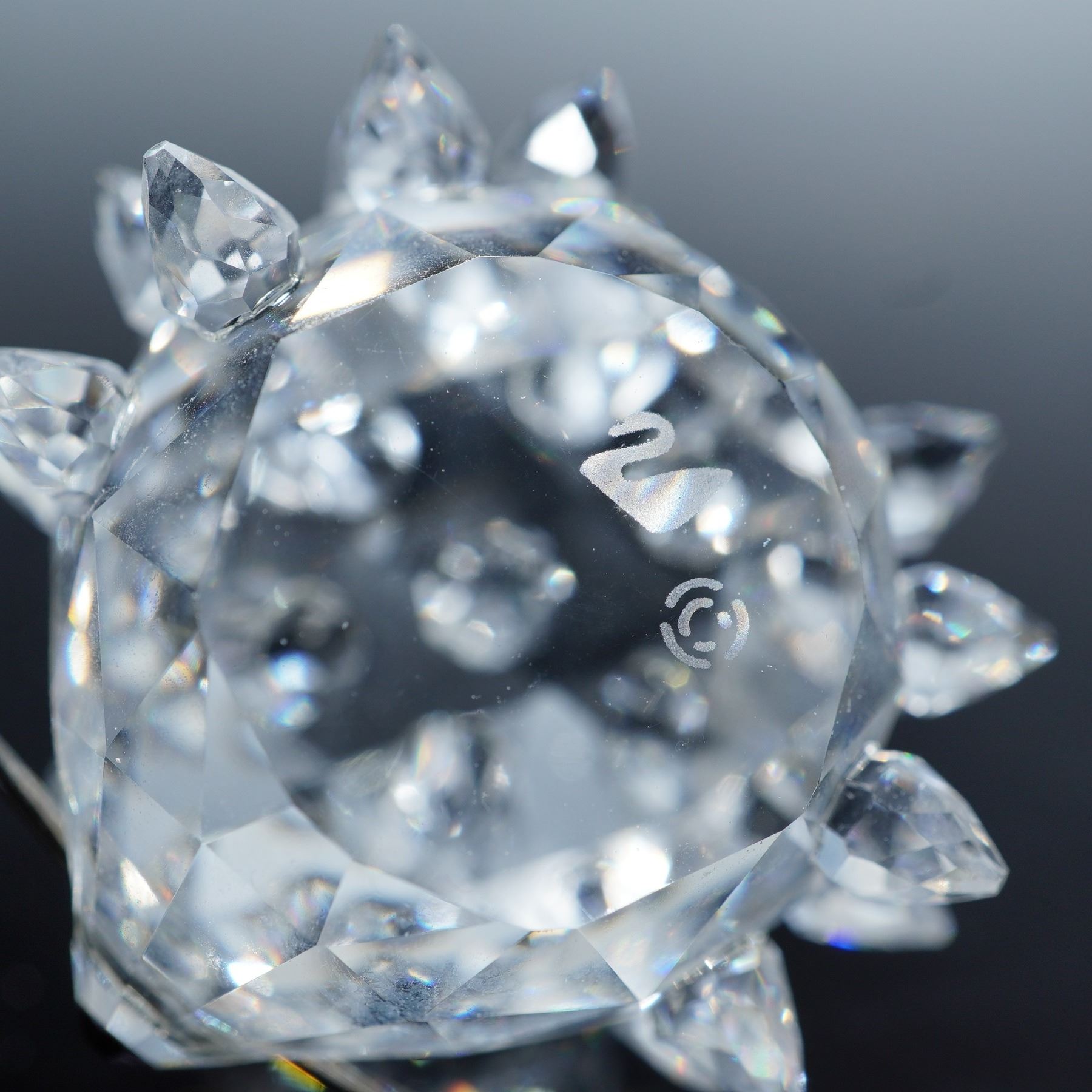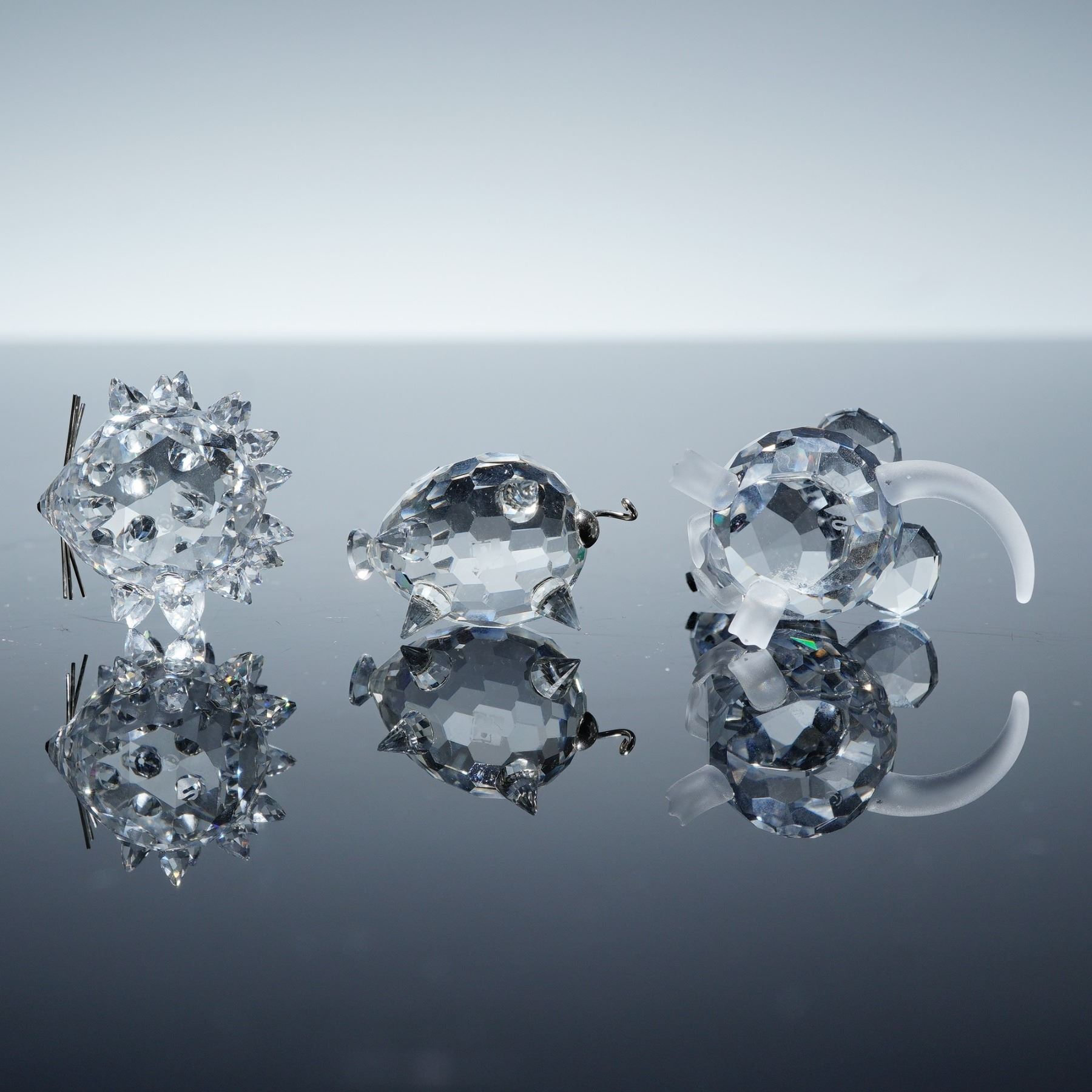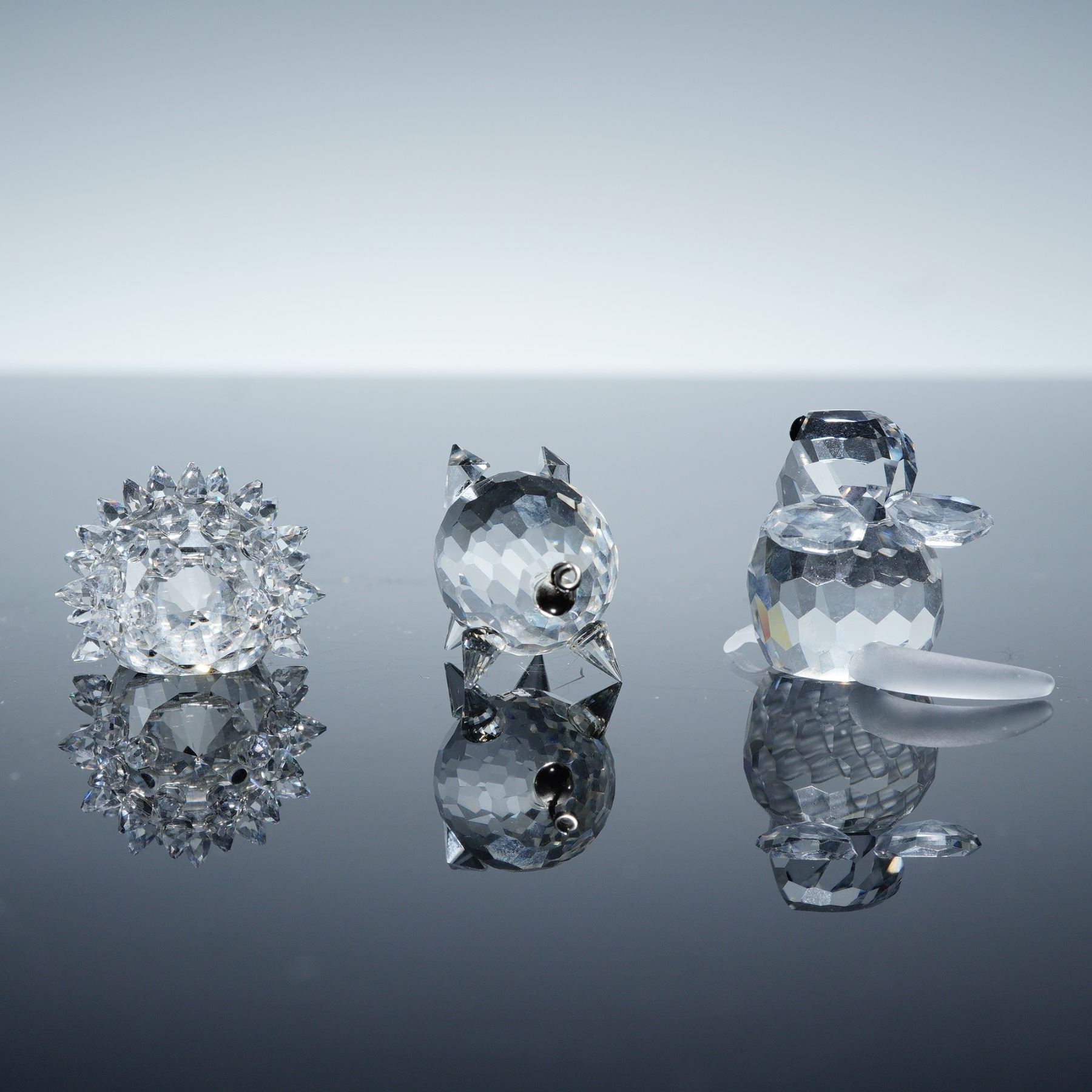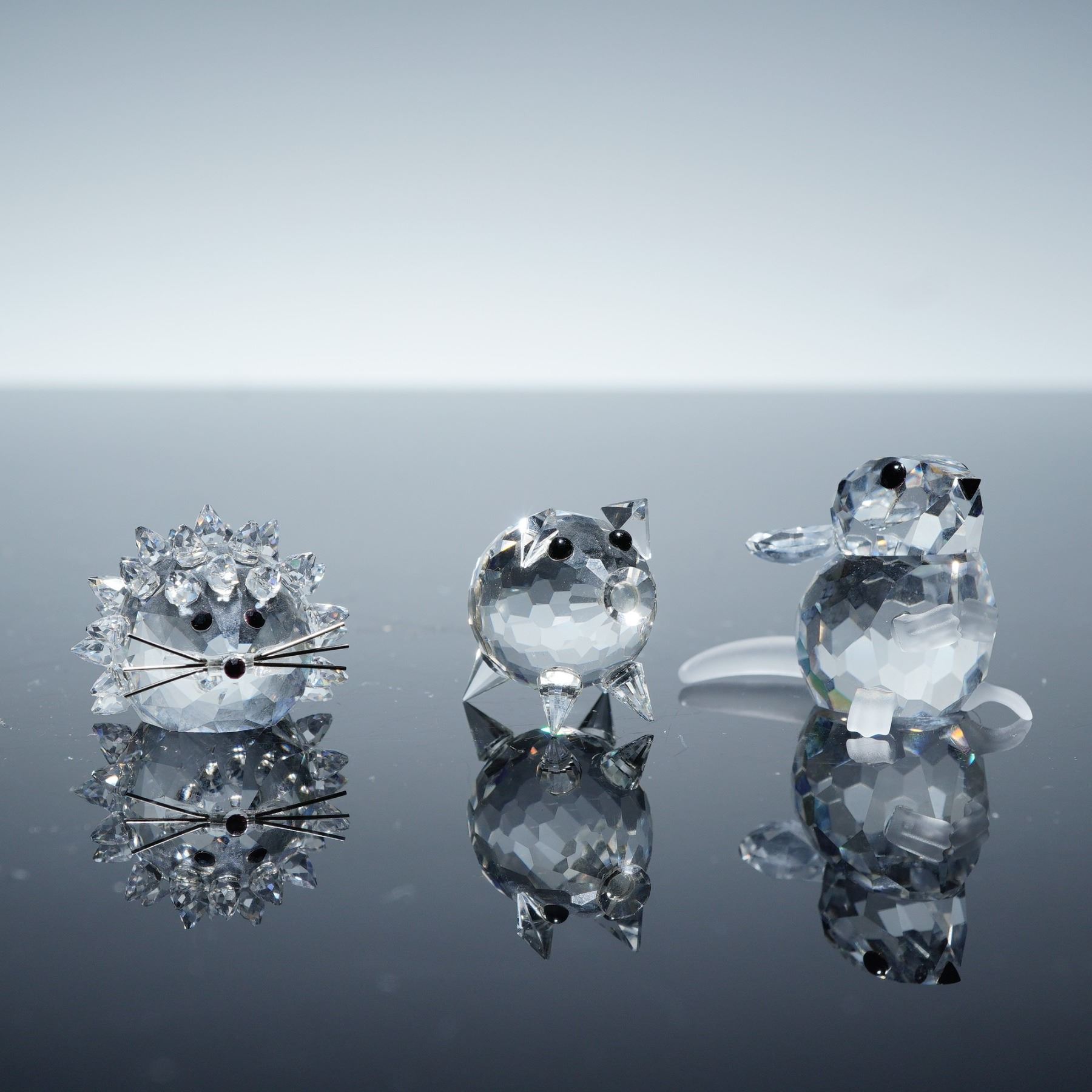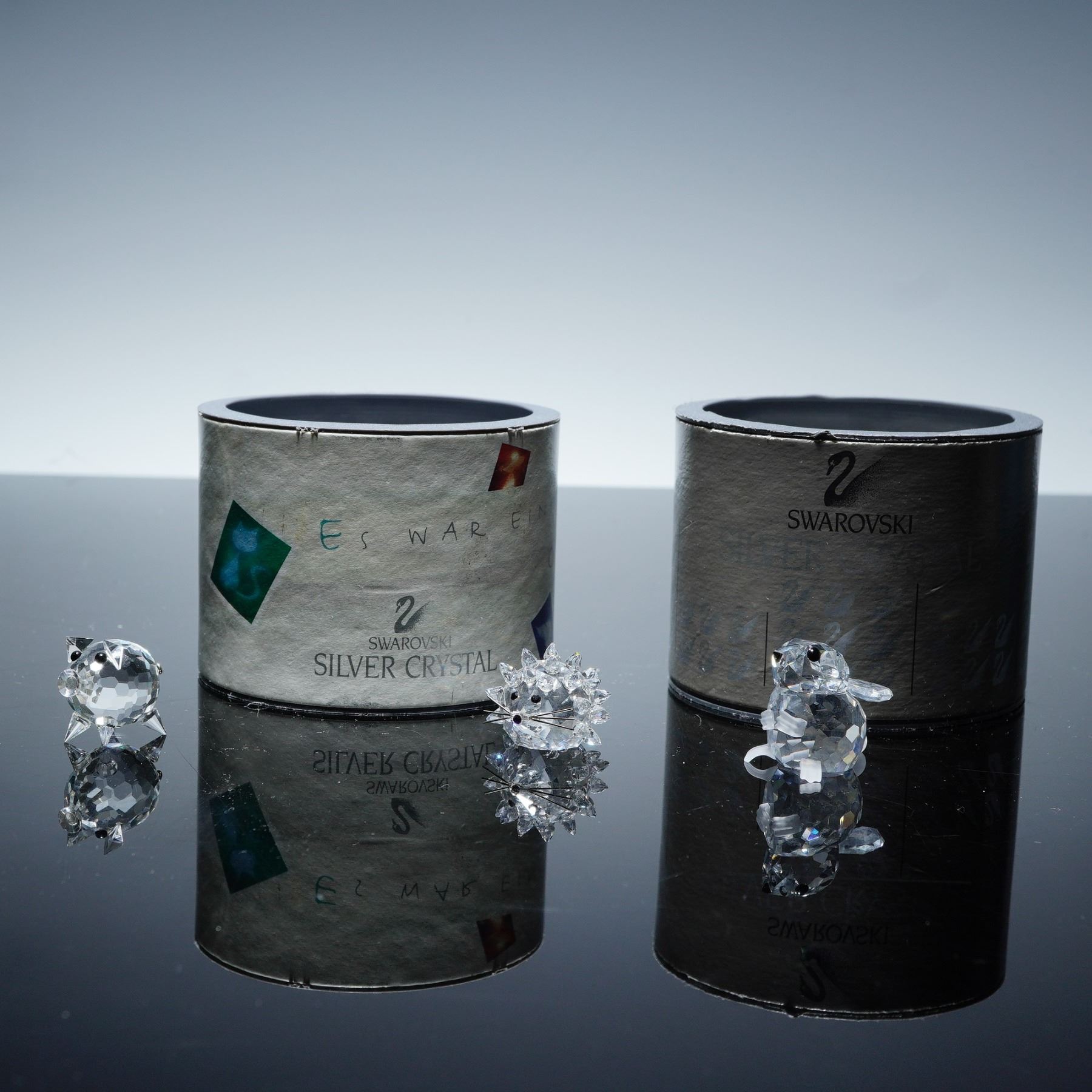 Including Field Mouse (162886), Hedgehog (183273), and Mini Pig (010028). Each piece is crafted from faceted clear crystal with jet crystal accents for the eyes and nose, capturing charming animal forms in brilliant detail. The field mouse is depicted with a rounded body, long tail, and large ears, while the hedgehog is rendered with spiky crystal detailing and delicate whiskers. The mini pig features a spherical body with pointed ears and tiny legs. Each piece bears the Swarovski swan back stamp, ensuring authenticity. Both the Field mouse and the Hedgehog have their original box.