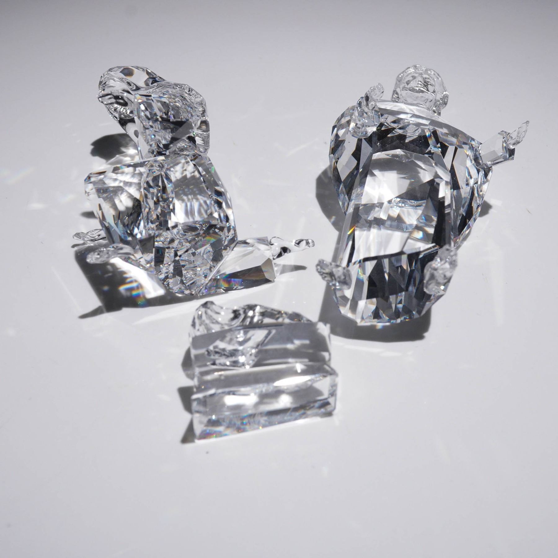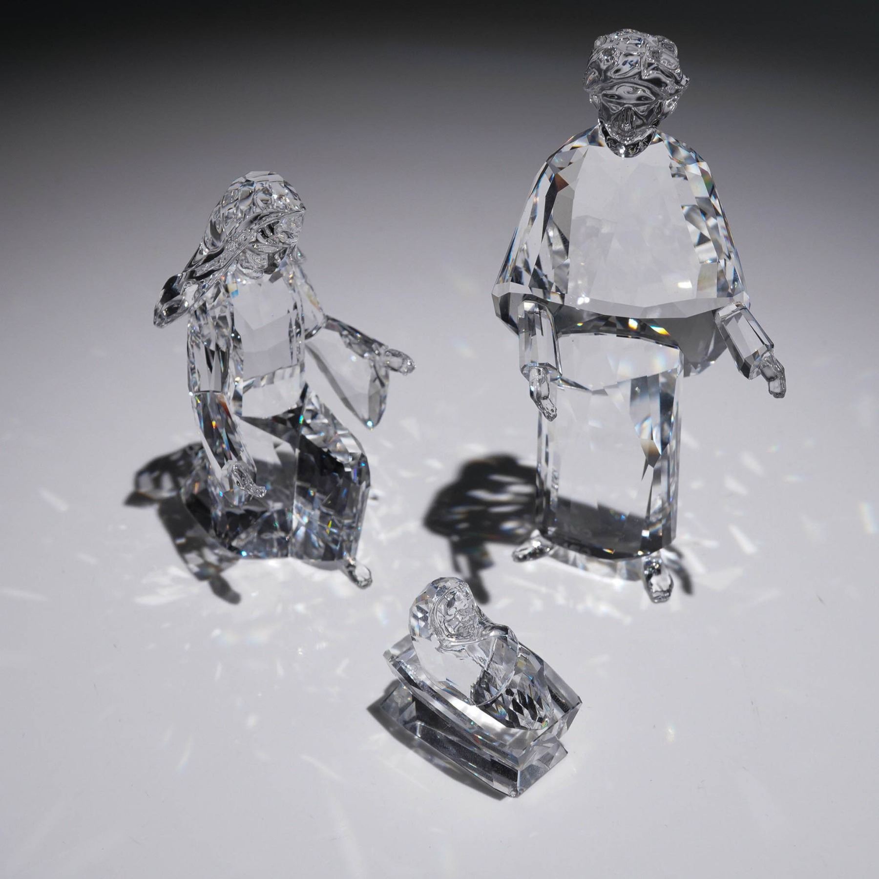 Swarovski crystal figurine set featuring Mary 5223602, Joseph 5223601, and Baby Jesus 5223604, part of the elegant Nativity Scene series. Each figurine is expertly crafted in faceted clear crystal, capturing the serenity and symbolism of the Holy Family in a timeless, modern interpretation. The sleek design highlights Swarovski's signature brilliance, making it a striking seasonal or spiritual display. Swarovski acid mark. Largest measures 2"L x 4"H. These items have their original boxes.