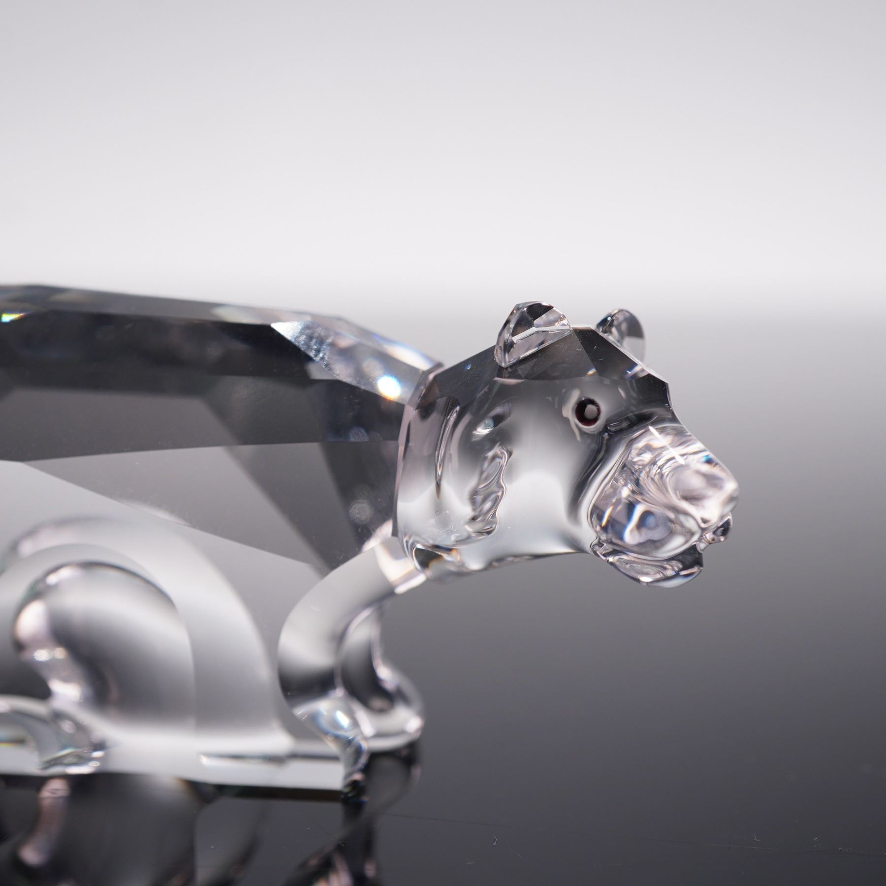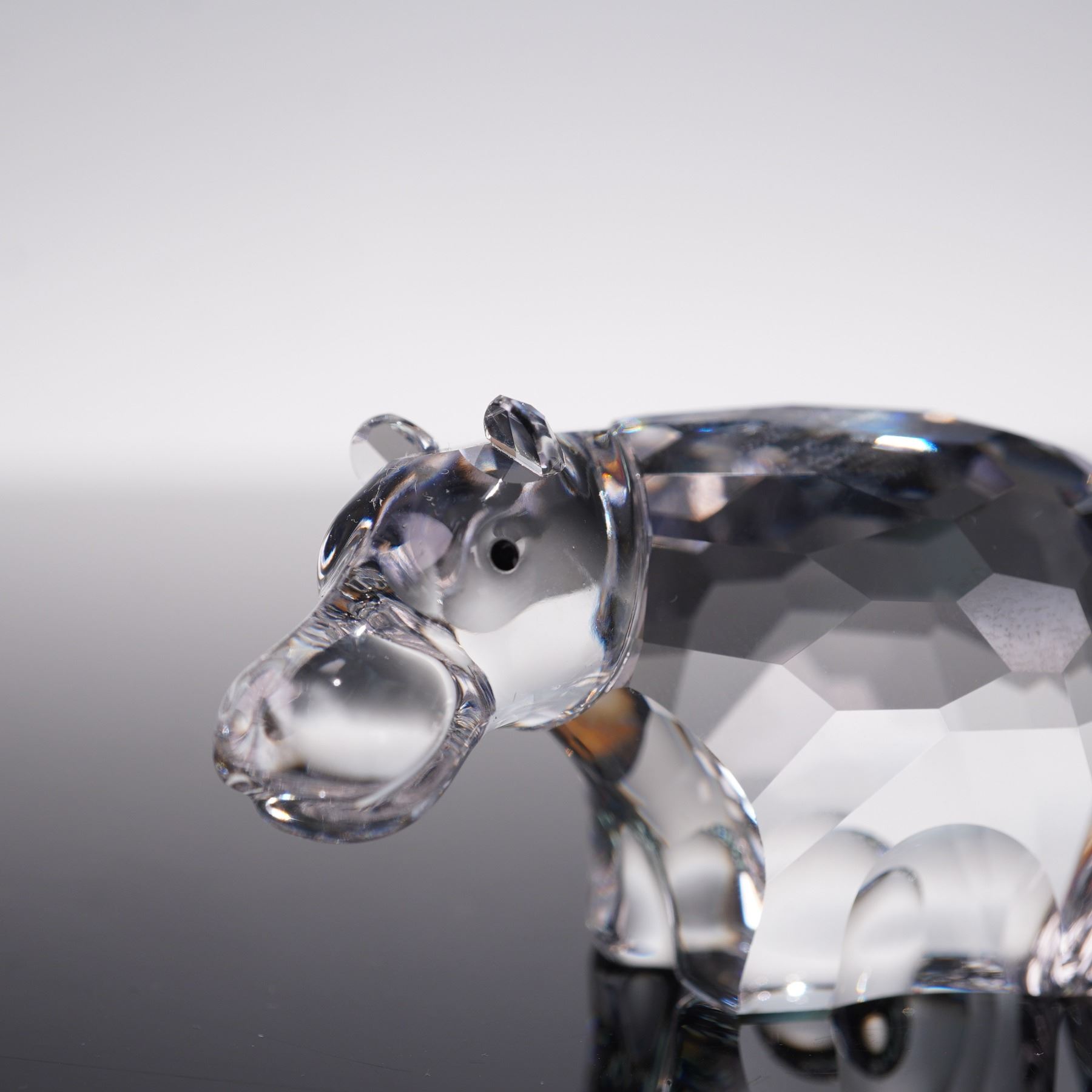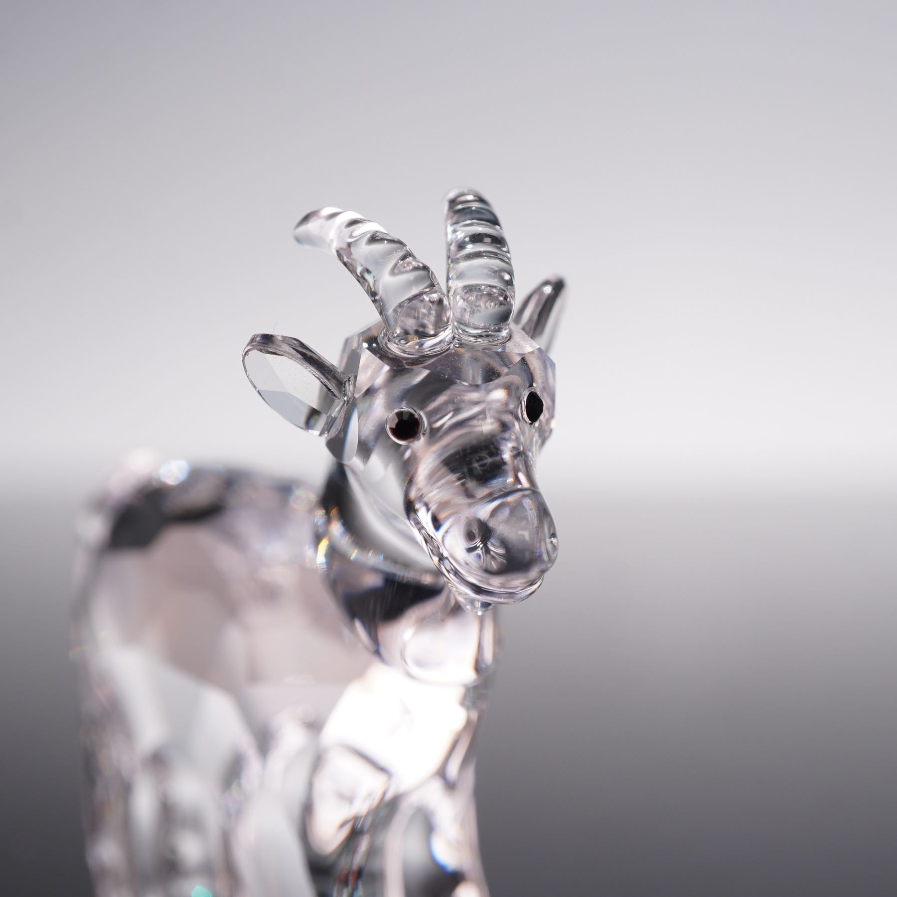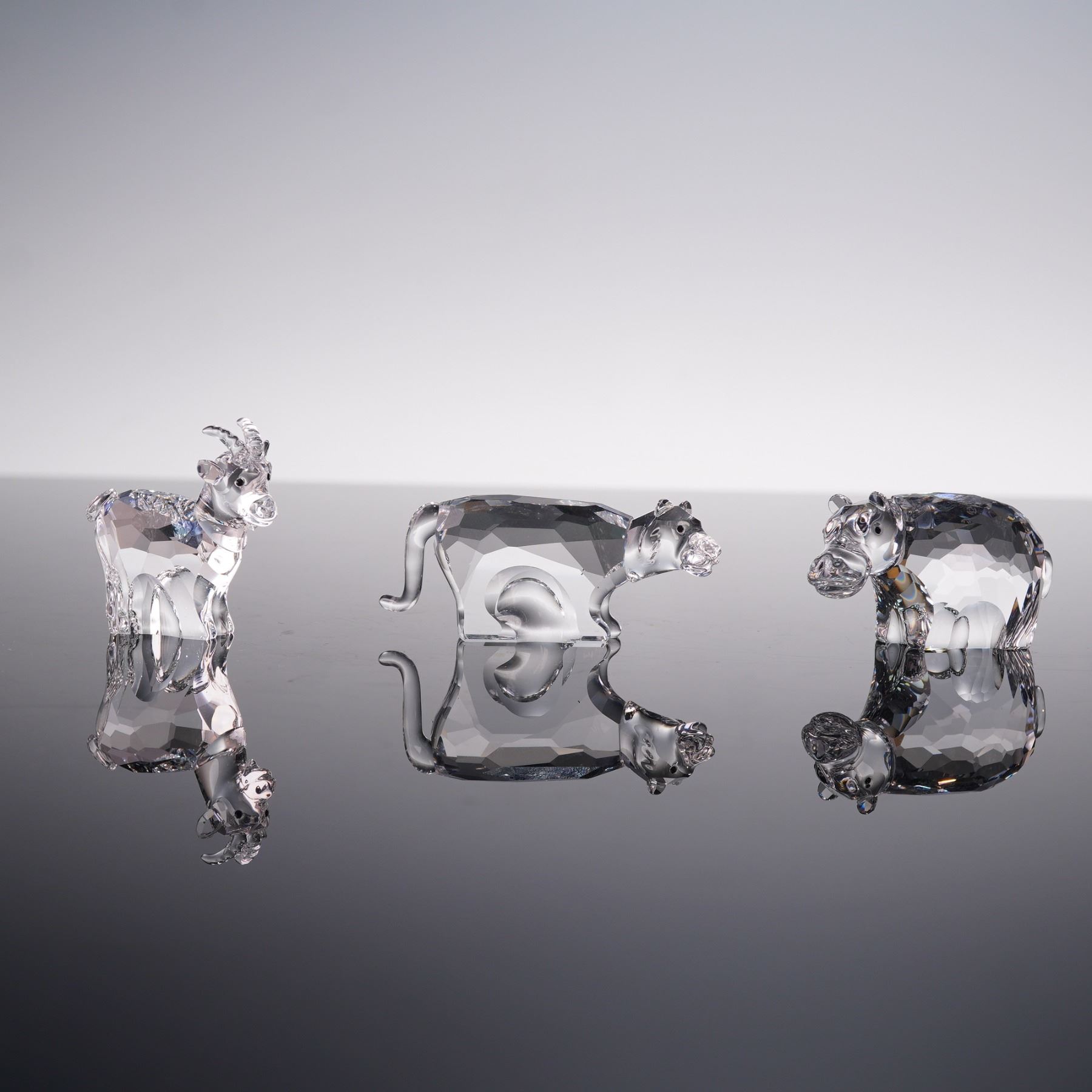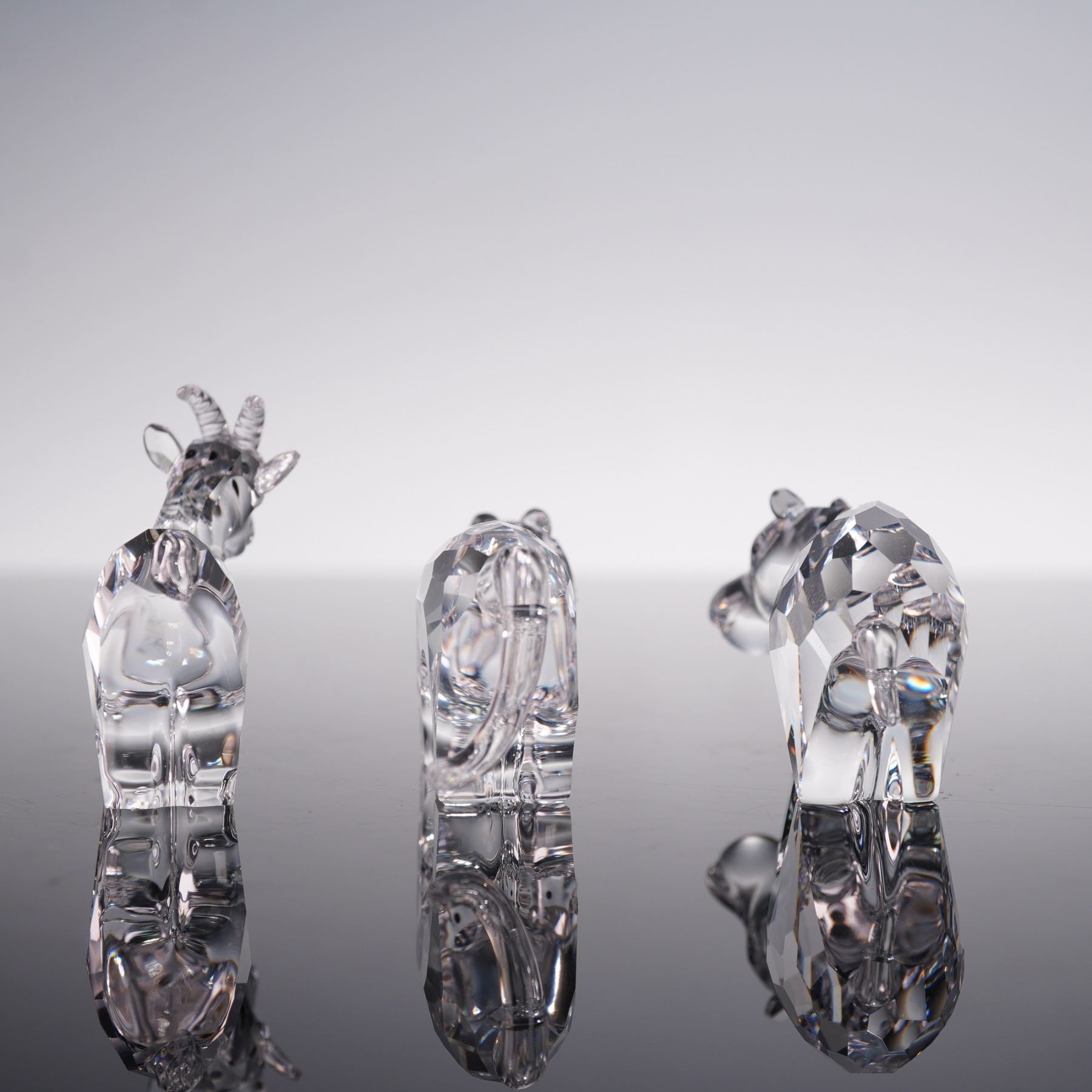 Crystal Figurines featuring three distinct animal sculptures: Tiger (model 22470), Goat (model 275438), and Hippo (model 622940). Each piece is expertly crafted from clear Swarovski crystal, showcasing precise faceting and fine details. The figures include a standing goat with textured horns, a sleek tiger with a long tail, and a rounded hippo with expressive features. Each figurine is marked with the Swarovski swan logo. This item has its original box. Tiger: 2.25"L x 0.75"W x 1"H. Goat: 1.5"L x 0.75"W x 1.5"H. Hippo: 0.75"L x 1.75"W x 1.25"H.
