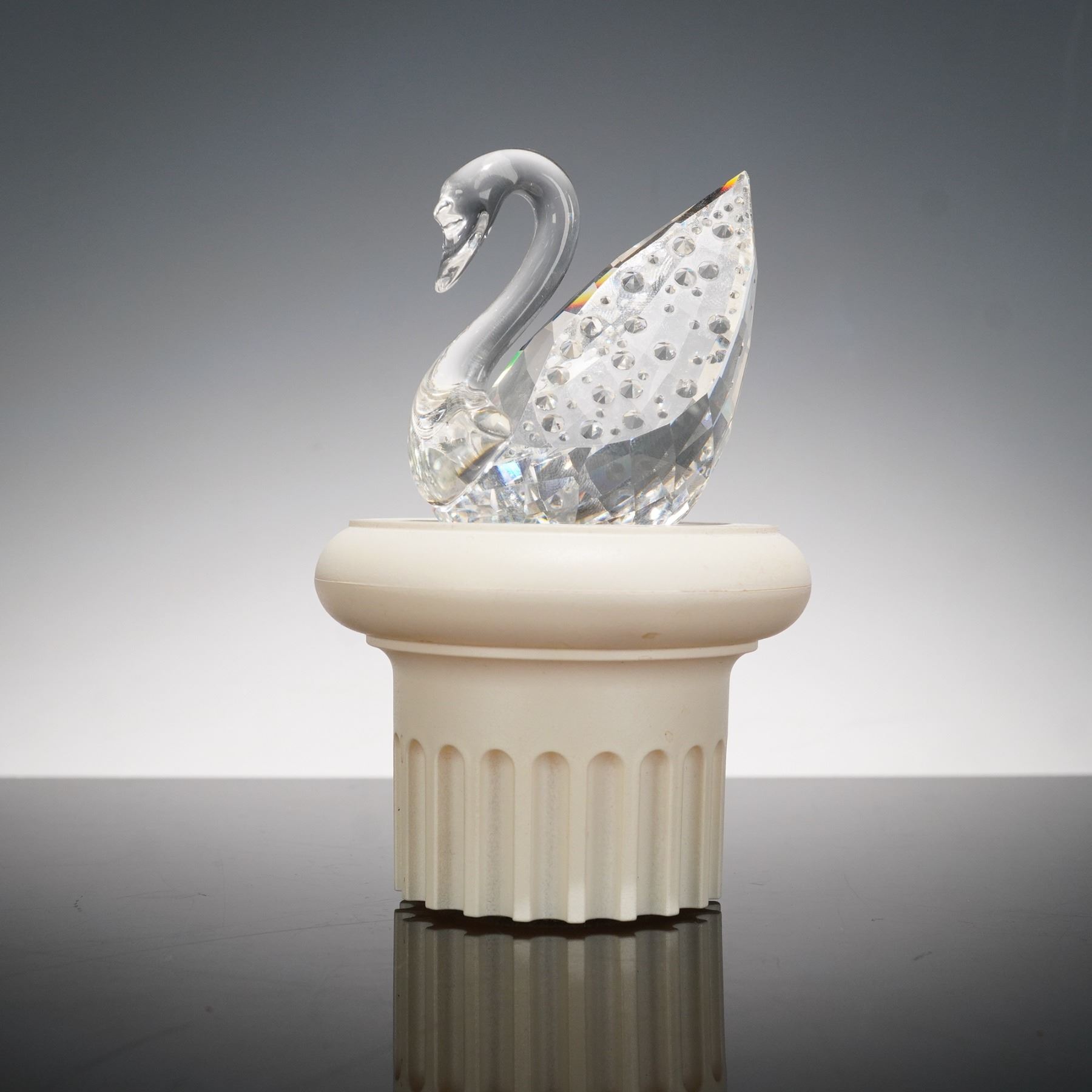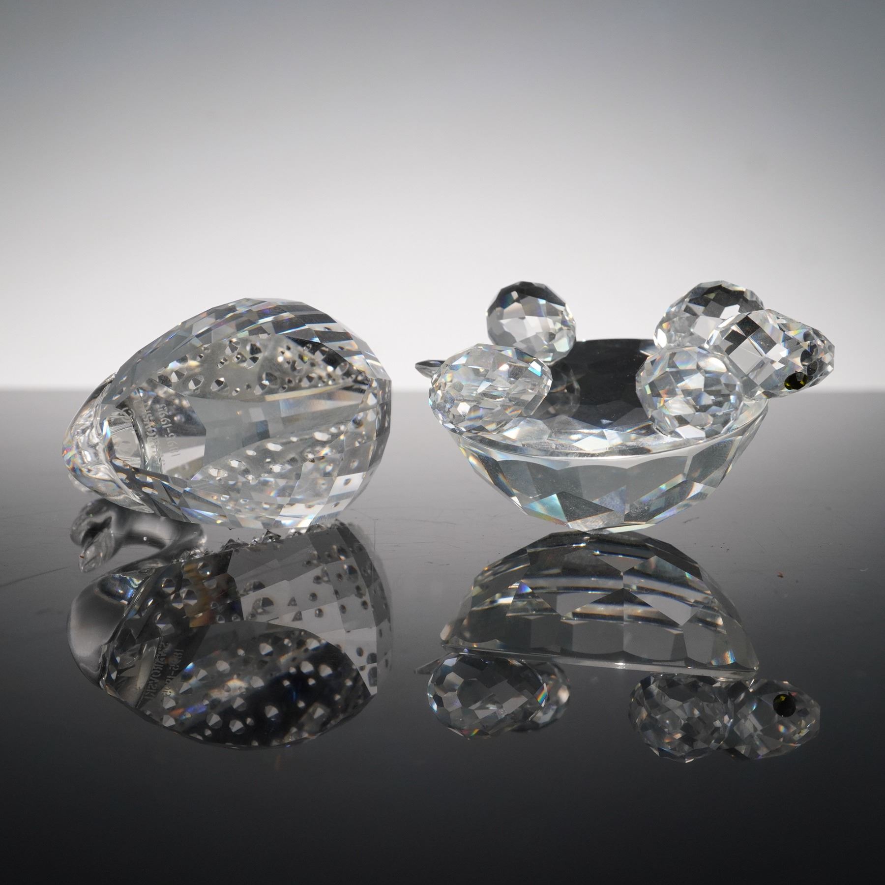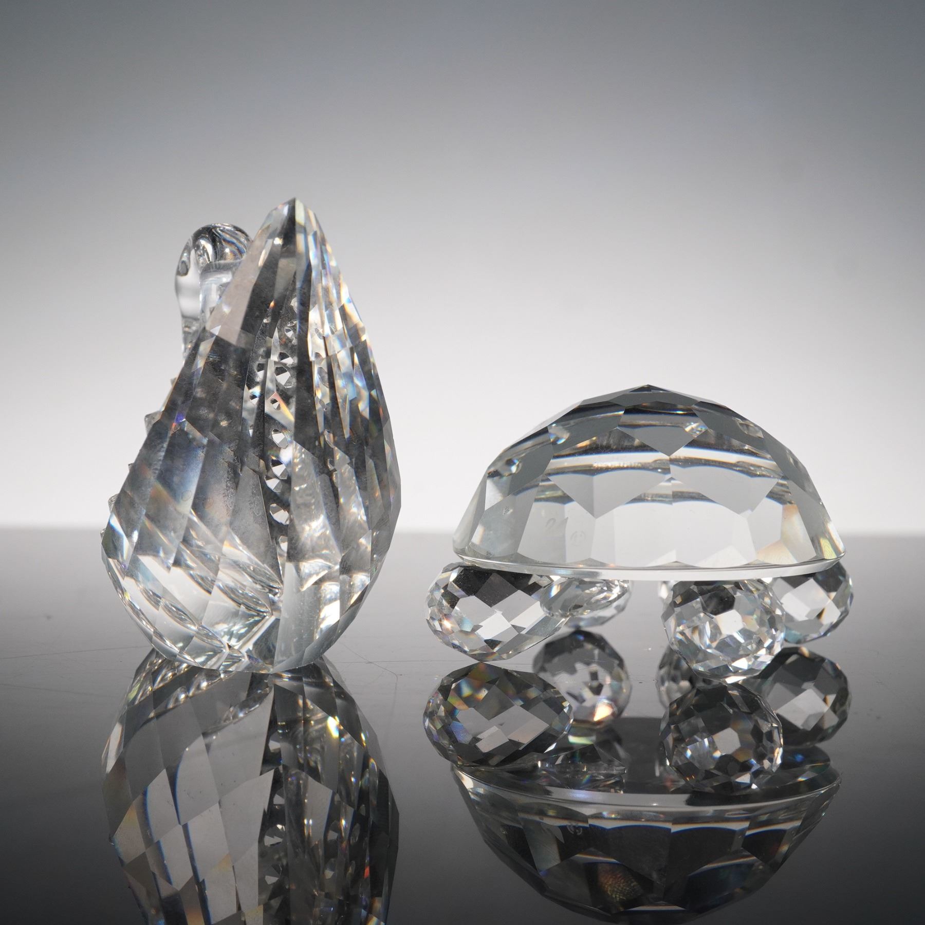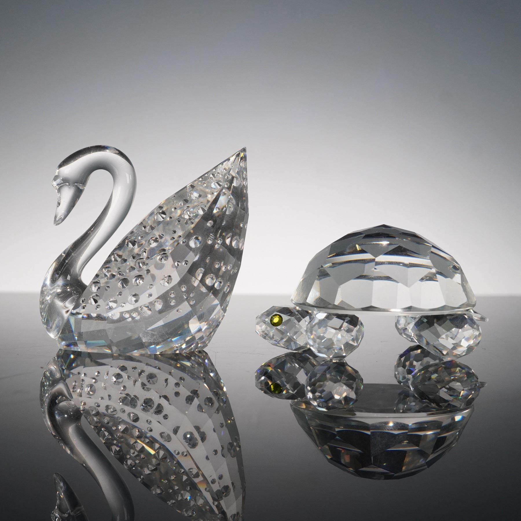 This charming Swarovski crystal duo features the Tortoise 010037 and the Centenary Swan 187407, both crafted with exquisite faceted crystal that captures and reflects light beautifully. The tortoise has a rounded shell with bright yellow eyes, while the elegant swan is adorned with delicate detailing and comes displayed on its original white pedestal base. Together they celebrate Swarovski artistry and make a striking pair for any crystal collection. Swarovski backstamp.