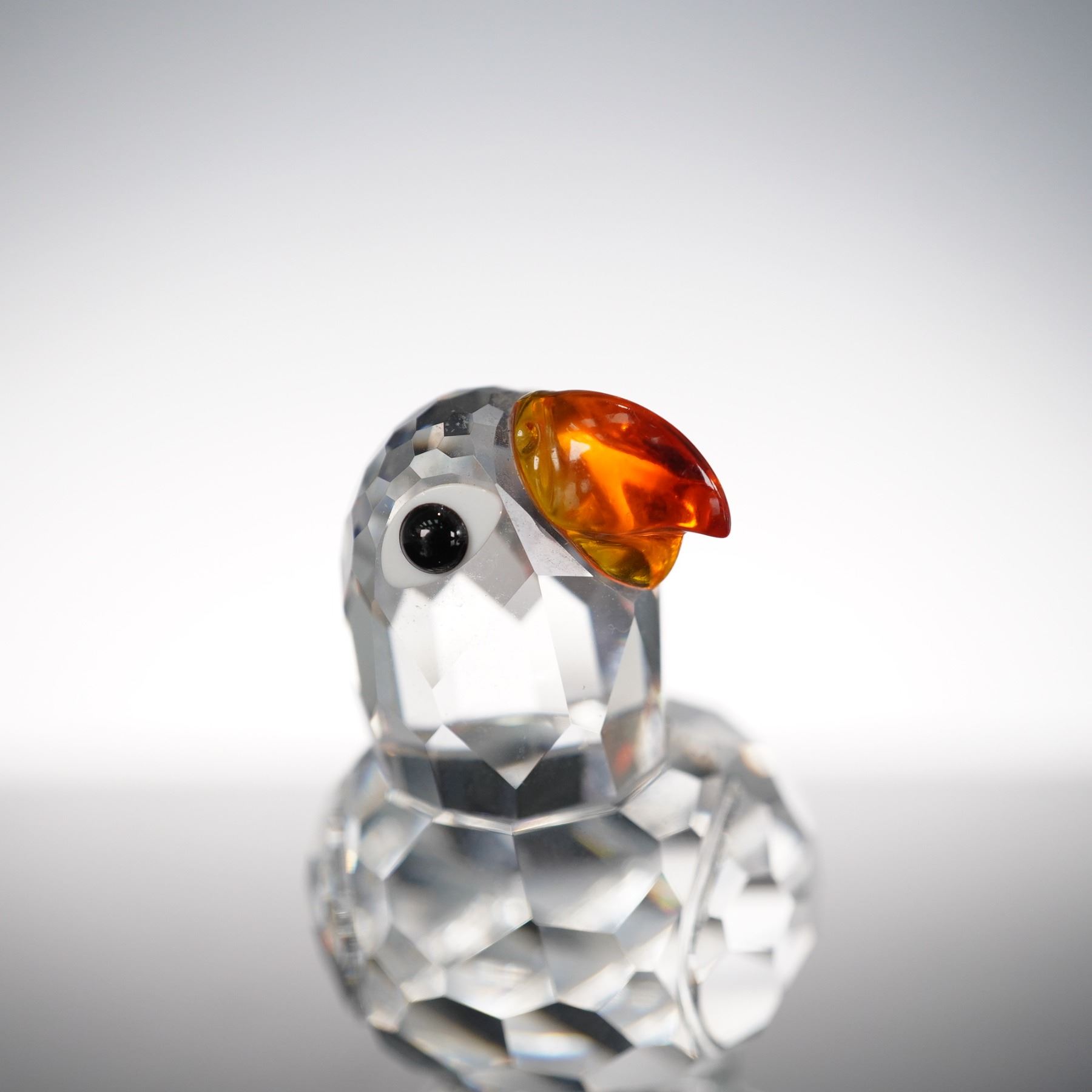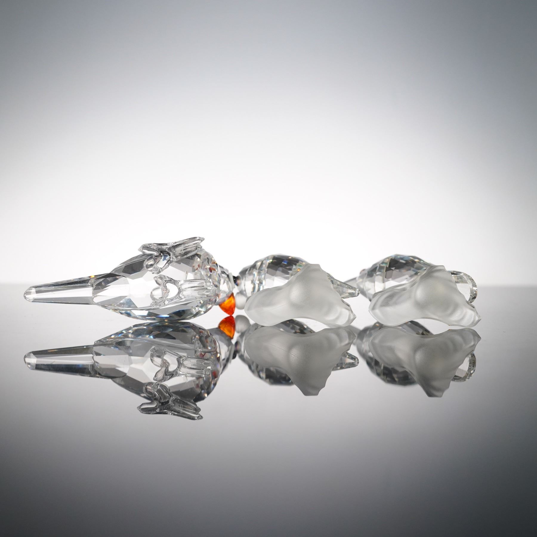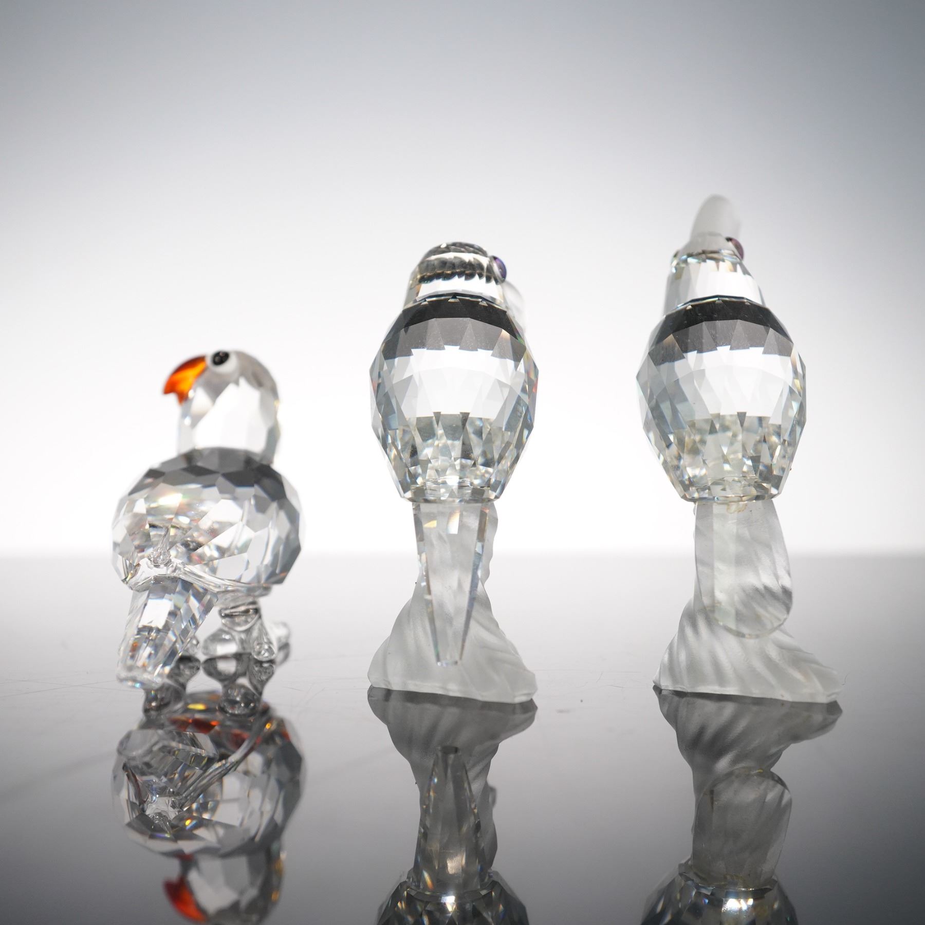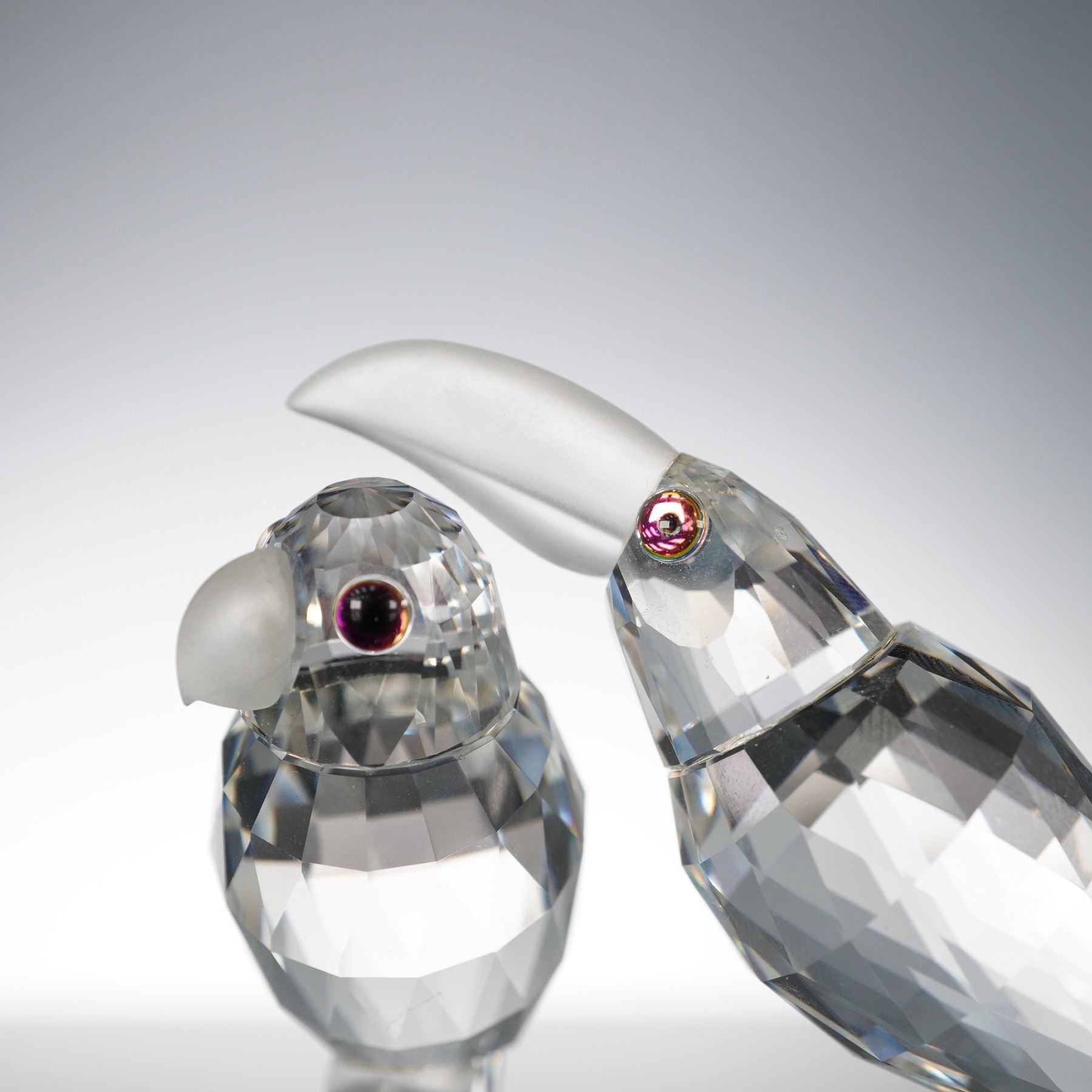 Group of three Swarovski crystal bird figurines designed by Michael Stamey, including a Toucan with frosted beak and green crystal eyes, a Parrot perched on a frosted branch with purple crystal eyes, and a Parrot with vibrant orange beak and black eyes. Each figure is crafted with precision-cut clear crystal showcasing exceptional sparkle and detail, highlighting Swarovski's artistry in capturing natural forms. 119441, 119443 & 294047.