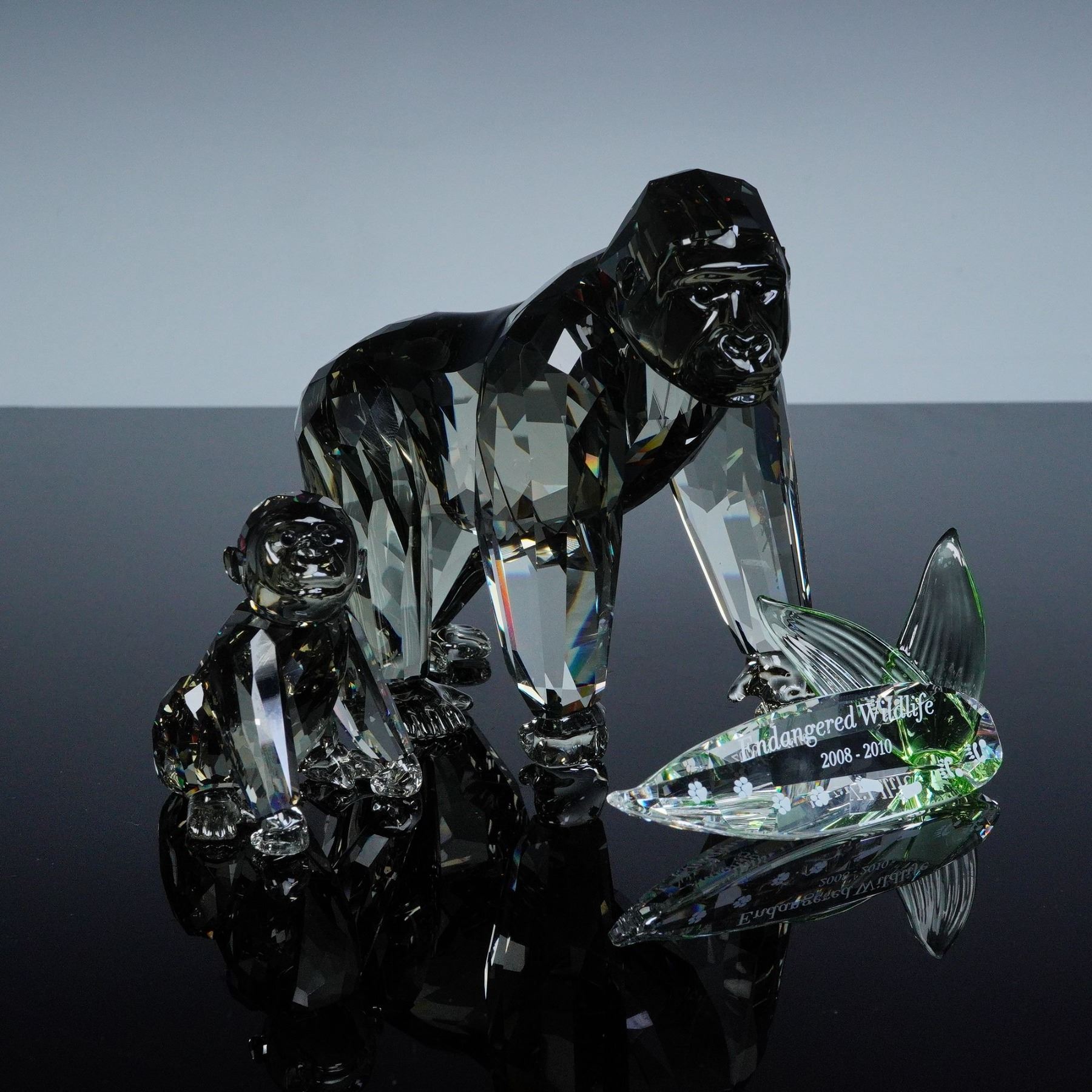 3pc Swarovski Crystal Figurines and Plaque, Gorilla Mother and Cub