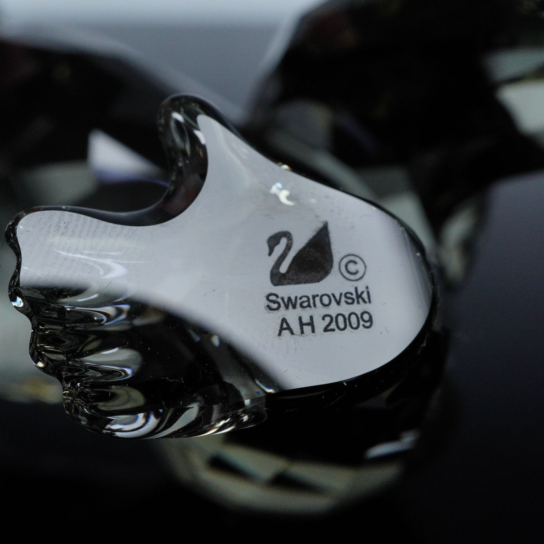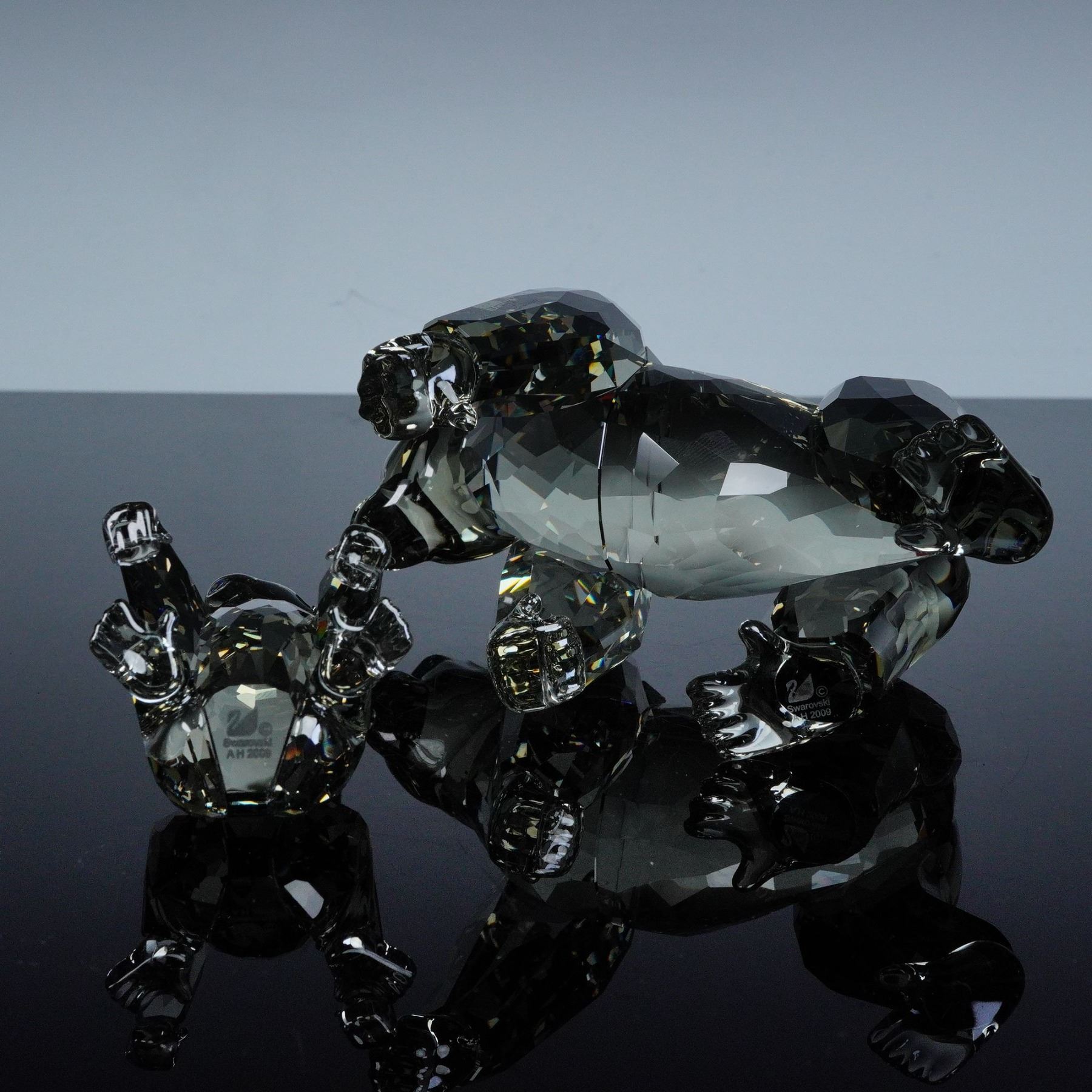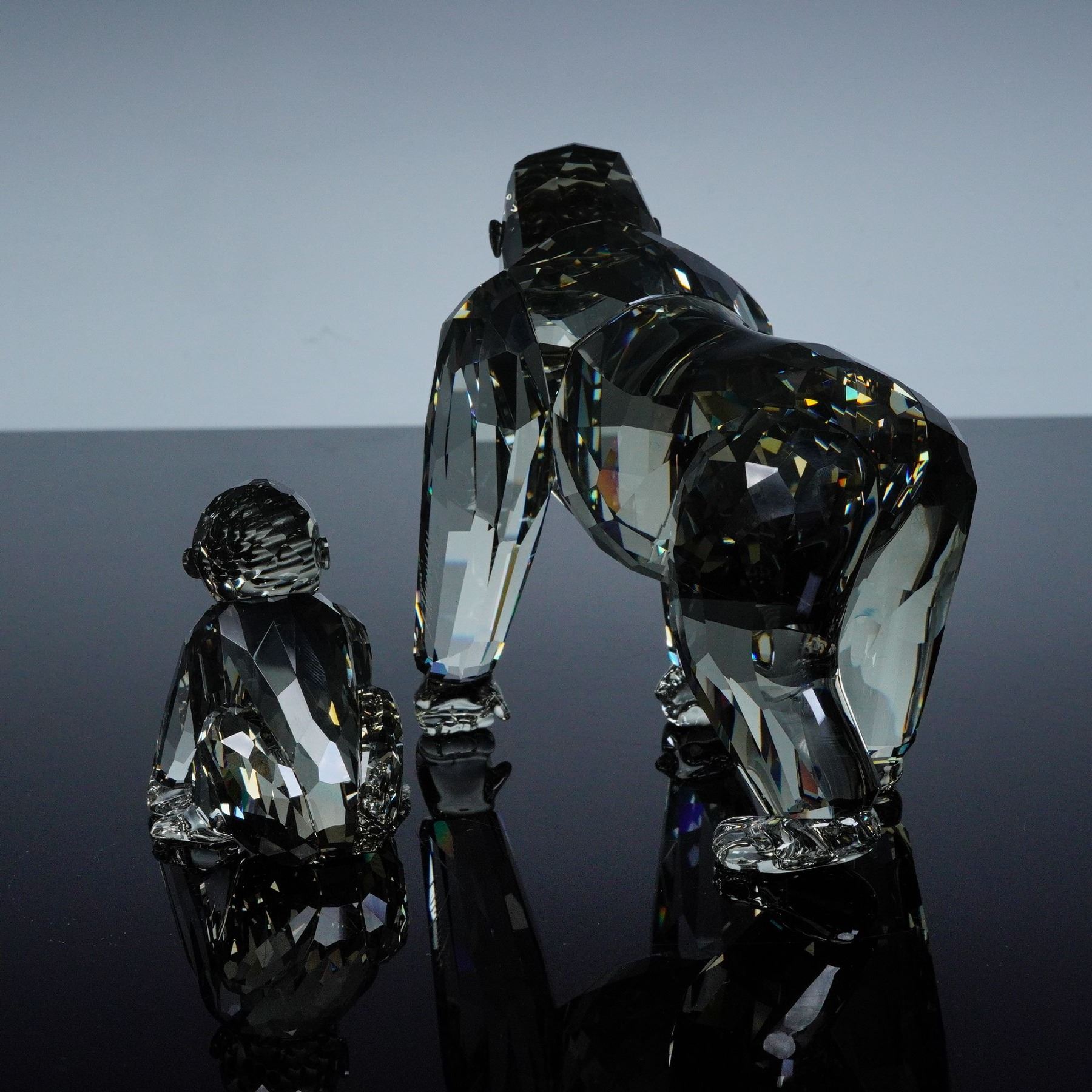 This Swarovski crystal set features the Gorillas Mother and Cub 952504 along with the Endangered Wildlife plaque 906929. The gorillas are rendered in rich smoky crystal with precise facets that bring depth and realism to their forms. The mother stands protectively beside her cub, her stance calm and powerful, while the young gorilla sits gazing upward with lifelike expression. Their reflective surfaces capture subtle tones of gray and amber under the light. The matching plaque features bright green crystal leaves and is engraved Endangered Wildlife 2008 - 2010 with delicate paw prints along its base, creating a graceful and unified display. Swarovski backstamp. This item has its original box. Certificate of Authenticity included. Largest box measures: 9"L x 8.75"W x 5.25"H.
