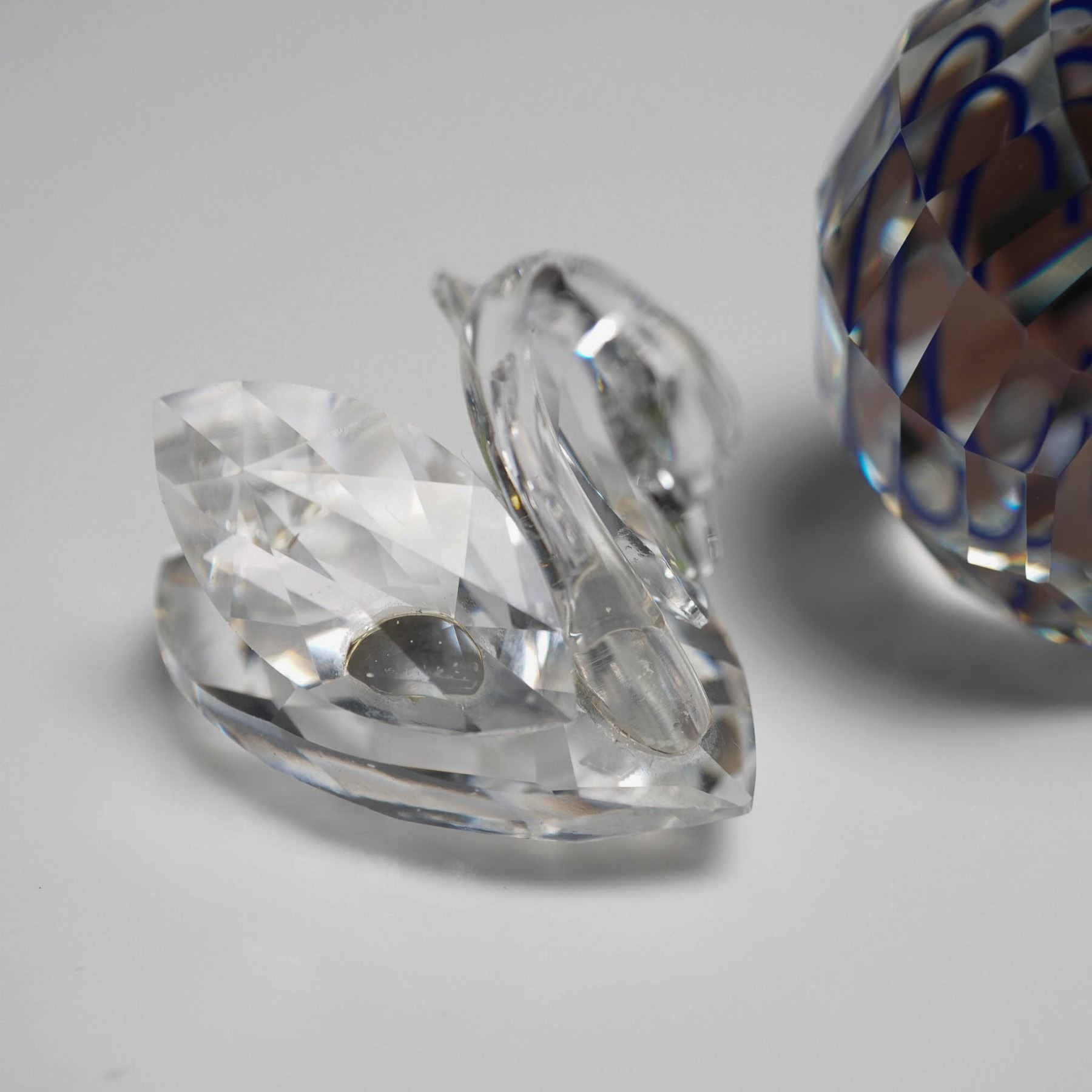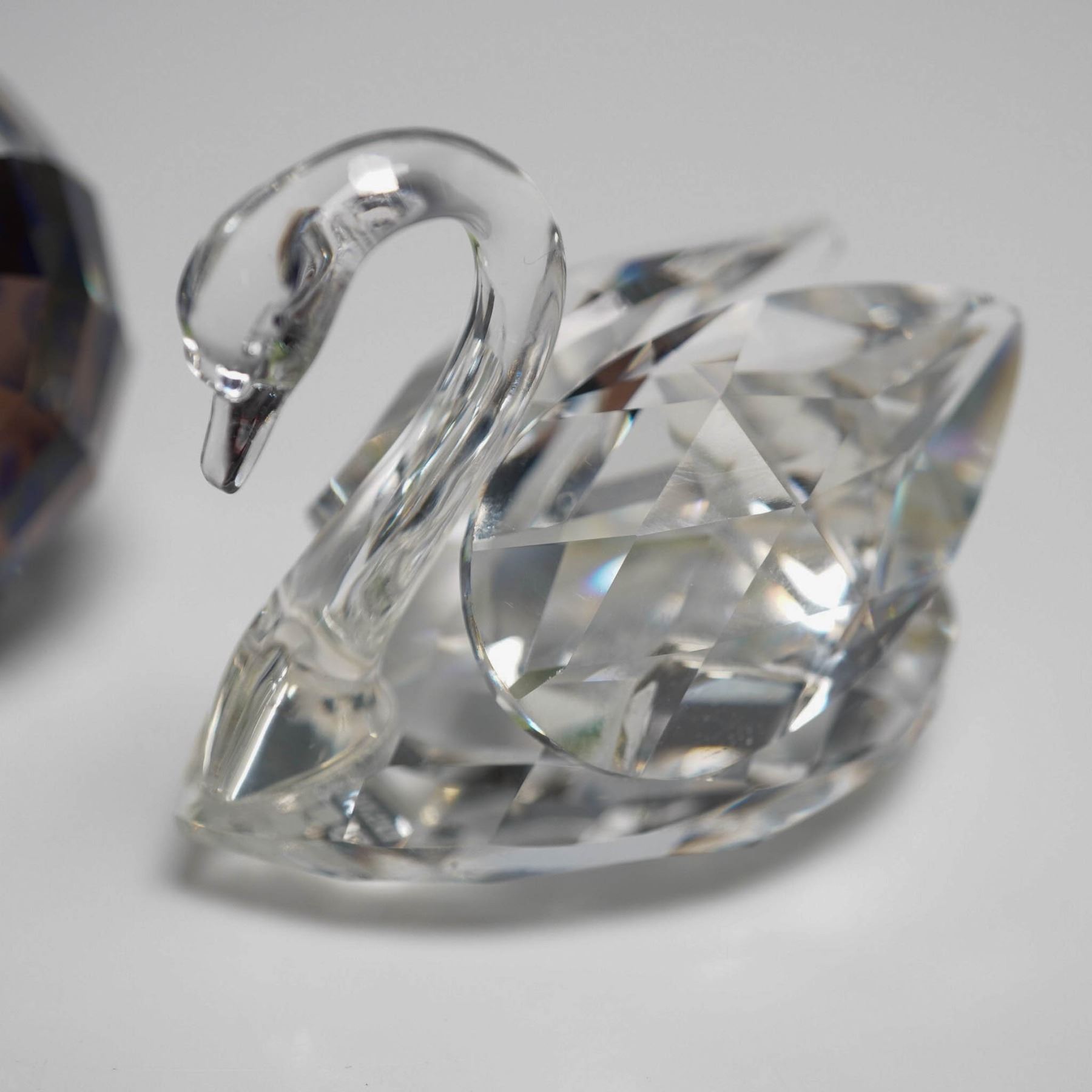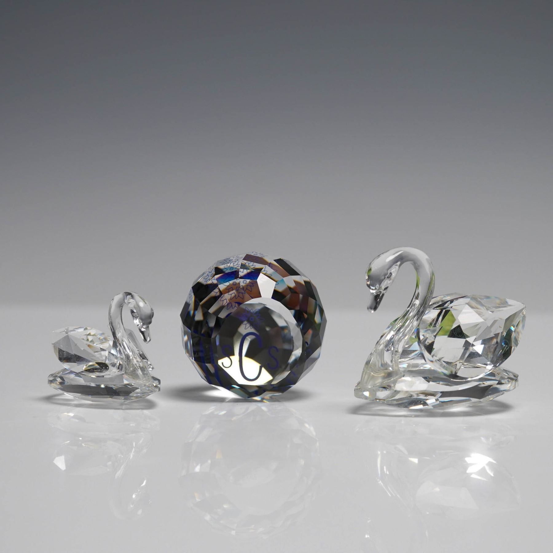 A Swarovski Silver Crystal grouping featuring three pieces: a large swan figurine with outstretched neck and faceted body, a smaller swan figurine, and a faceted crystal paperweight etched with the Swarovski SCS logo and signed on the base. All pieces are crafted in clear Swarovski crystal with precision-cut facets for maximum brilliance. Includes one original Swarovski Silver Crystal box.