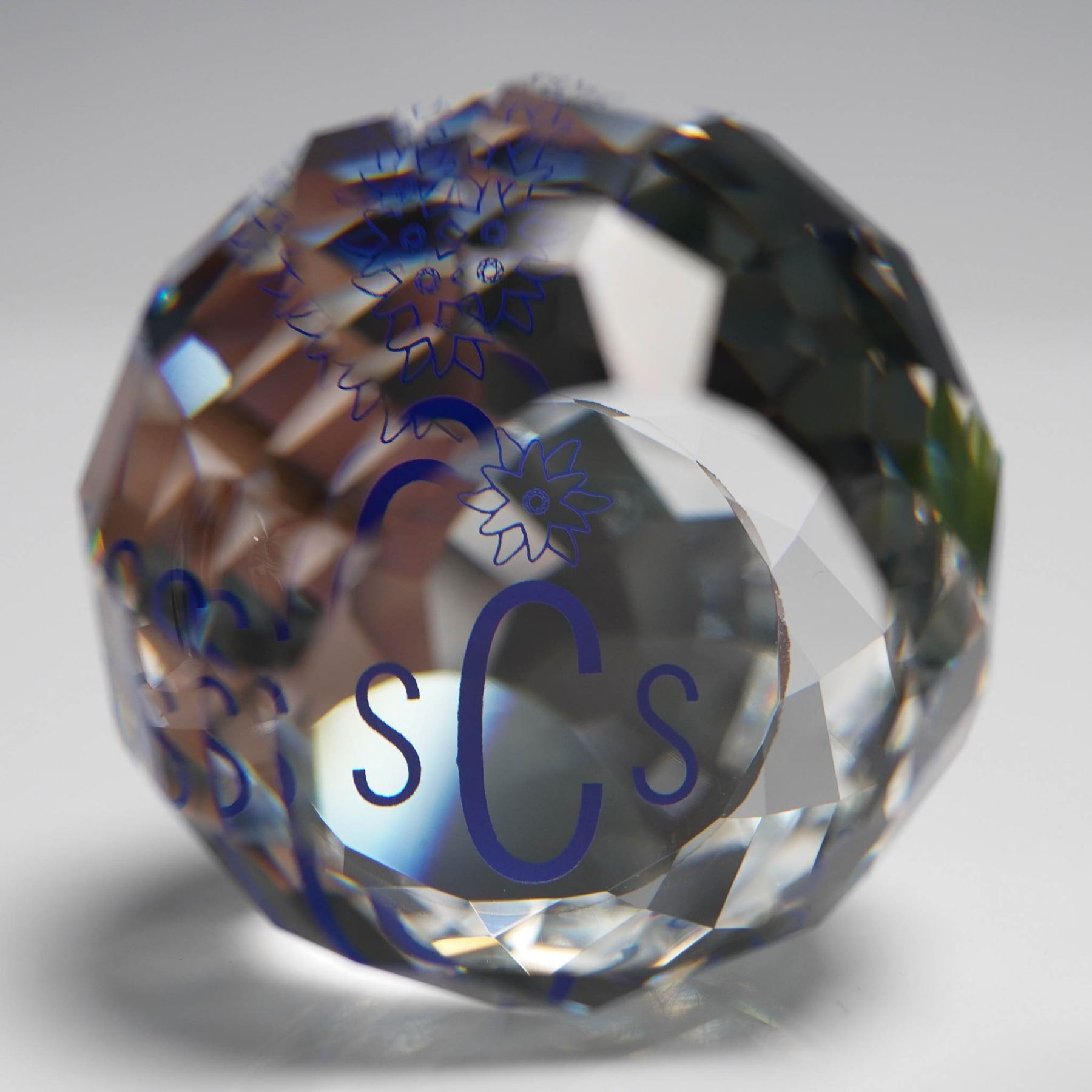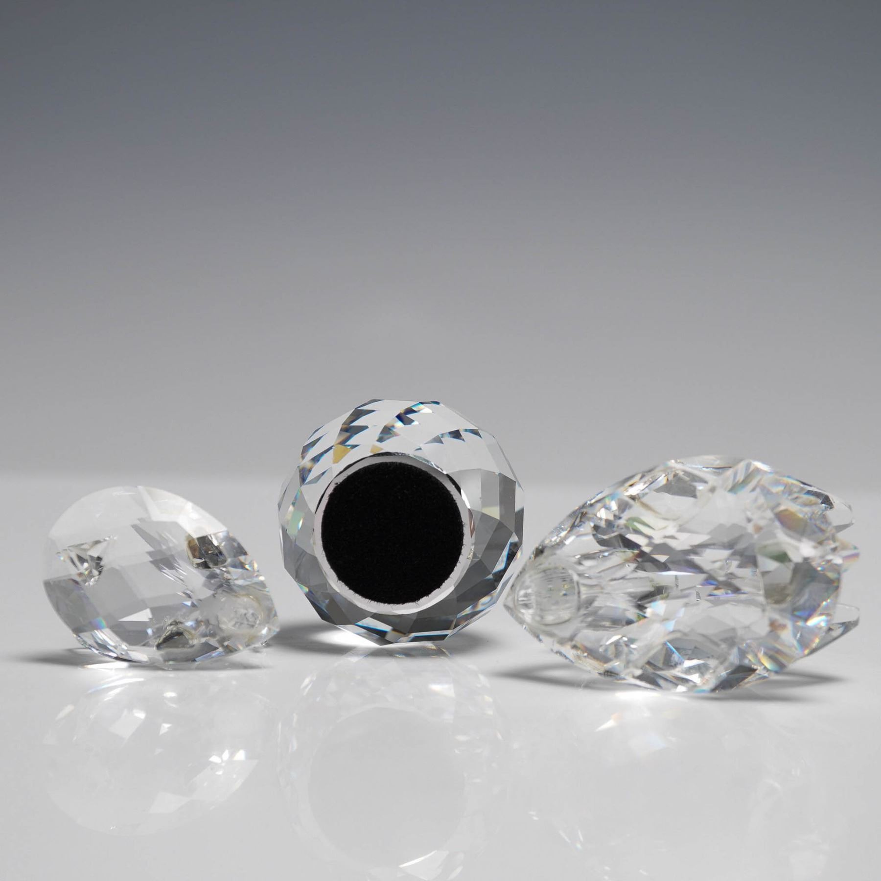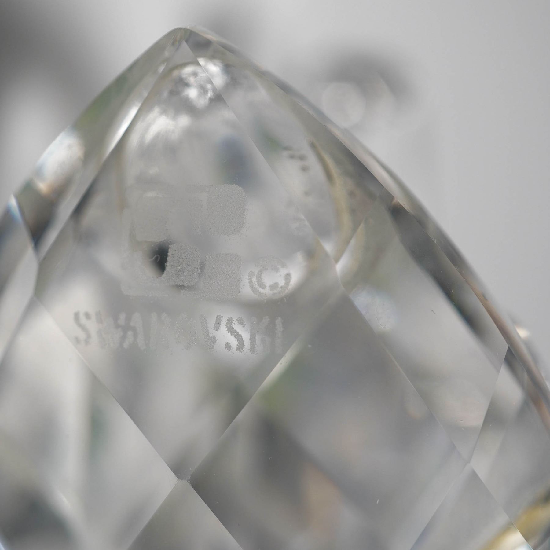 A Swarovski Silver Crystal grouping featuring three pieces: a large swan figurine with outstretched neck and faceted body, a smaller swan figurine, and a faceted crystal paperweight etched with the Swarovski SCS logo and signed on the base. All pieces are crafted in clear Swarovski crystal with precision-cut facets for maximum brilliance. Includes one original Swarovski Silver Crystal box.