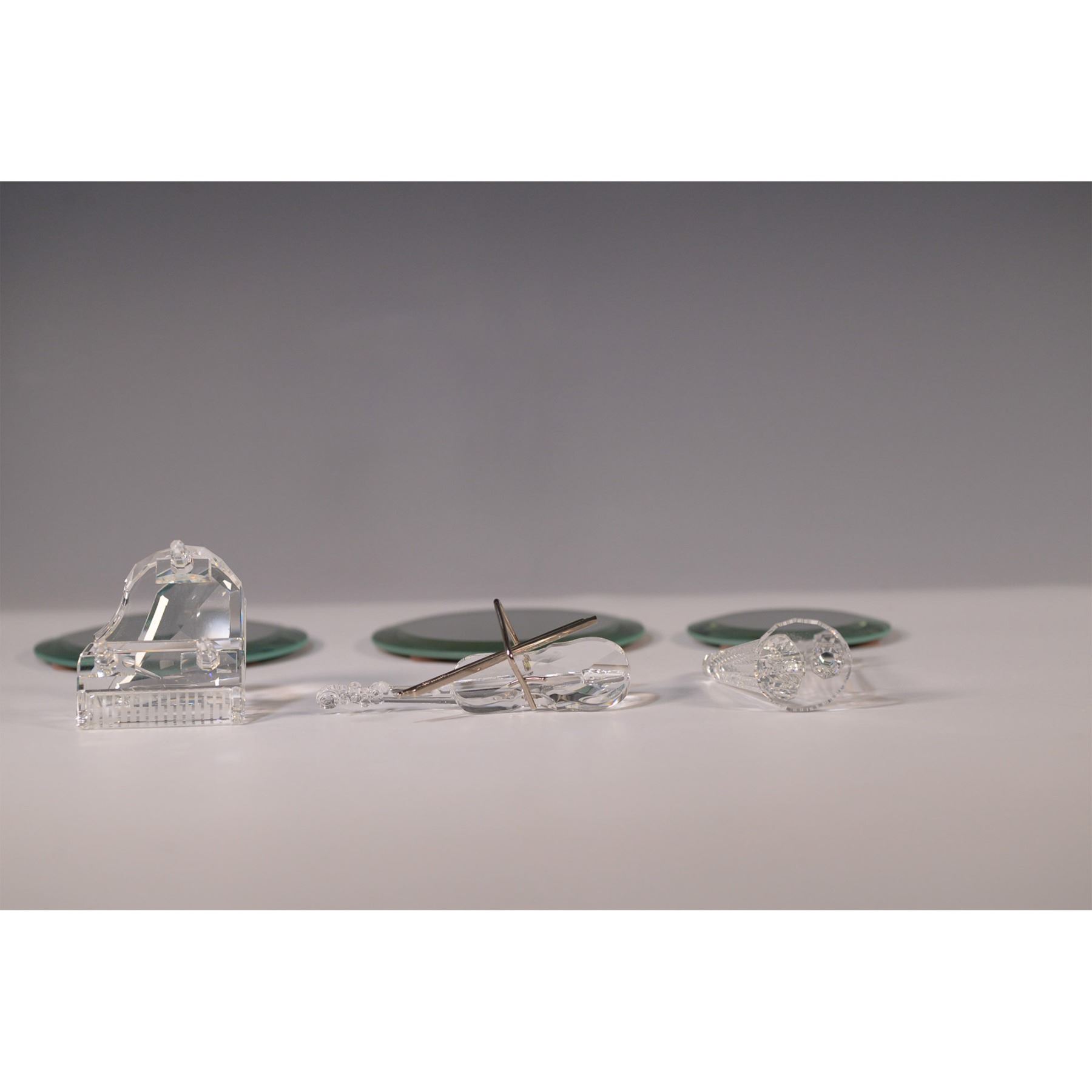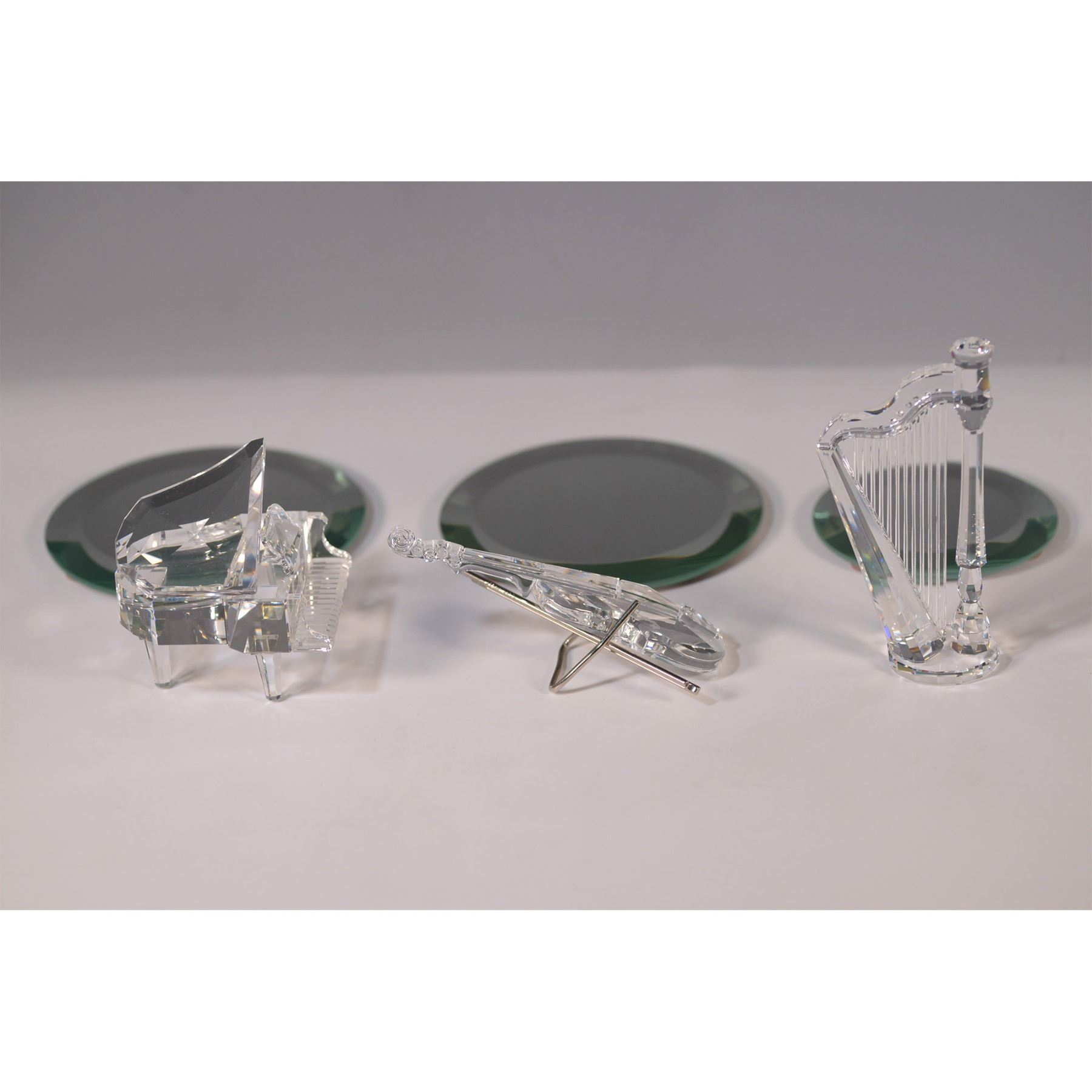A stunning set of three Swarovski crystal musical instrument figurines, featuring a grand piano, a violin with a bow, and a harp. Each piece is intricately crafted with fine detailing and rests on a round mirrored base. The largest figurine measures 4"H, while the largest base is 4" in diameter. The set comes with its original Swarovski Silver Crystal box, measuring 4.5"H. Each piece bears the Swarovski backstamp, ensuring authenticity. A remarkable addition to any Swarovski collection.