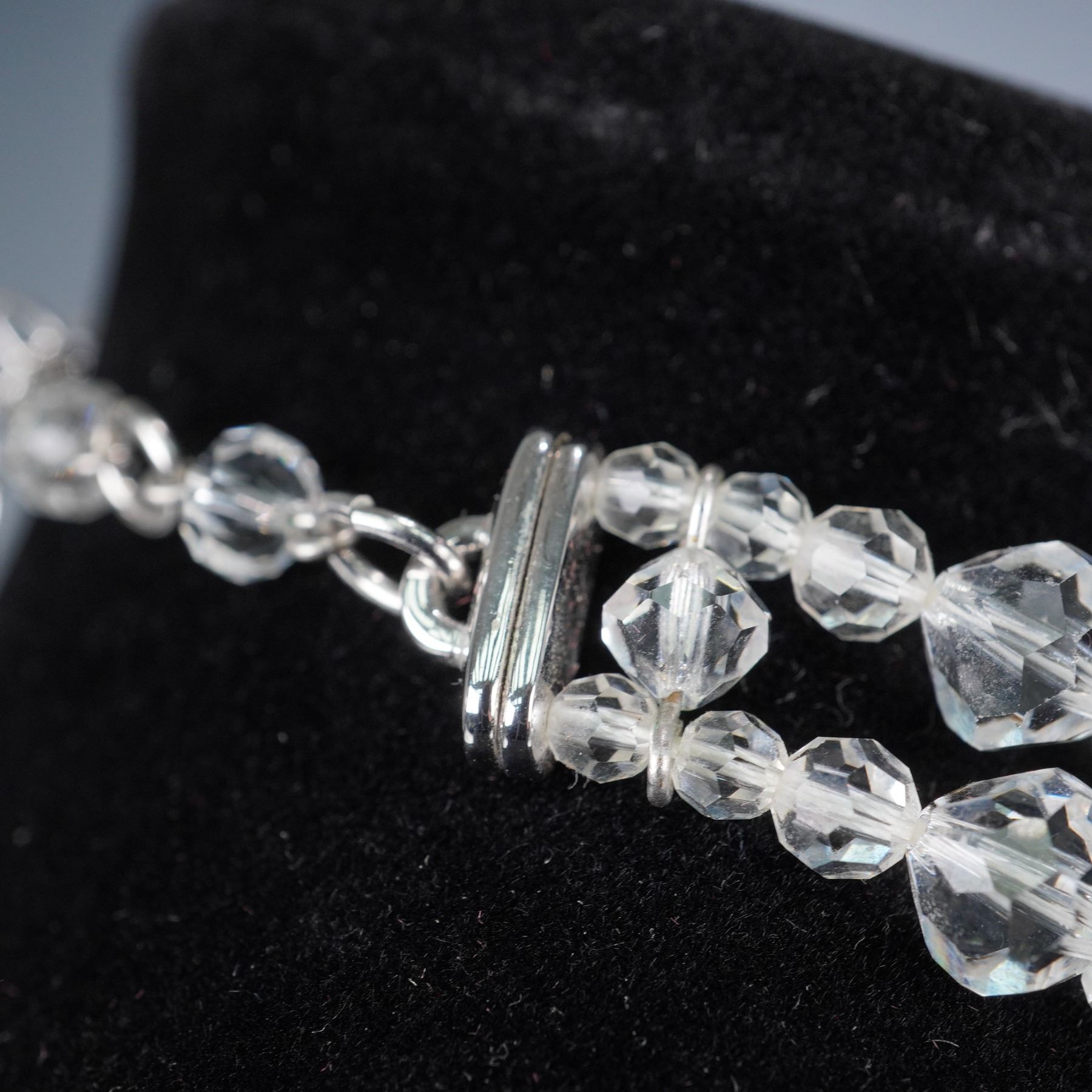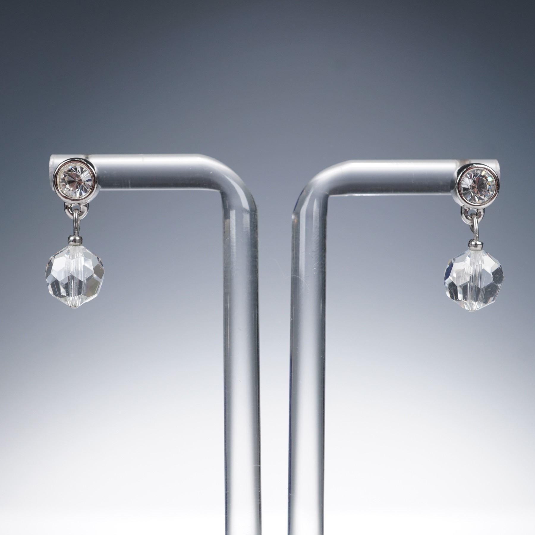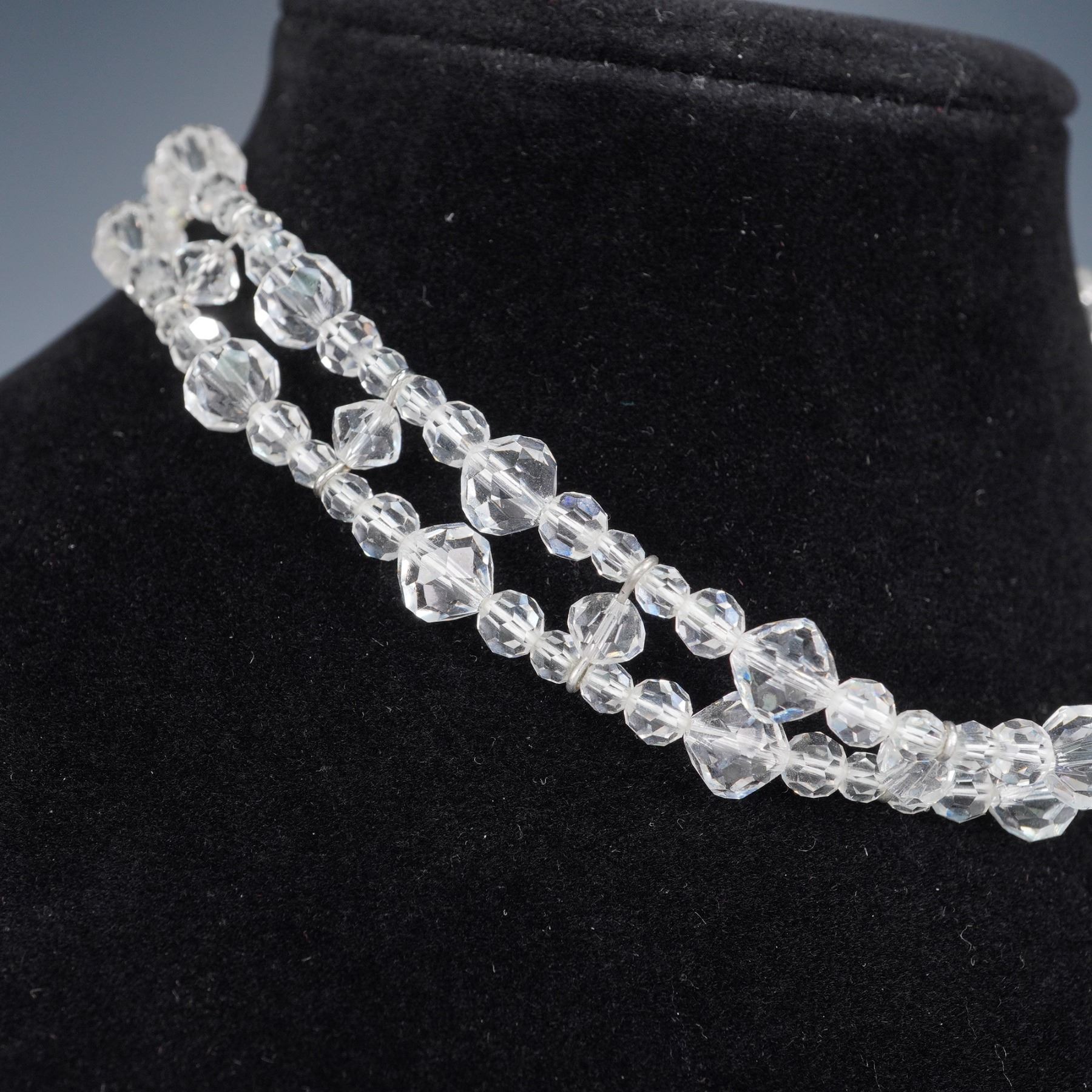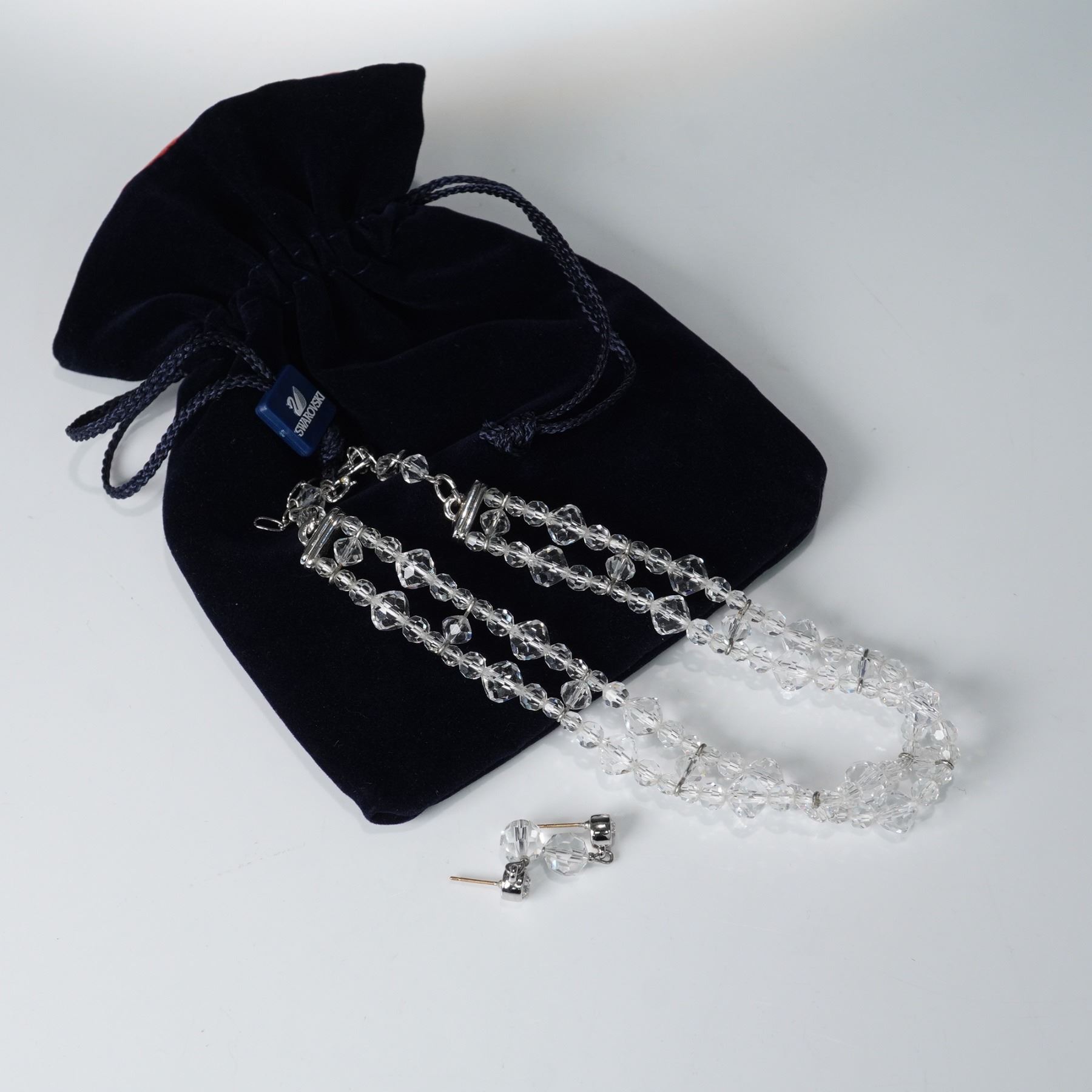 A refined three-piece Swarovski crystal jewelry set including a necklace and matching earrings. The necklace features two strands of faceted clear Swarovski crystal beads in graduated sizes, catching the light with brilliance. The coordinating earrings are designed with bezel-set crystal tops suspending faceted round crystal drops for a cohesive look. All pieces are marked Swarovski.