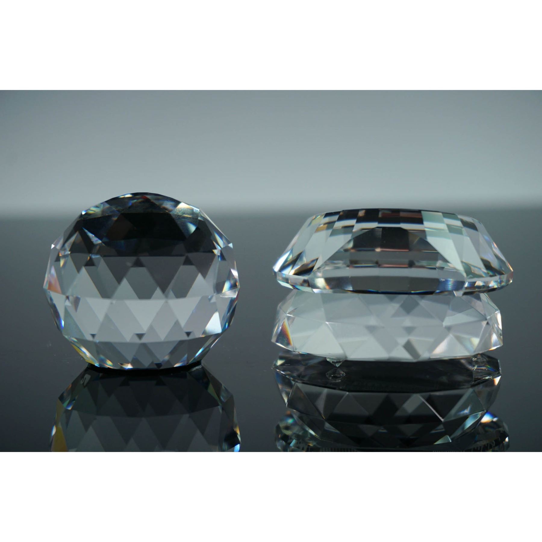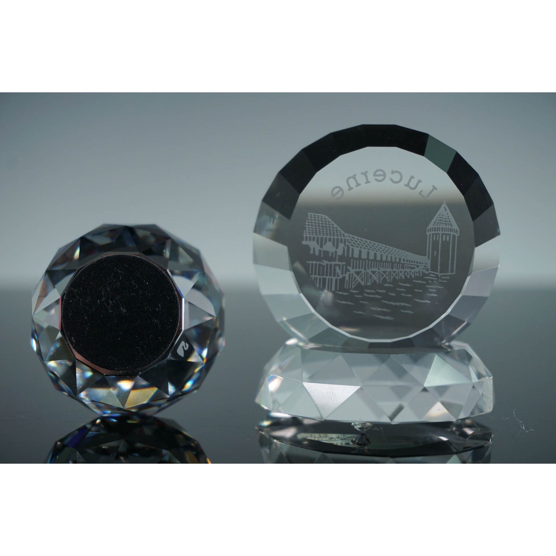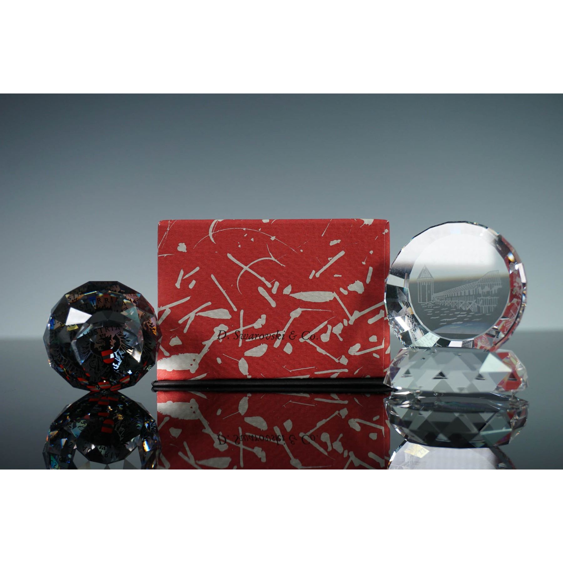 Set of two Swarovski crystal paperweights and one base, each paperweight with distinct imagery and form. Includes a disc-shaped paperweight etched with an image of the Chapel Bridge, a historic landmark in Lucerne, Switzerland. This piece is housed in a D. Swarovski & Co. original box. Also included is an orb-shaped crystal paperweight featuring the Coat of Arms of Austria, which rests on a faceted crystal display base. Lucerne: 2"L x 1.75"H. Austria: 1.5"W x 1.25"H. Base: 2"W x 0.5"H.
