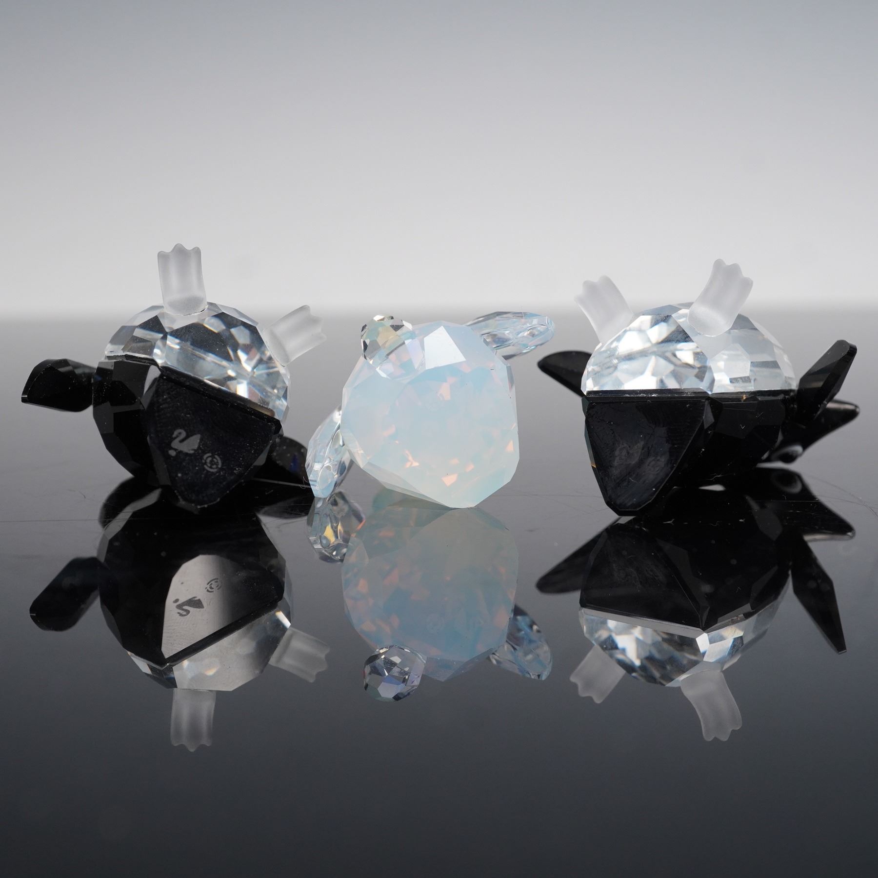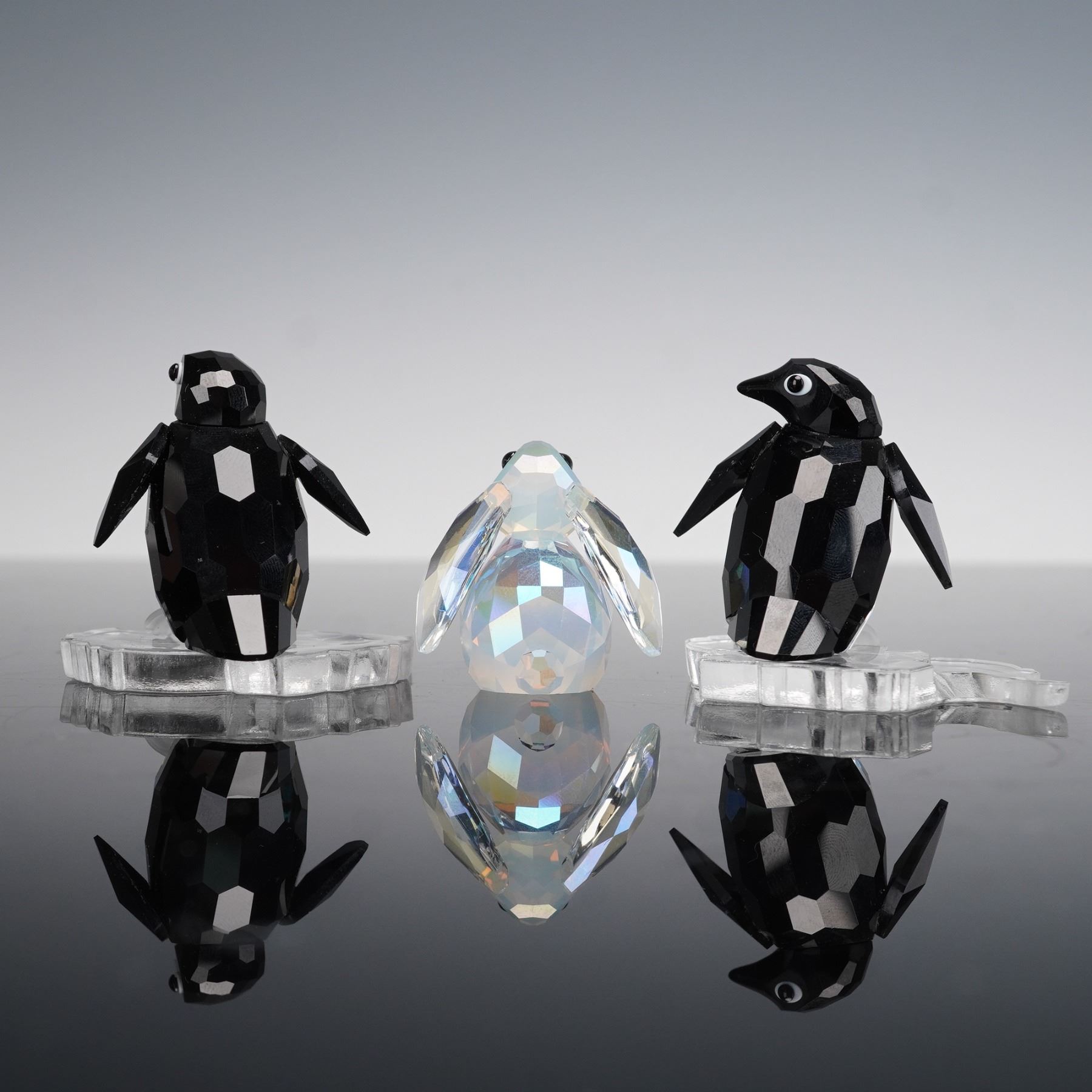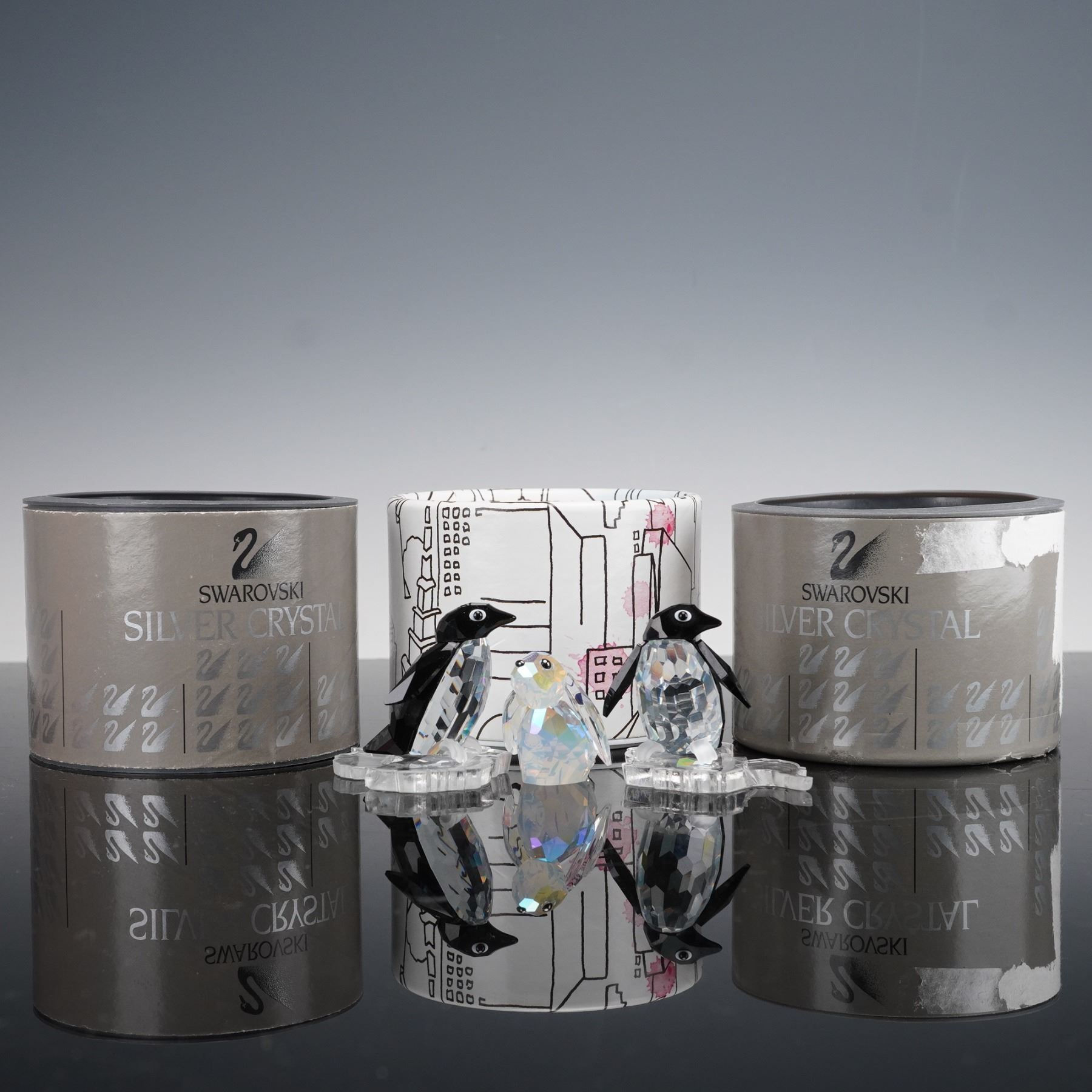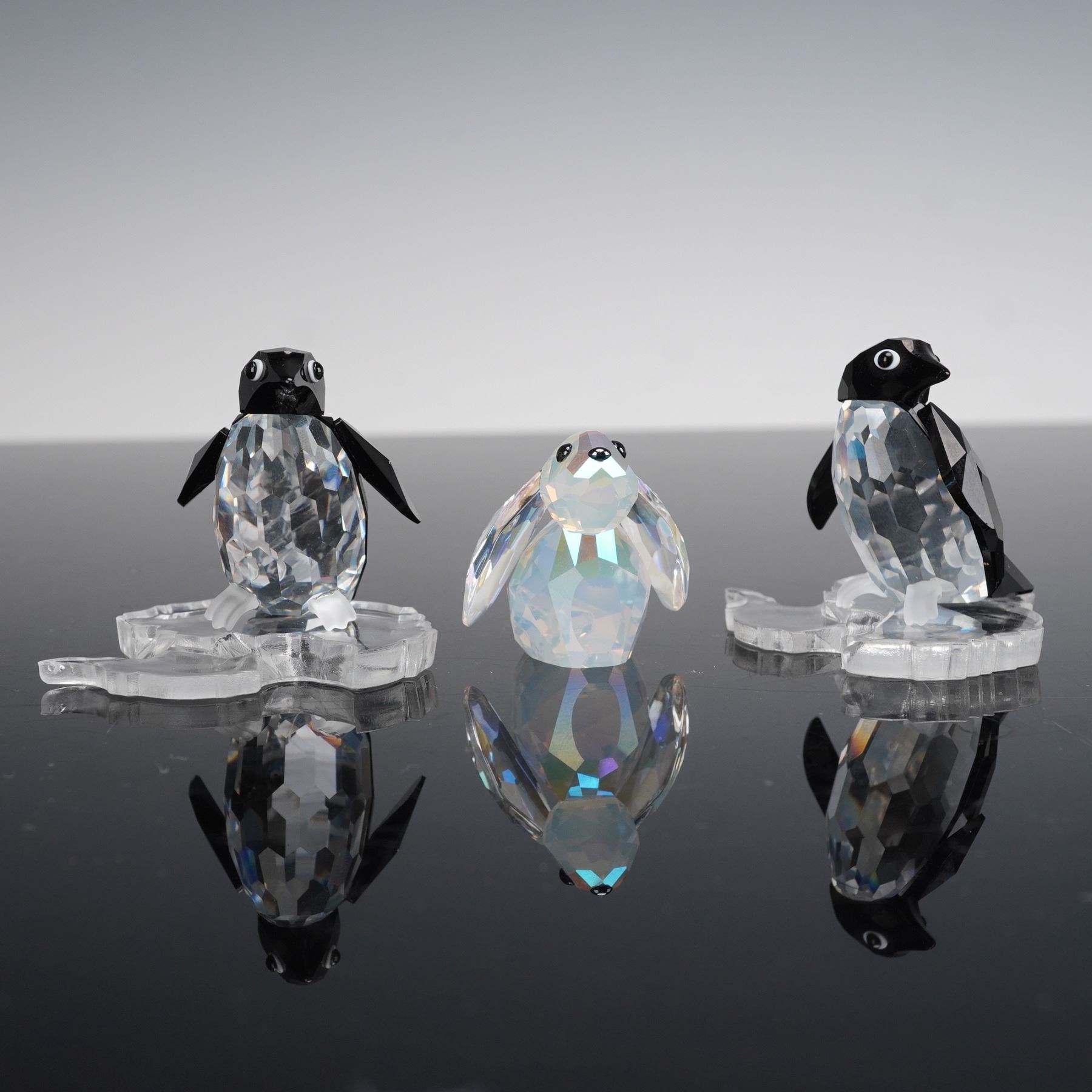 A trio of crystal figurines comprising two silver crystal penguins, Sir Penguin 191448 and Madame Penguin 206977. Also included is Lovlots Circus Benny The Bunny Rabbit 1072348. Benny is the magician of the Lovlots Circus, sparkling in White Opal Crystal Aurore Borealis and Crystal Moonlight. Both penguins were part of Kingdom of Ice and Snow collection and are made with clear and black crystal and sit on plastic base shaped like Antarctica. Swarovski backstamp. These item have its original boxes.