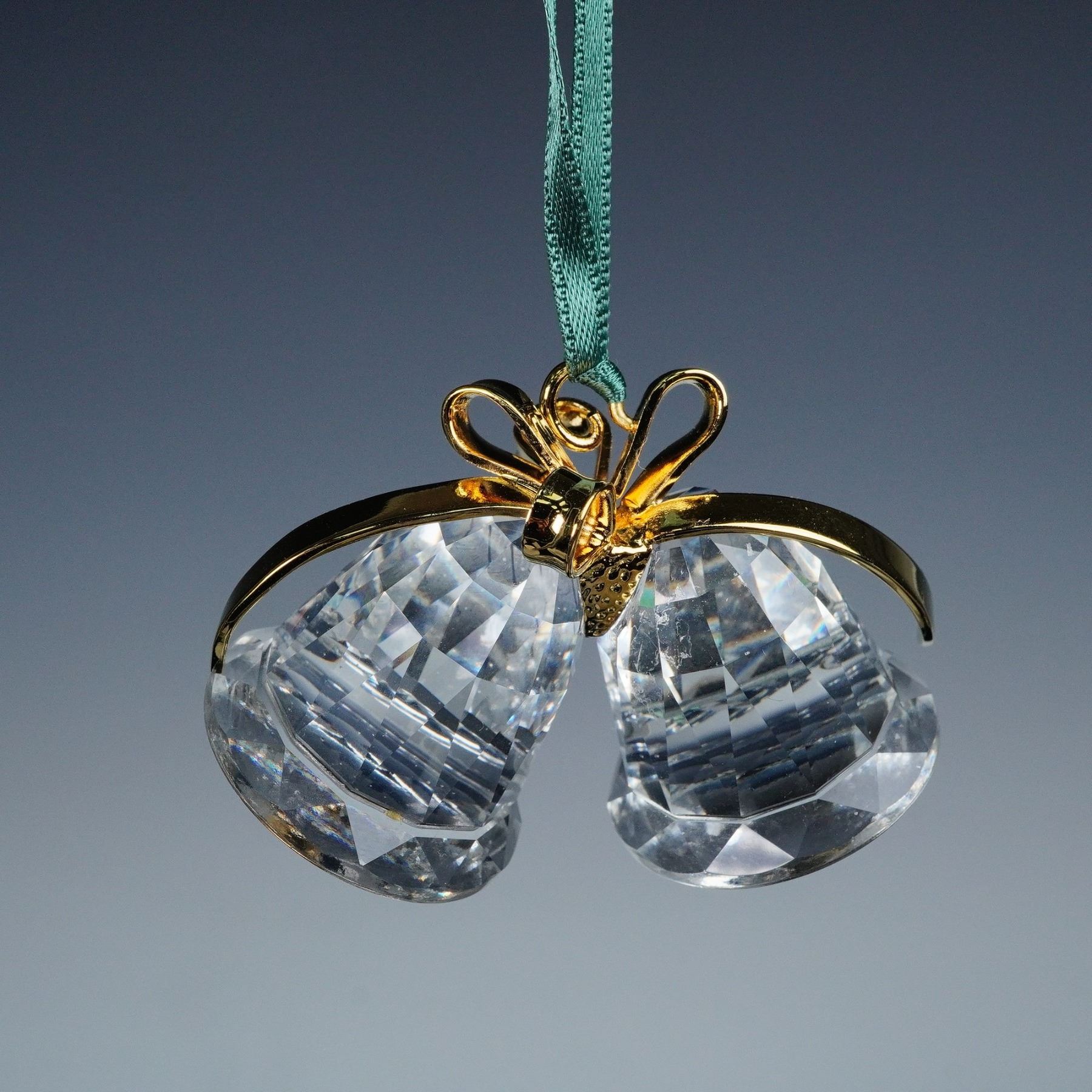 Group of three Swarovski crystal holiday-themed pieces including a large multi-pointed crystal Star candleholder, a clear faceted Bell ornament with gold-tone trim and green ribbon, and a green crystal Christmas Tree accented with red and gold details. Each piece showcases the precision-cut brilliance and craftsmanship for which Swarovski is known. All pieces retain original boxes and packaging. 119430, 203079, 5717262. This item has its original box.