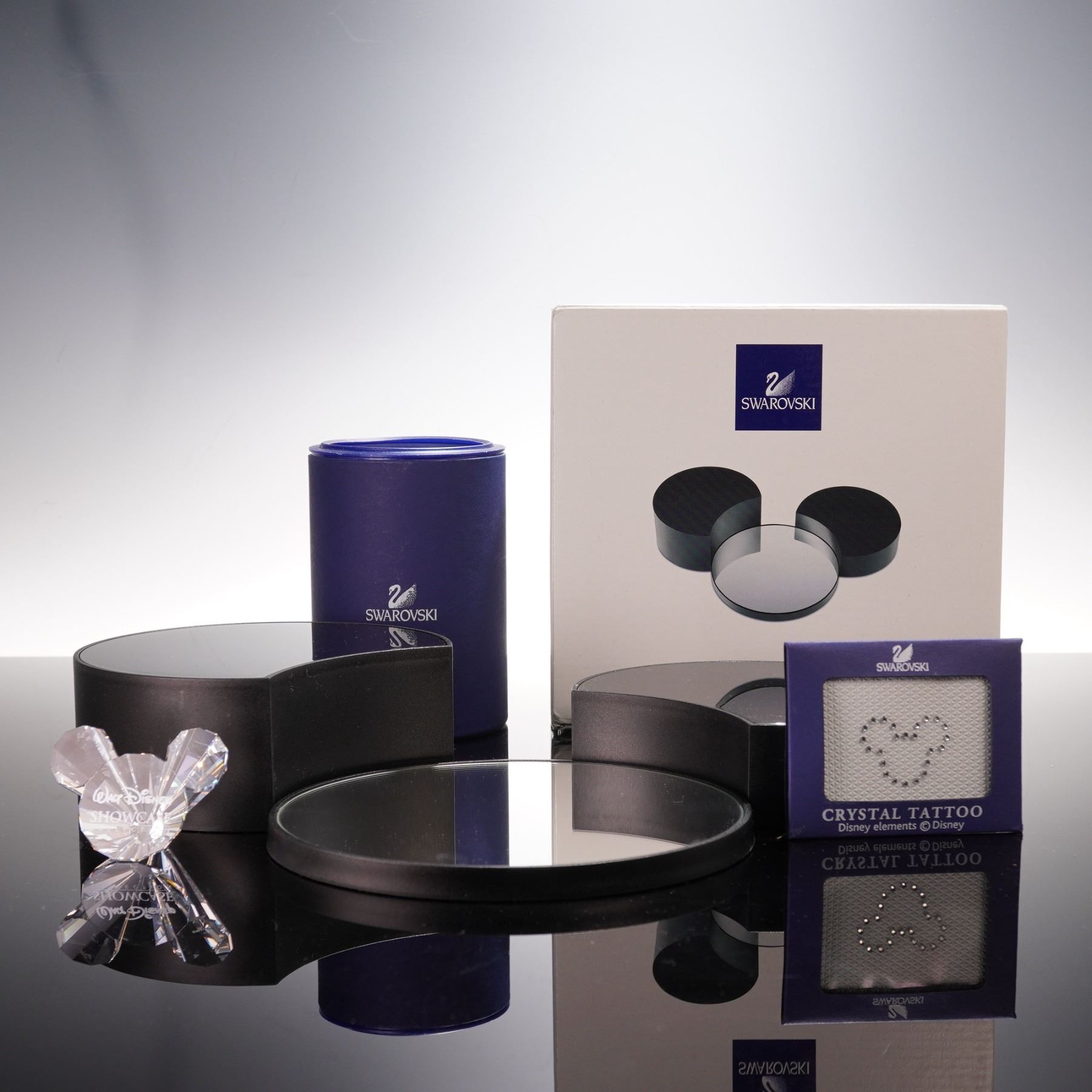 Featuring three black display stands arranged in the iconic Mickey Mouse ear silhouette (model 835777), a clear crystal Mickey Ears title plaque inscribed with the Disney Showcase logo (model 835357), and a Swarovski Crystal Tattoo set crafted with Disney elements forming a Mickey head design. Each piece bears the Swarovski swan logo, representing the brand's signature craftsmanship and collaboration with Disney. This item has its original box.