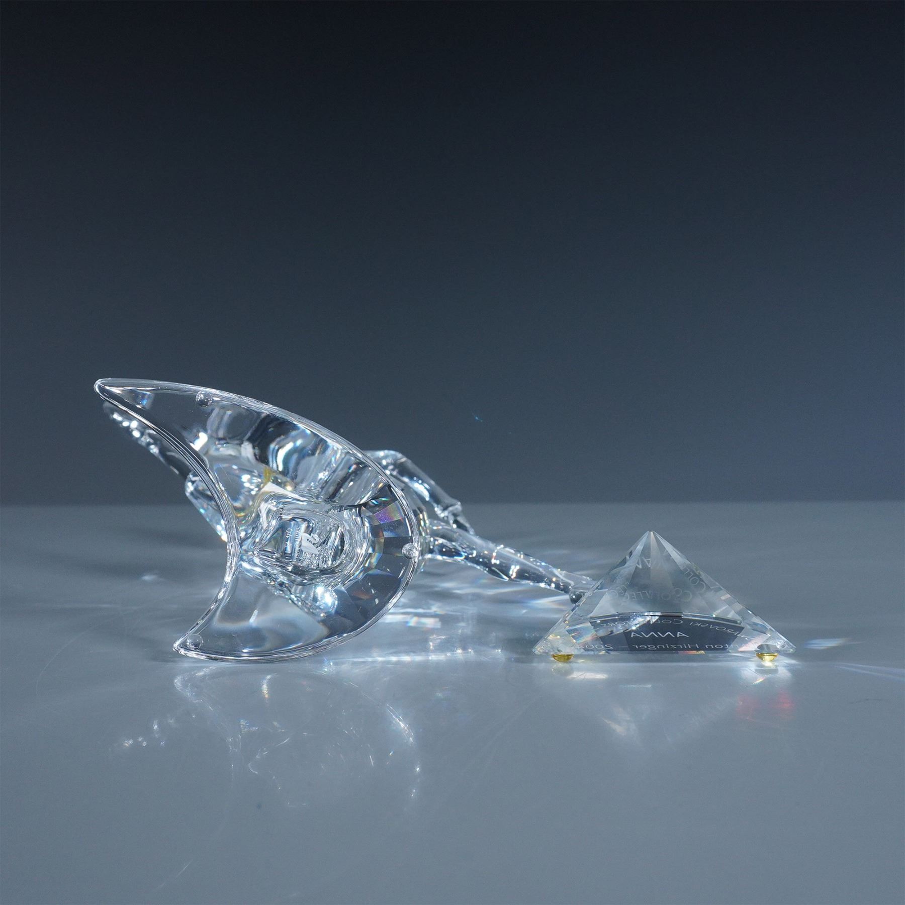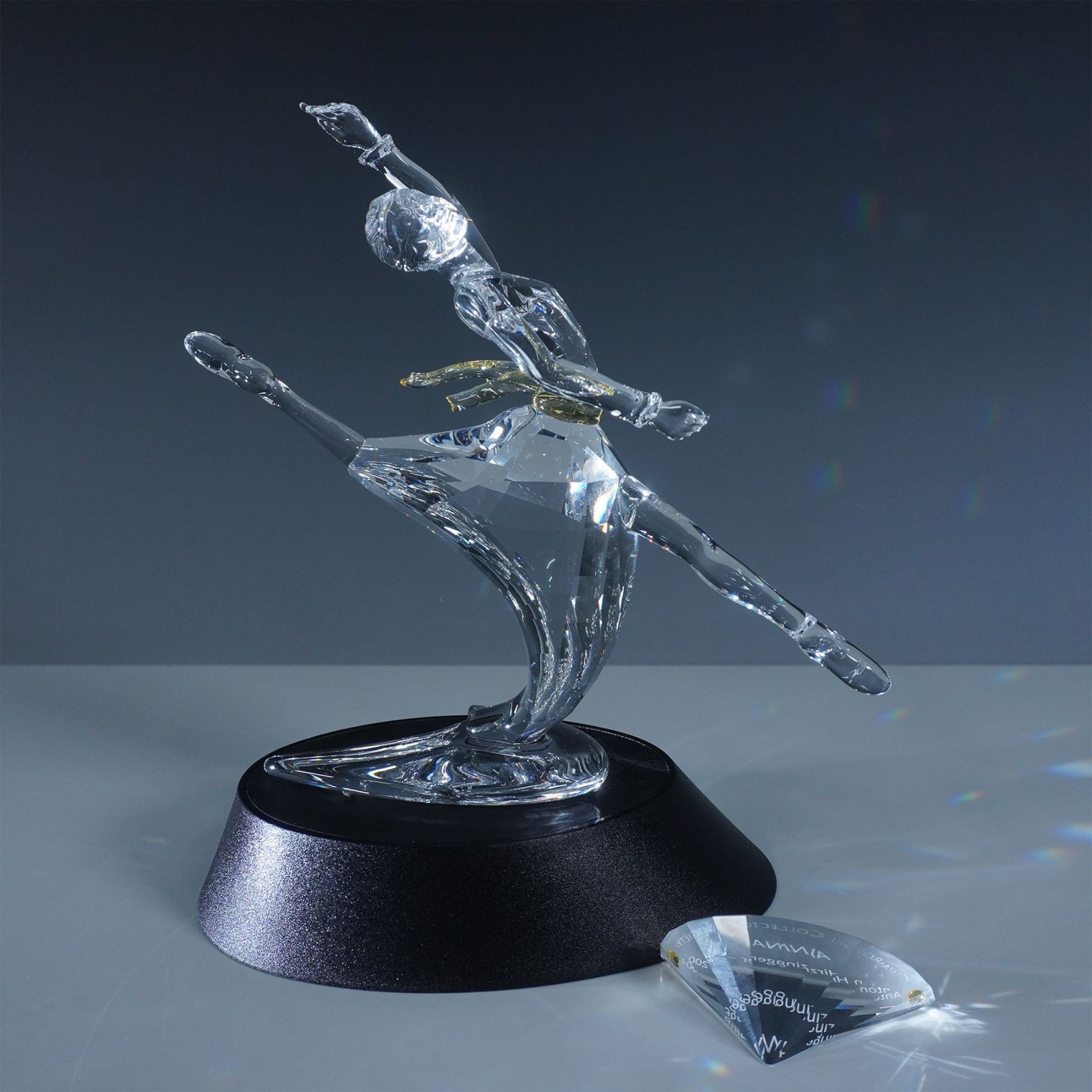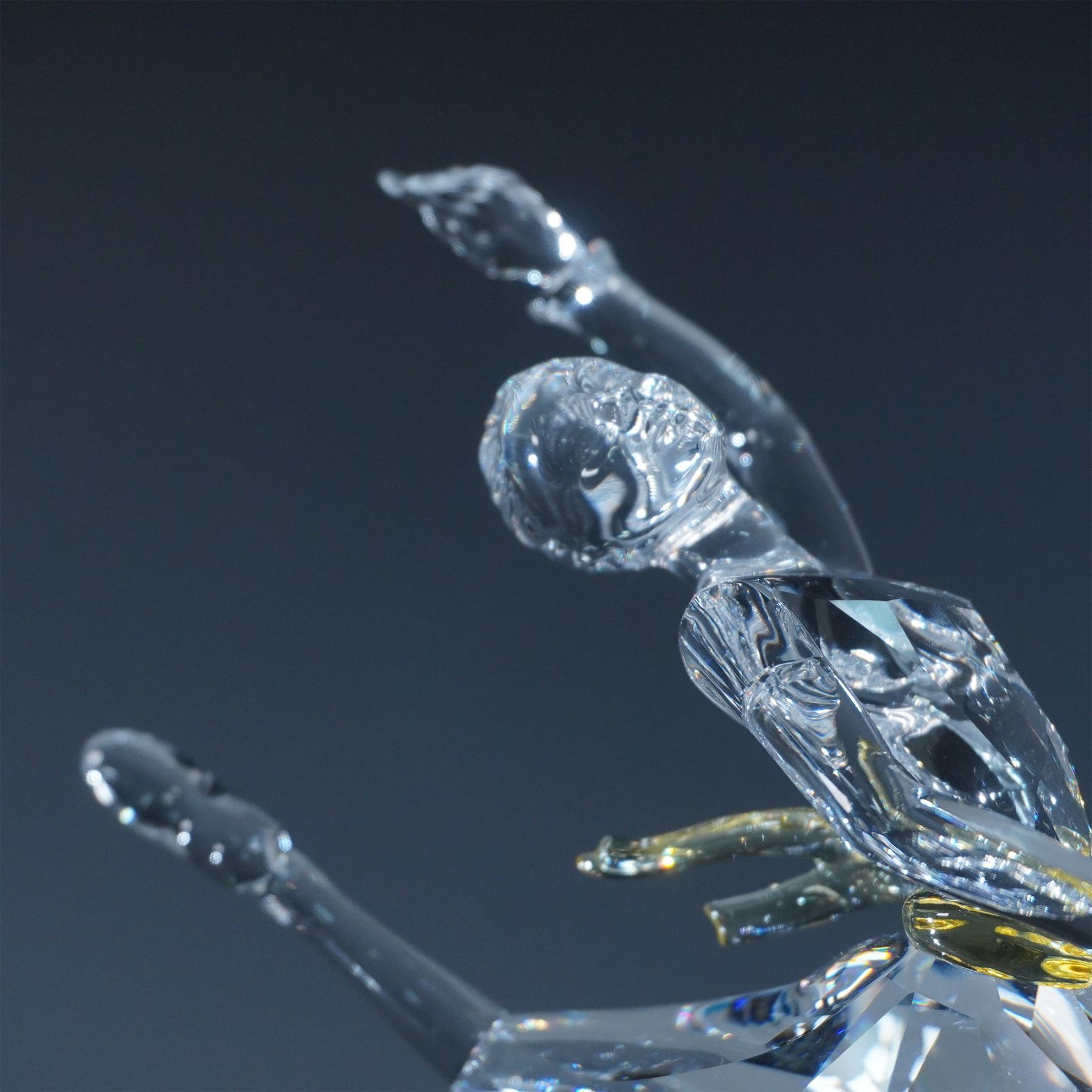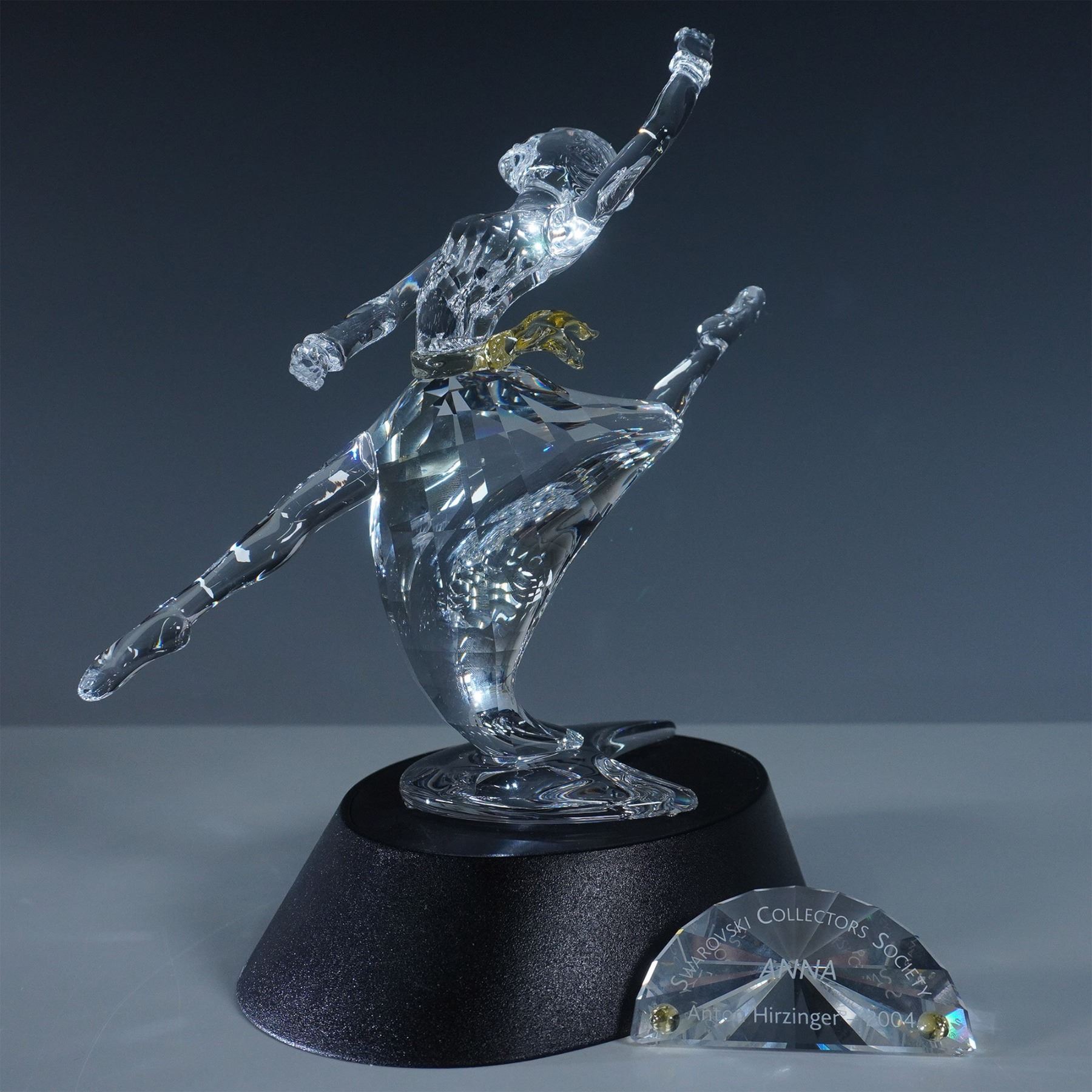 Swarovski Magic of Dance Collection Anna, model number 627396, designed by Anton Hirzinger. Released in 2004 as the third and final piece in the Magic of Dance series, this exquisite crystal figurine captures the grace and movement of a ballerina in mid-performance. Crafted from faceted clear crystal, Anna features delicate gold-tone accents on her waist and hair. Mounted on a black display base, this limited-edition piece includes the original box, certificate, and title plaque.