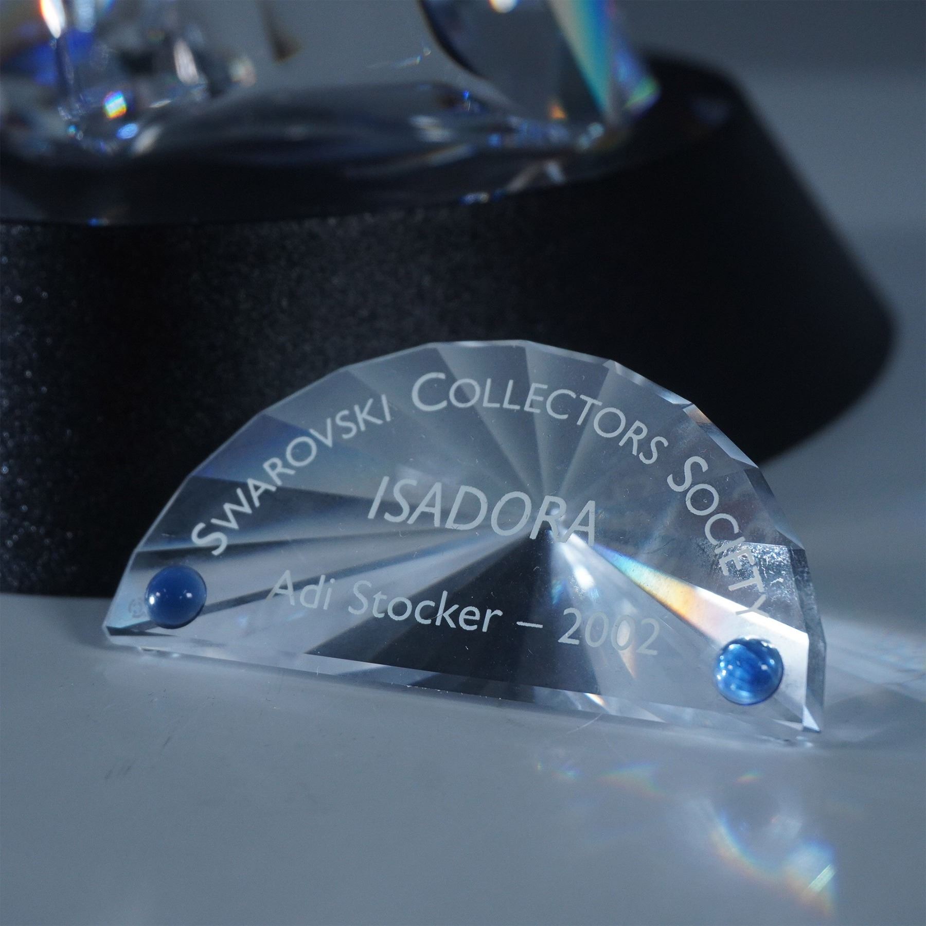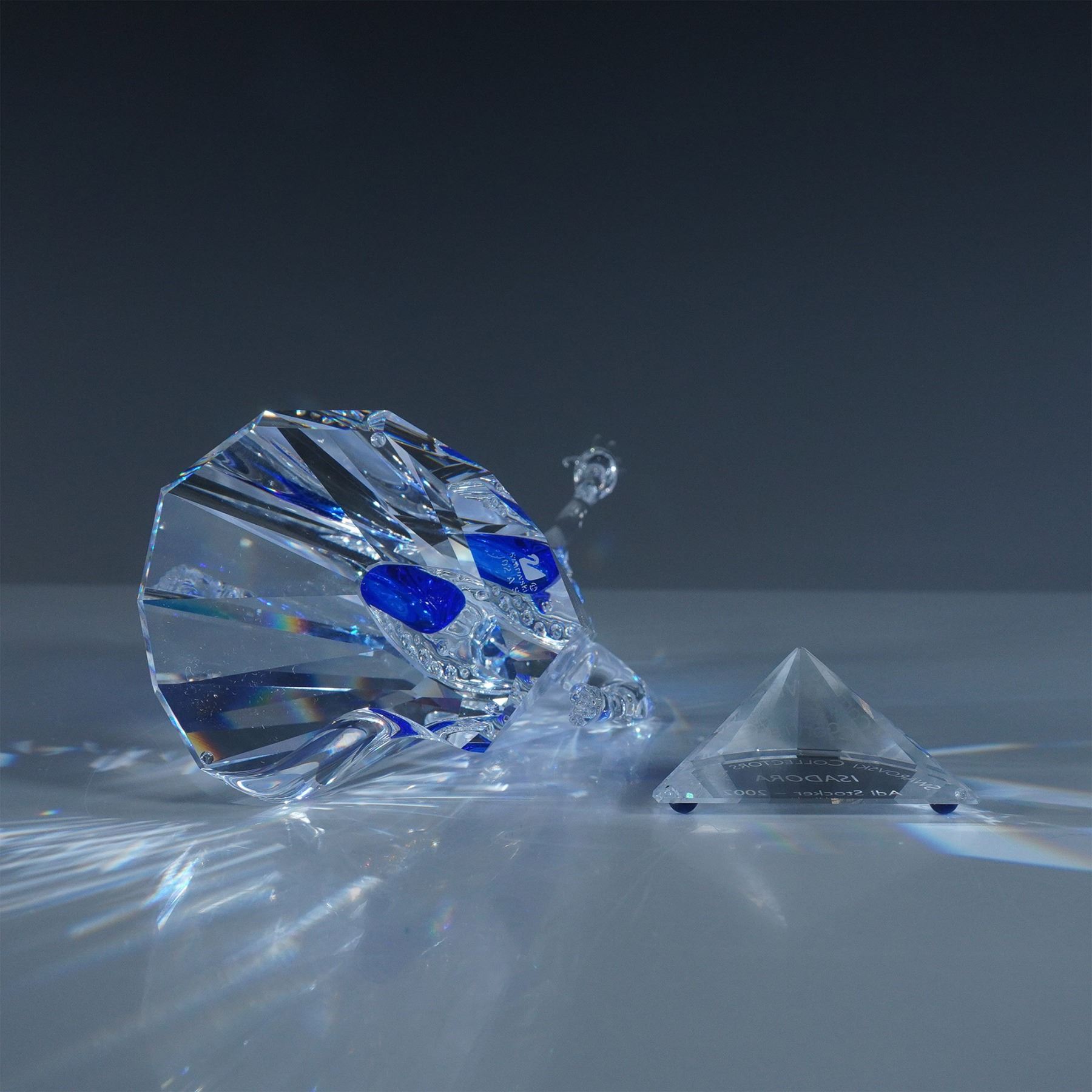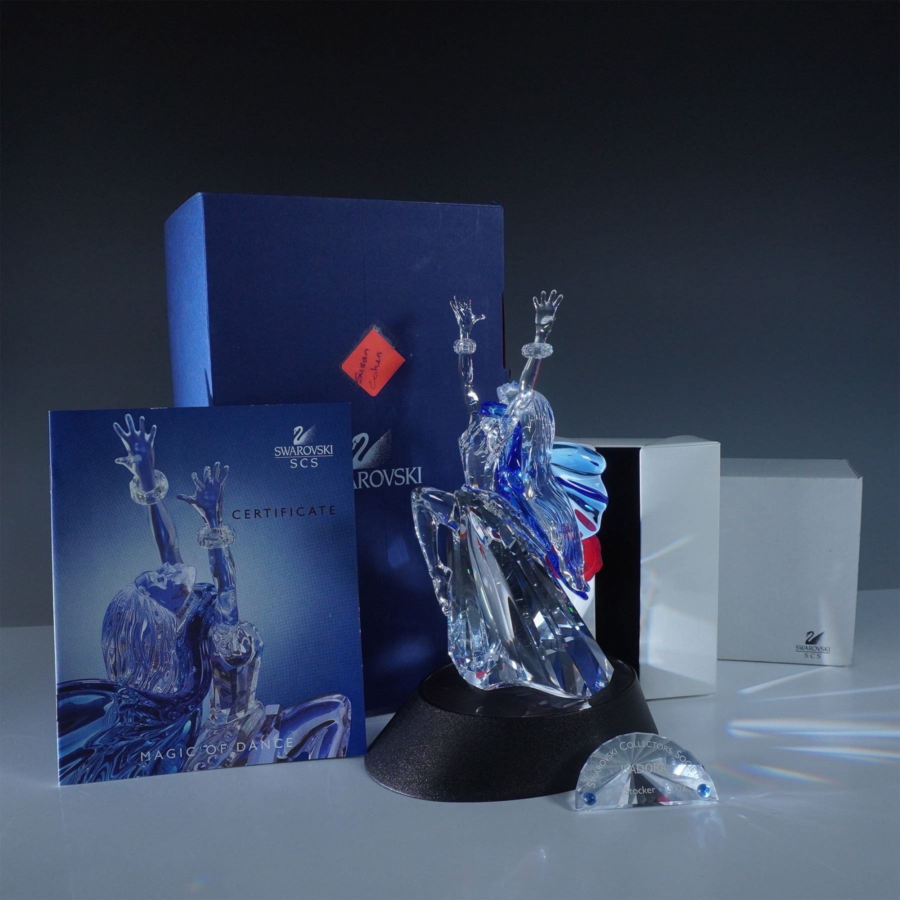 Swarovski SCS Isadora, model number 279648, designed by Adi Stocker. Released in 2002 as the first piece in the Magic of Dance trilogy, this stunning figurine portrays the legendary dancer Isadora Duncan in an expressive pose. Crafted in clear faceted crystal, Isadora’s flowing gown features vibrant blue and red accents, capturing the energy and movement of dance. This limited-edition piece was available exclusively to Swarovski Crystal Society (SCS) members. Included in this lot are the original box, certificate, matching title plaque, and display stand.