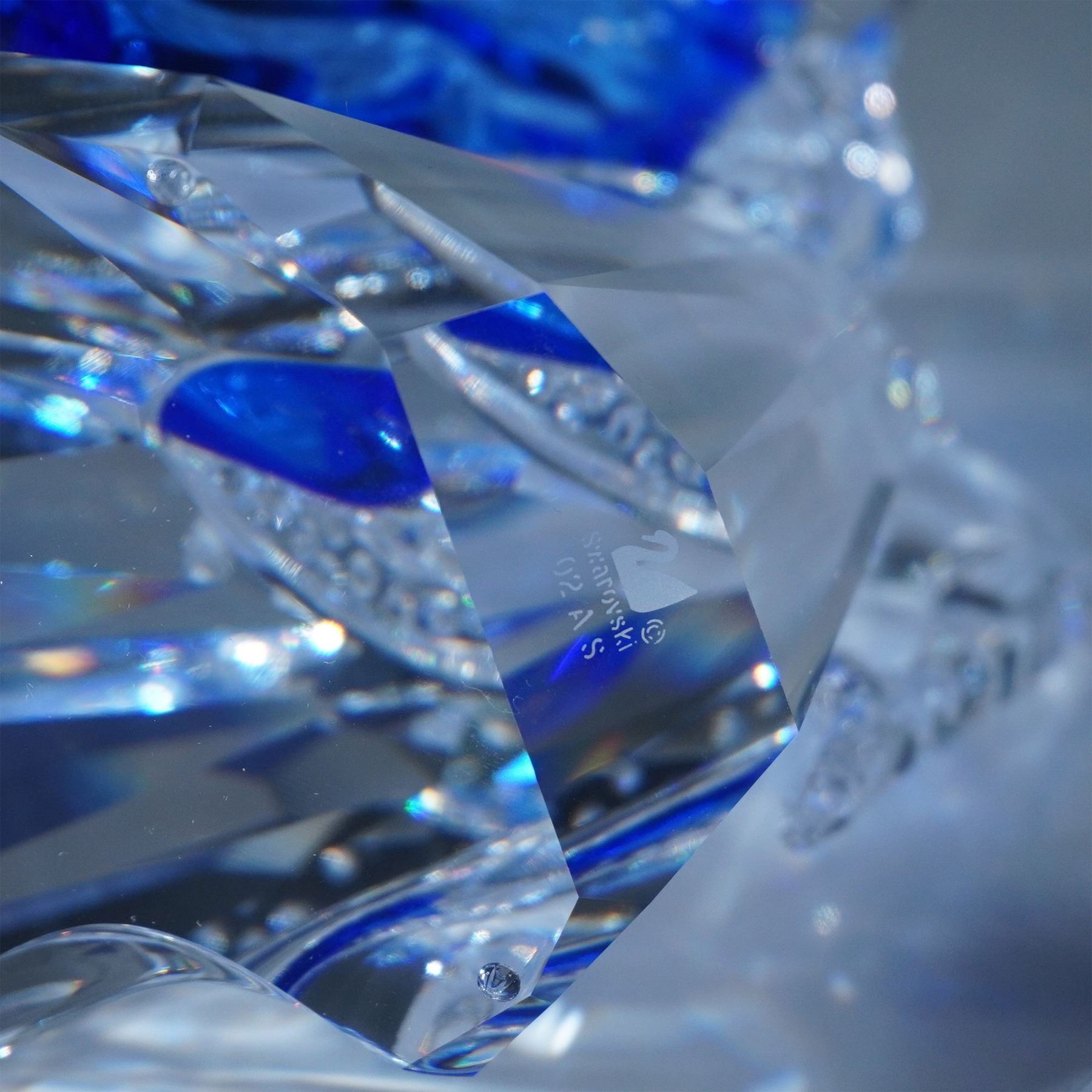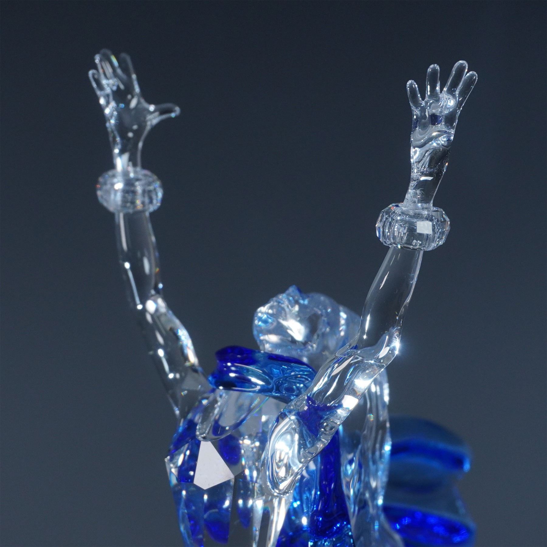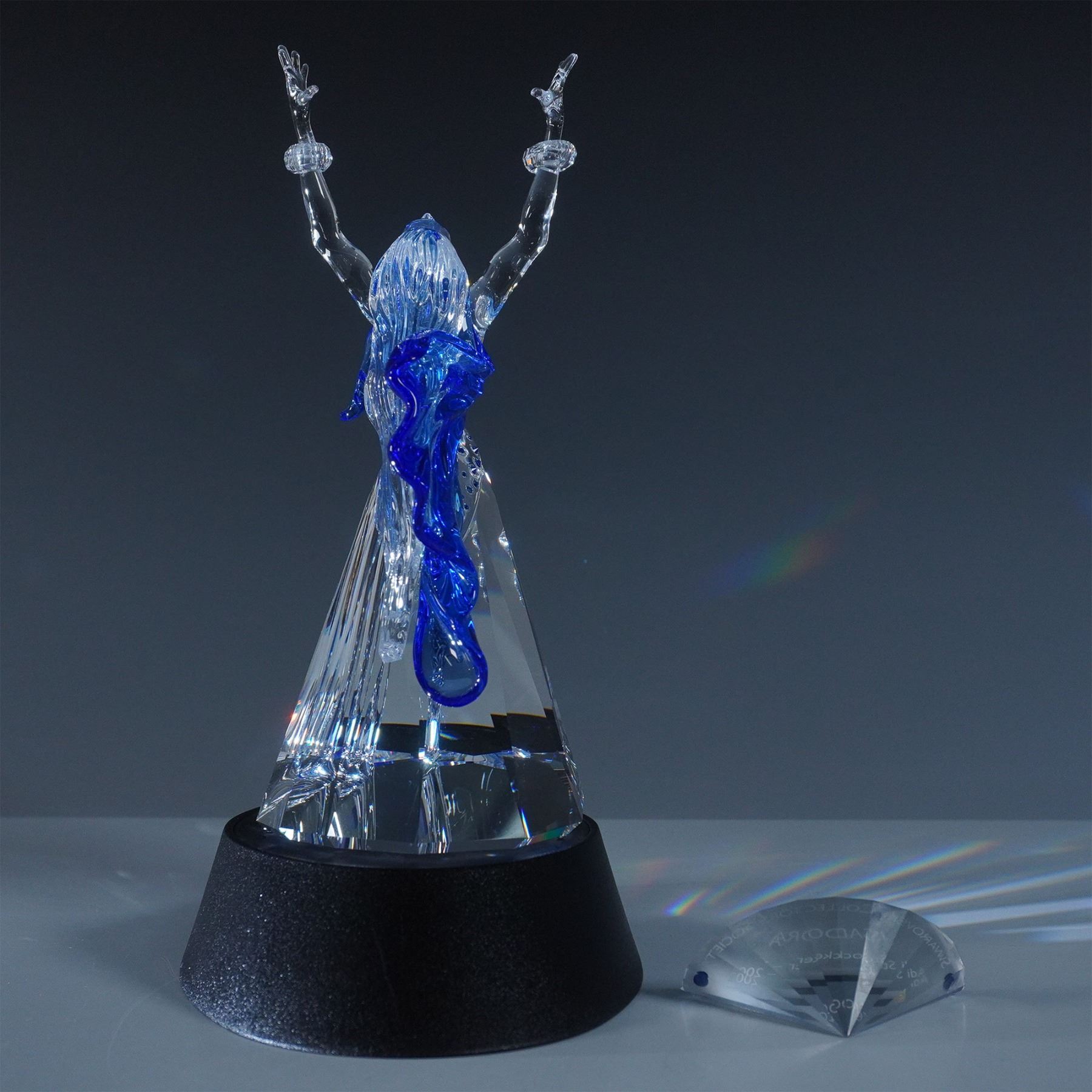 Swarovski SCS Isadora, model number 279648, designed by Adi Stocker. Released in 2002 as the first piece in the Magic of Dance trilogy, this stunning figurine portrays the legendary dancer Isadora Duncan in an expressive pose. Crafted in clear faceted crystal, Isadora’s flowing gown features vibrant blue and red accents, capturing the energy and movement of dance. This limited-edition piece was available exclusively to Swarovski Crystal Society (SCS) members. Included in this lot are the original box, certificate, matching title plaque, and display stand.