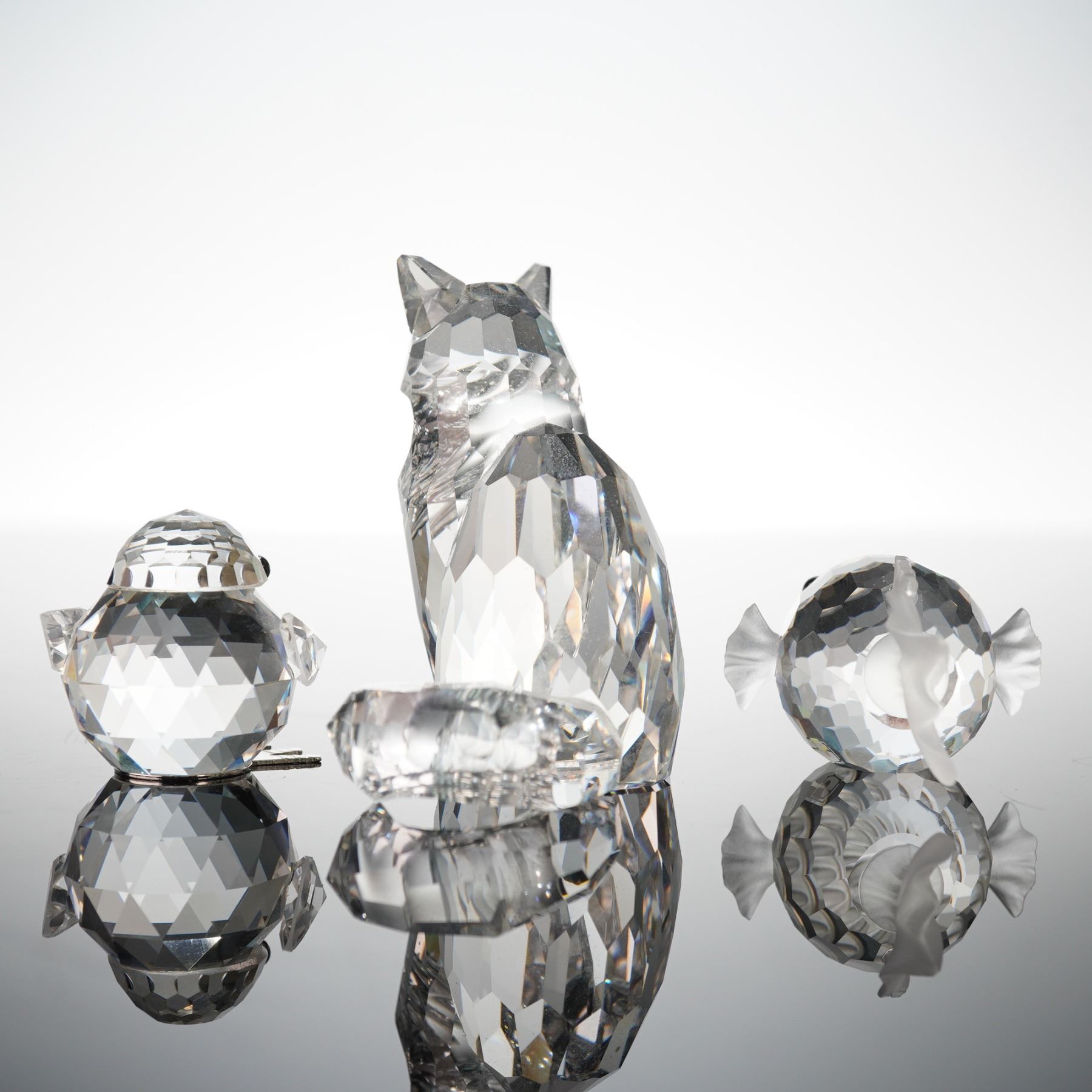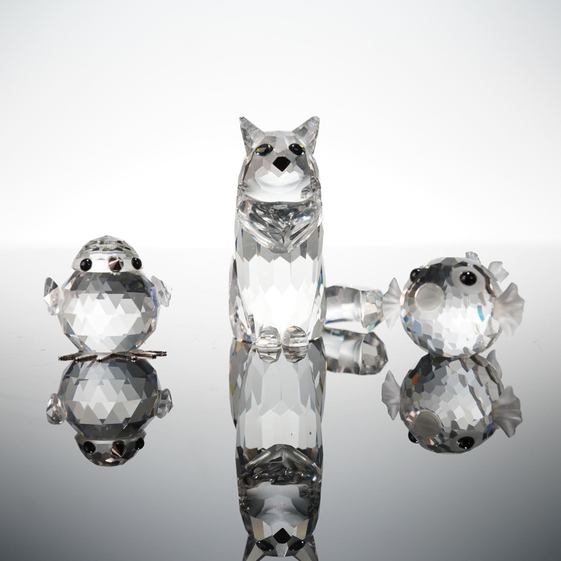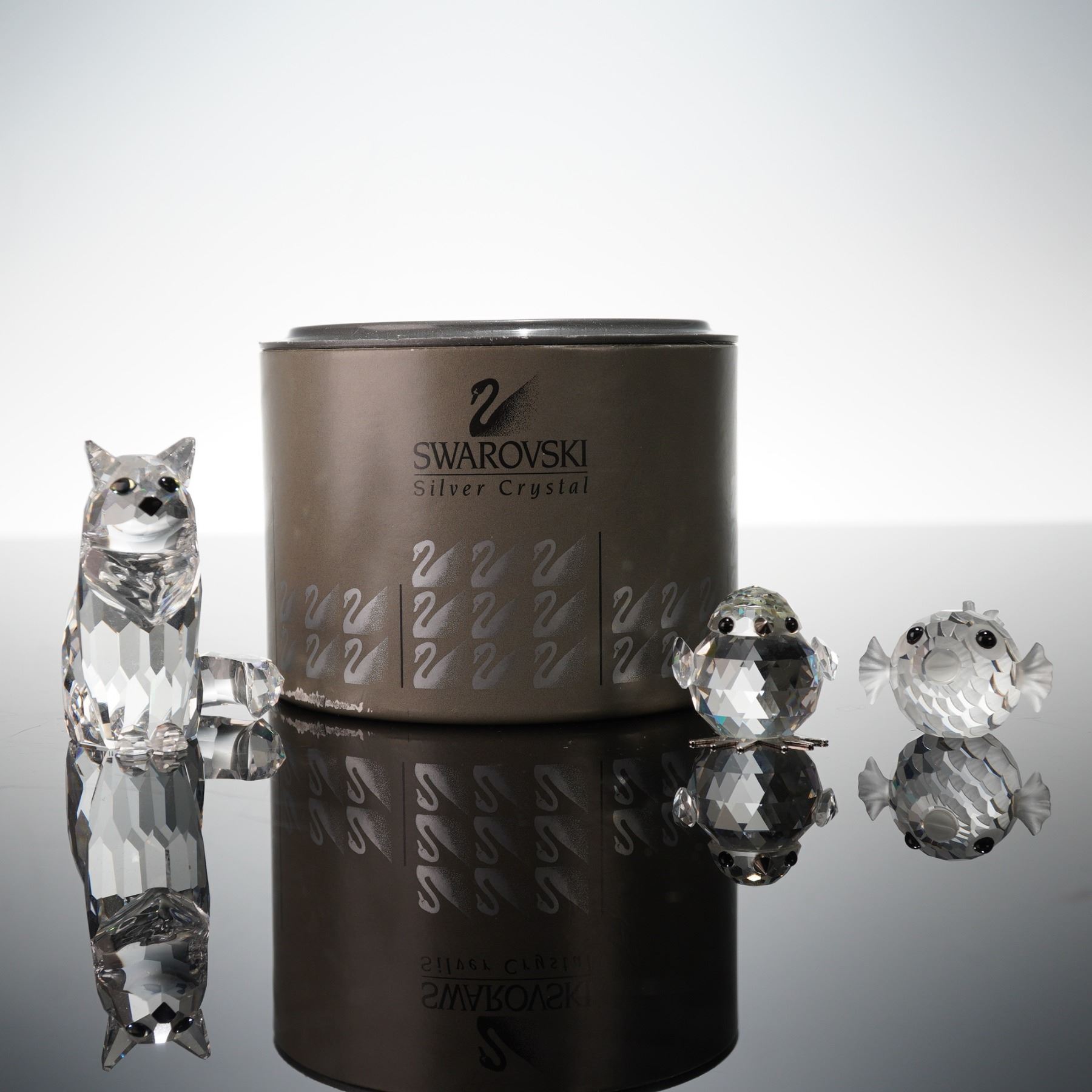 Three silver crystal figurines including Mini Chick 010030 made from clear, facetted crystal with black eyes, and a rhodium beak and feet, Mini Blowfish consisting of clear faceted crystal with frosted crystal used for the tail, fins, mouth, and around the outside of the black crystal eye, and Cat Sitting 160799 and has a clear facetted crystal body and tail, with black eyes and nose. Swarovski backstamp. One item has its original box.