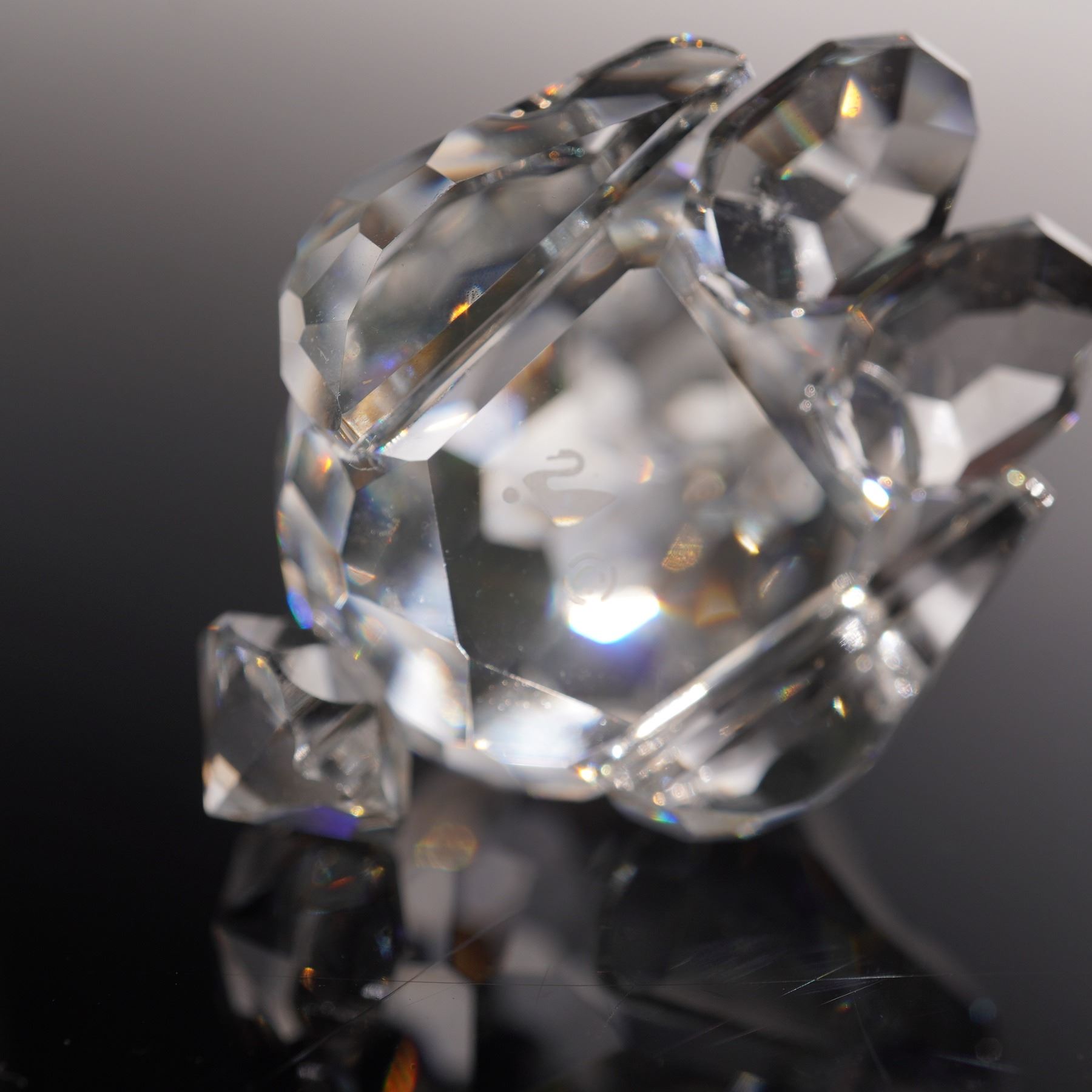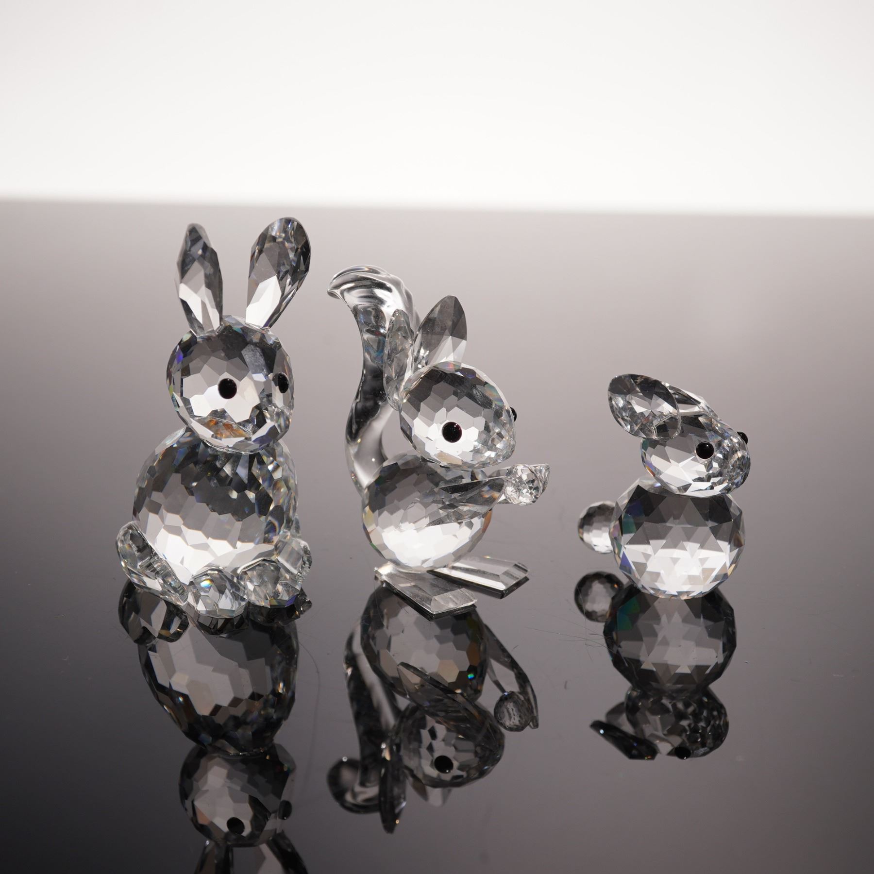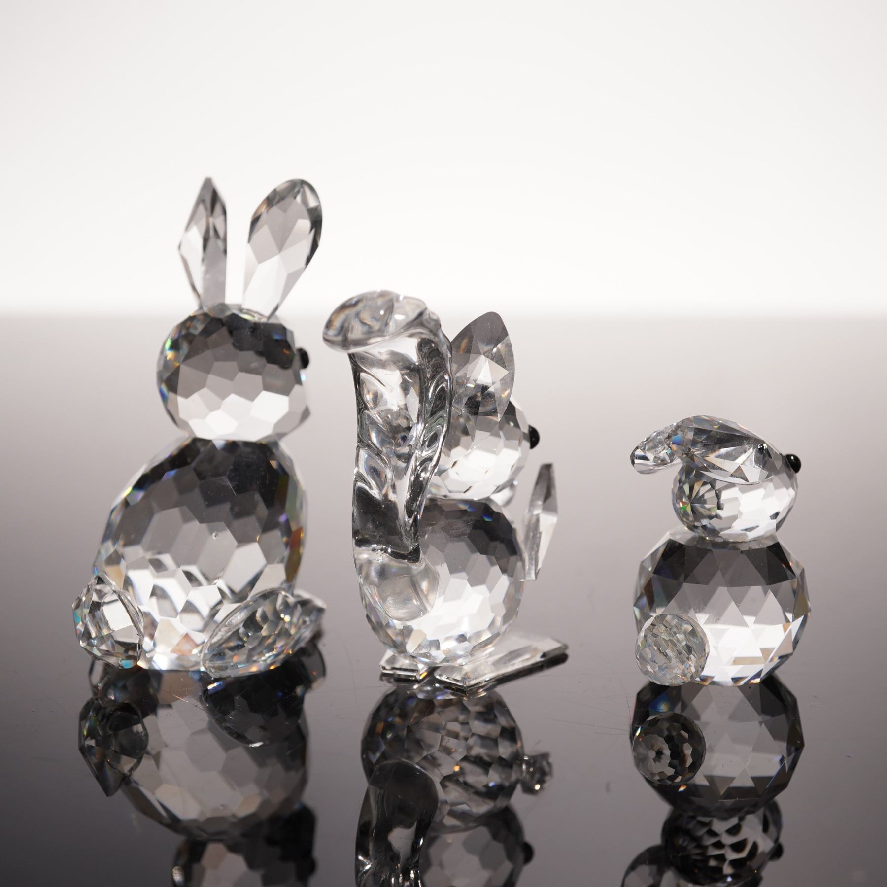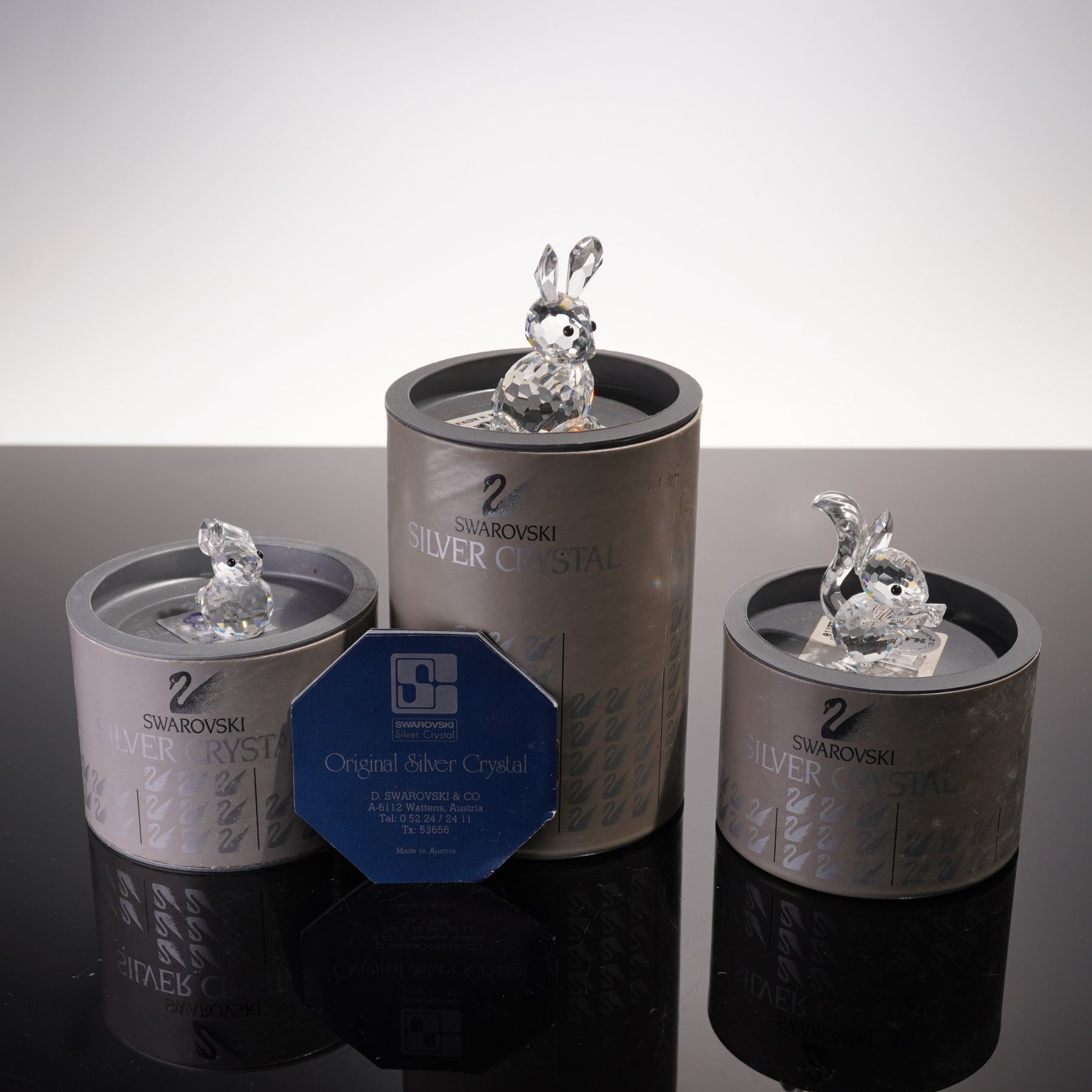A delightful trio of silver crystal figurines including Mother Rabbit 014850, Mini Rabbit 010012, and Squirrel Long Ears 011871. Each piece is meticulously cut, all accented by jet black crystal eyes for expressive detail. Swarovski backstamp. This item has its original boxes.