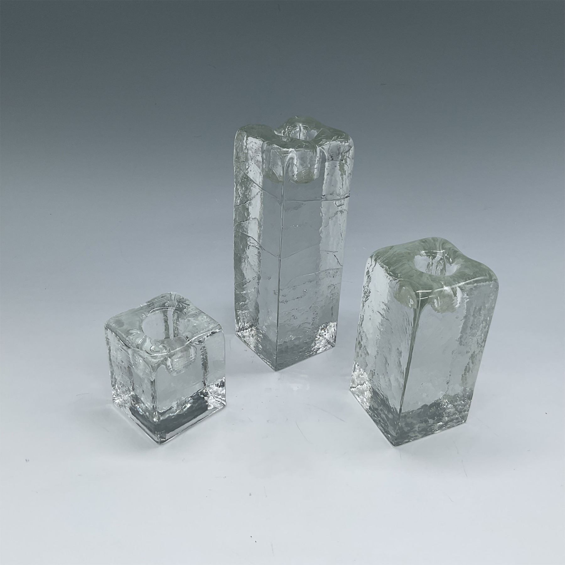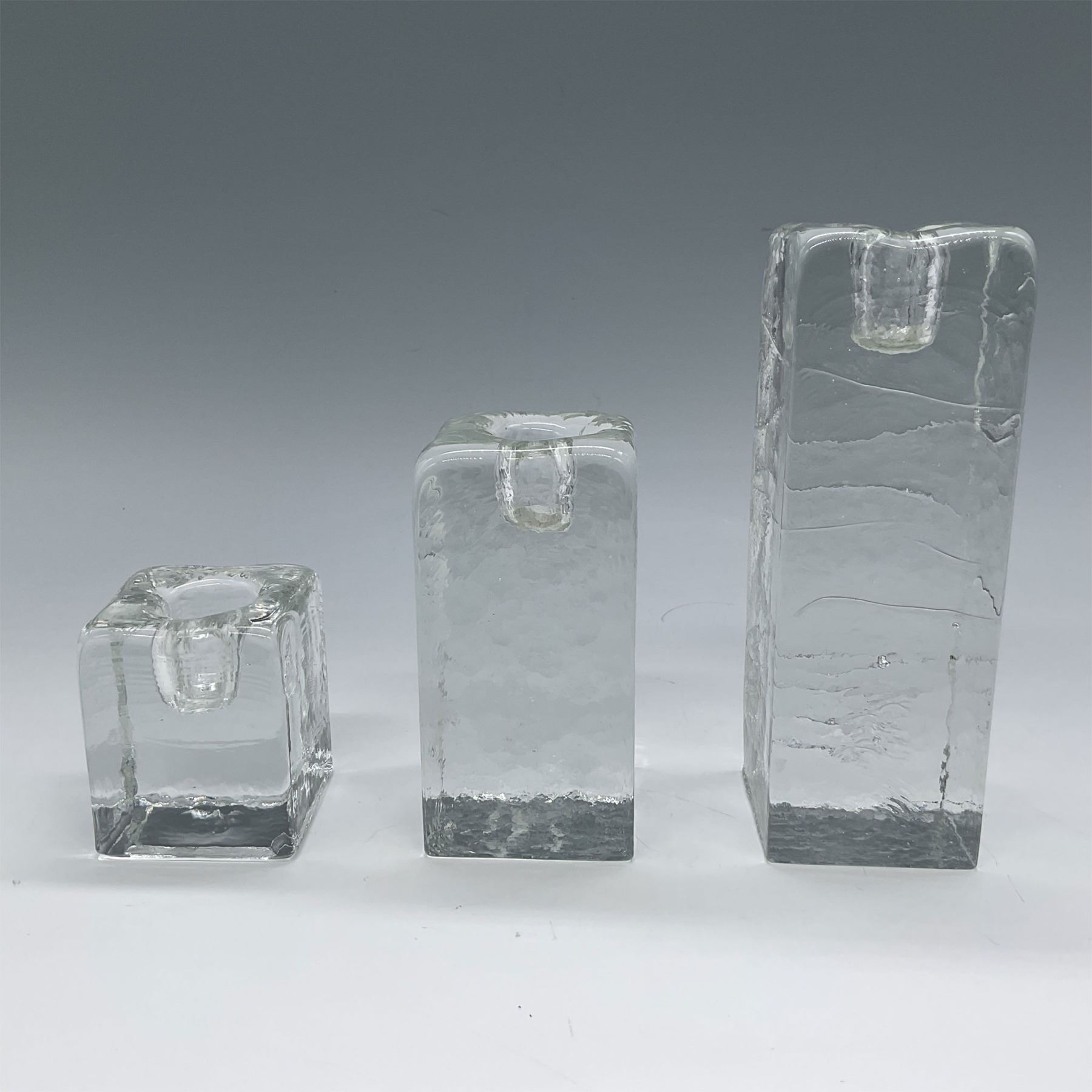 A set of three textured glass candleholders of varying sizes, featuring a minimalist and modern design. These pieces exhibit a clear, frosted-style glass texture and geometric shapes that create a timeless decorative appeal.