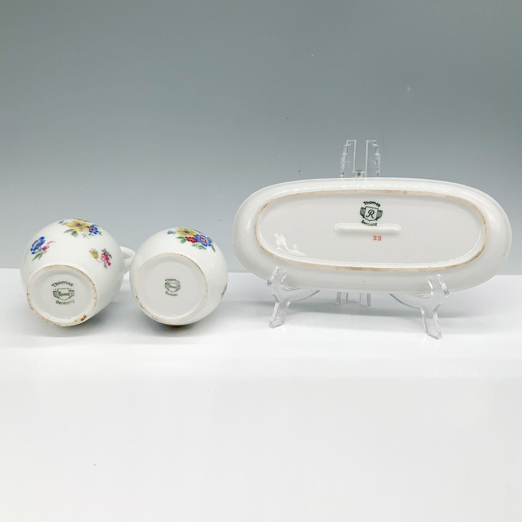 Thomas Germany three-piece porcelain set featuring a floral design. The set includes a small creamer with an elegantly curved handle, a small vase or sugar jar with a rounded form, and an oval tray, all adorned with hand-painted multicolored flowers in red, blue, and yellow. Each piece bears the Thomas Germany backstamp on the underside, signifying its origin and craftsmanship. A charming vintage addition to any porcelain collection. Tallest item: 3.5"H.