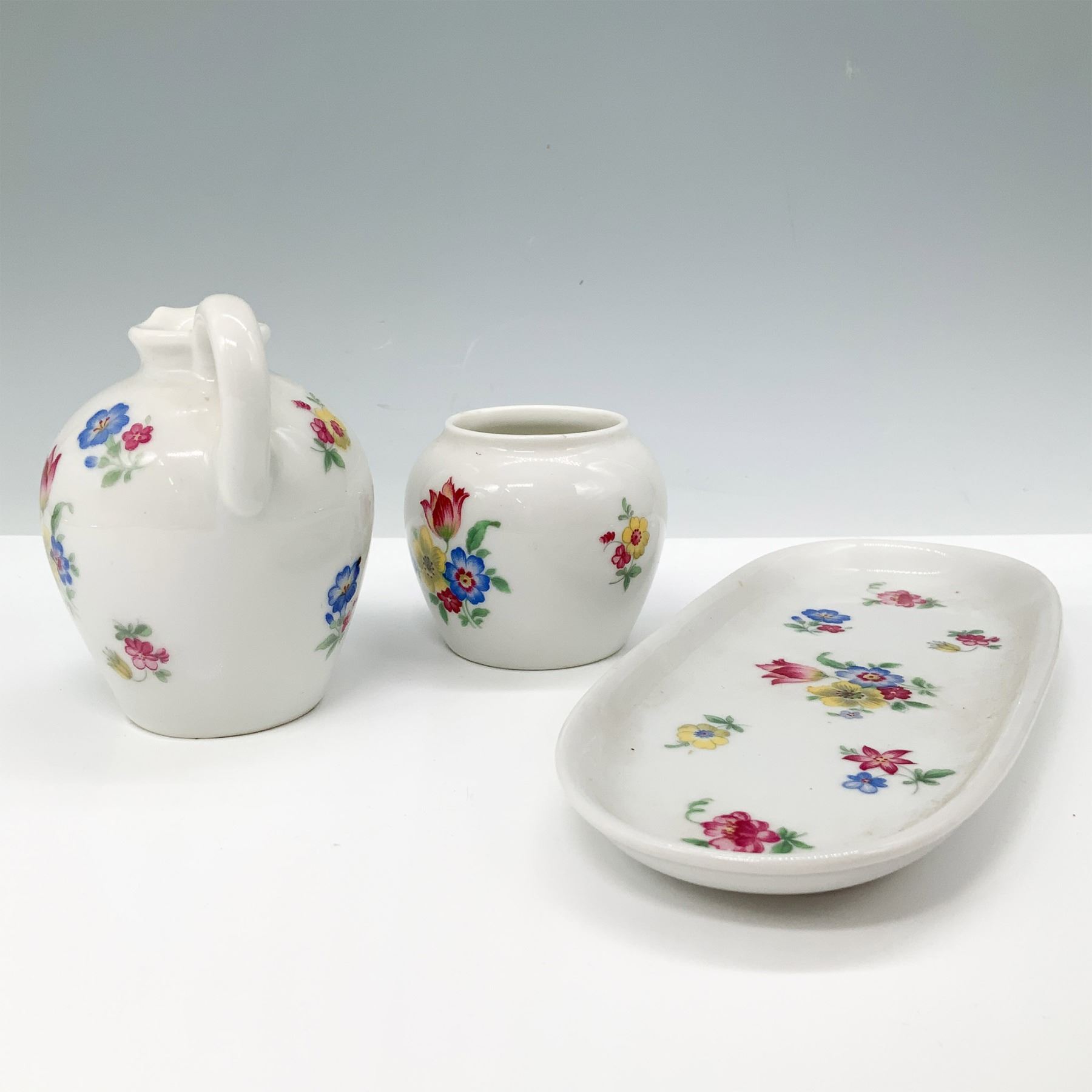 Thomas Germany three-piece porcelain set featuring a floral design. The set includes a small creamer with an elegantly curved handle, a small vase or sugar jar with a rounded form, and an oval tray, all adorned with hand-painted multicolored flowers in red, blue, and yellow. Each piece bears the Thomas Germany backstamp on the underside, signifying its origin and craftsmanship. A charming vintage addition to any porcelain collection. Tallest item: 3.5"H.