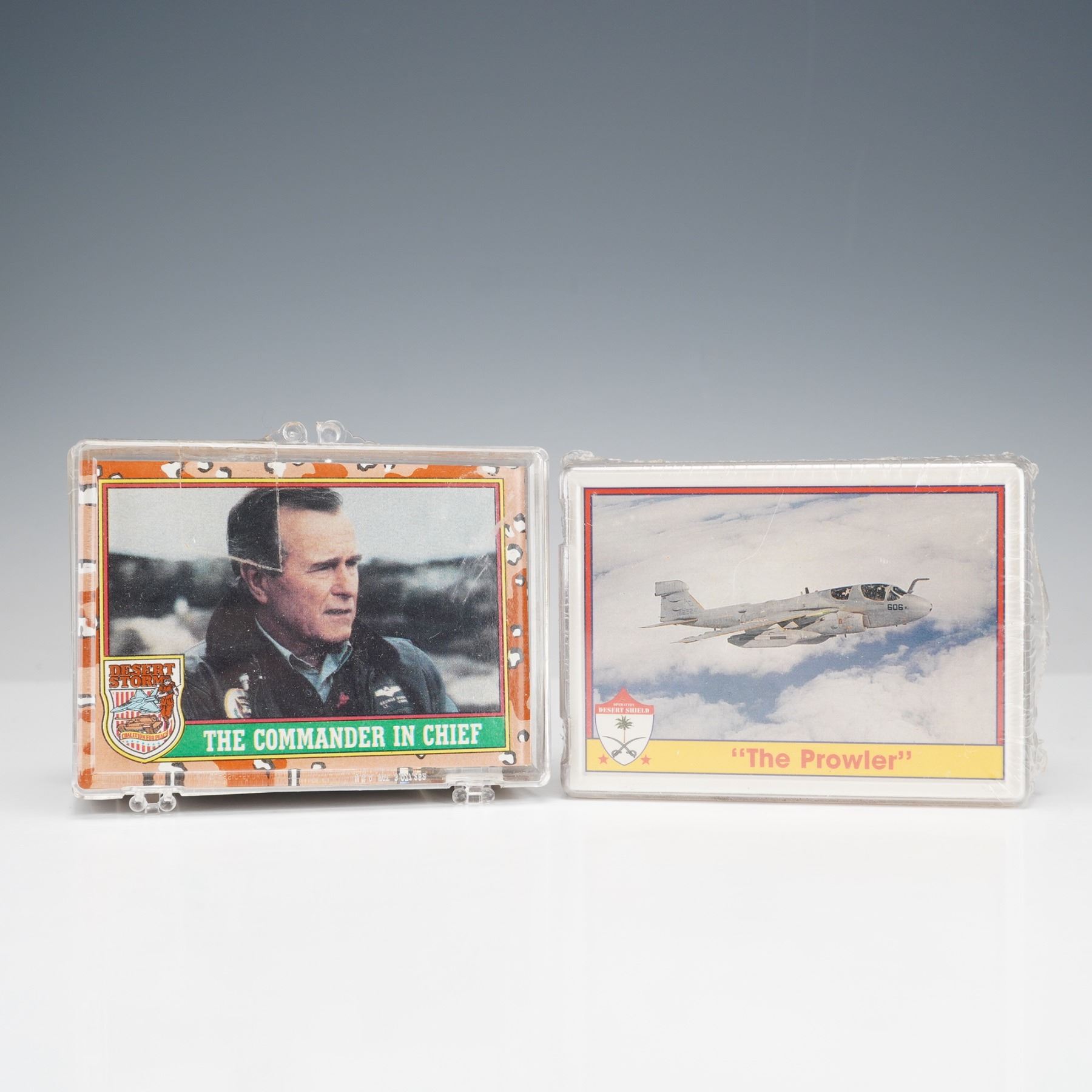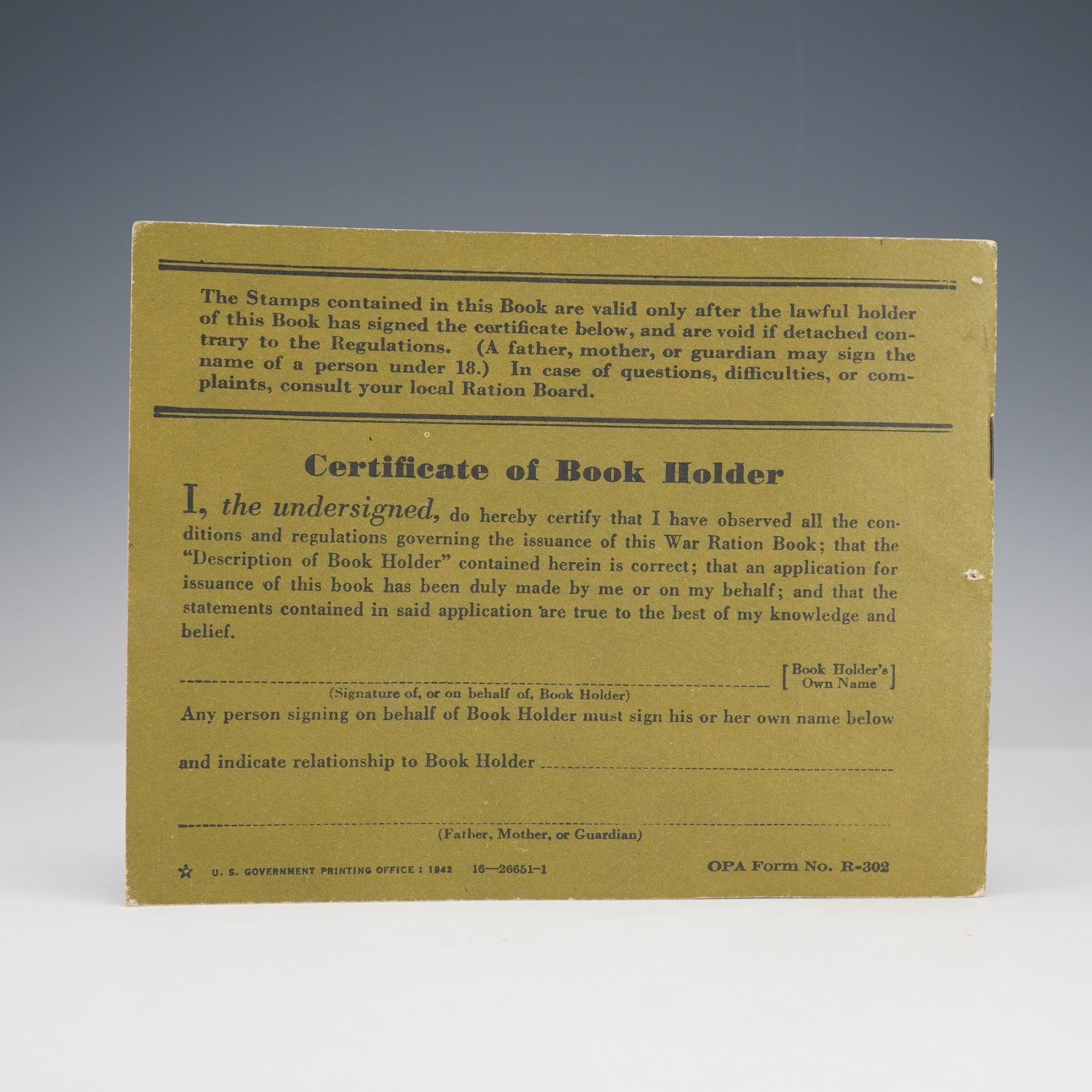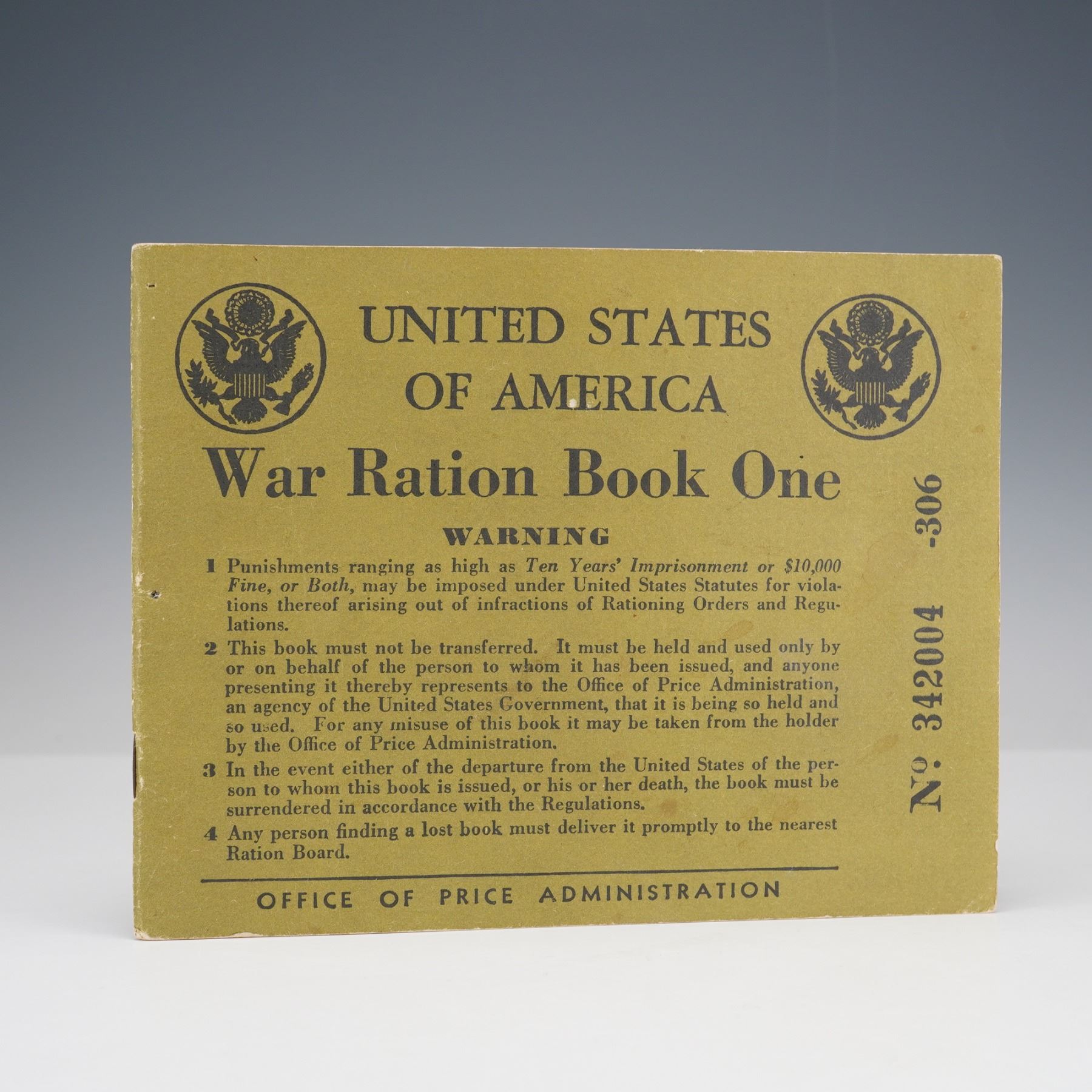 An evocative trio of mid-century and modern American ephemera comprising a 1943 U.S. Office of Price Administration War Ration Book One, issued during World War II for civilian food and goods distribution; a Stompin' at La Ronde - Welcome to the 40's booklet referencing 1940s culture and popular music with printed period lyrics; and two sealed packs of Operation Desert Shield/Desert Storm trading cards by Topps and Pacific Trading Cards, including depictions of President George H. W. Bush as The Commander in Chief and the U.S. Navy EA-6B Prowler aircraft. Model No. R-302.