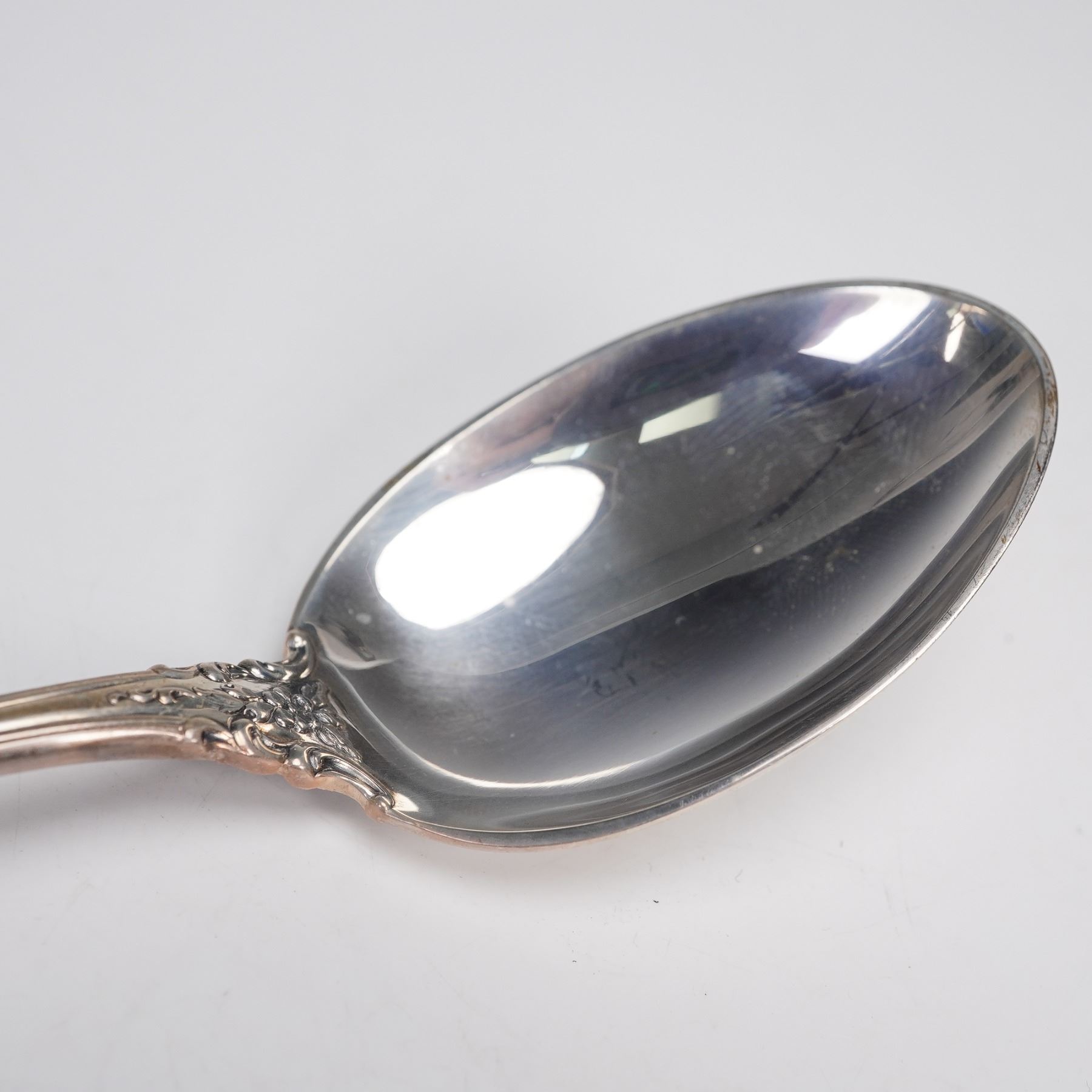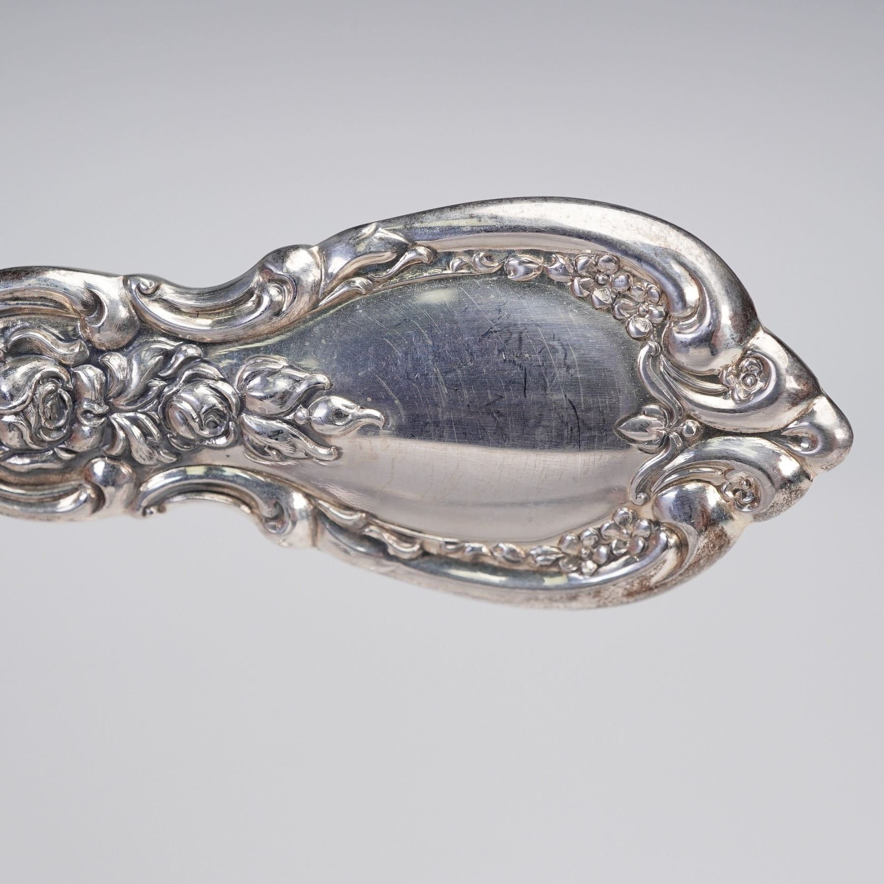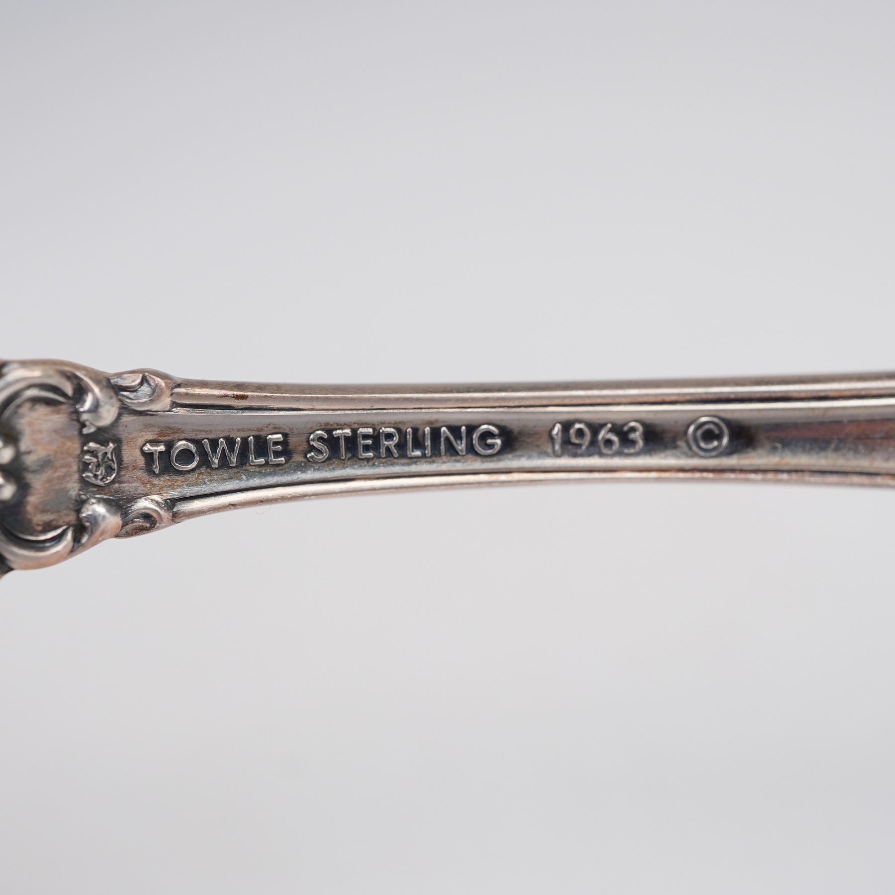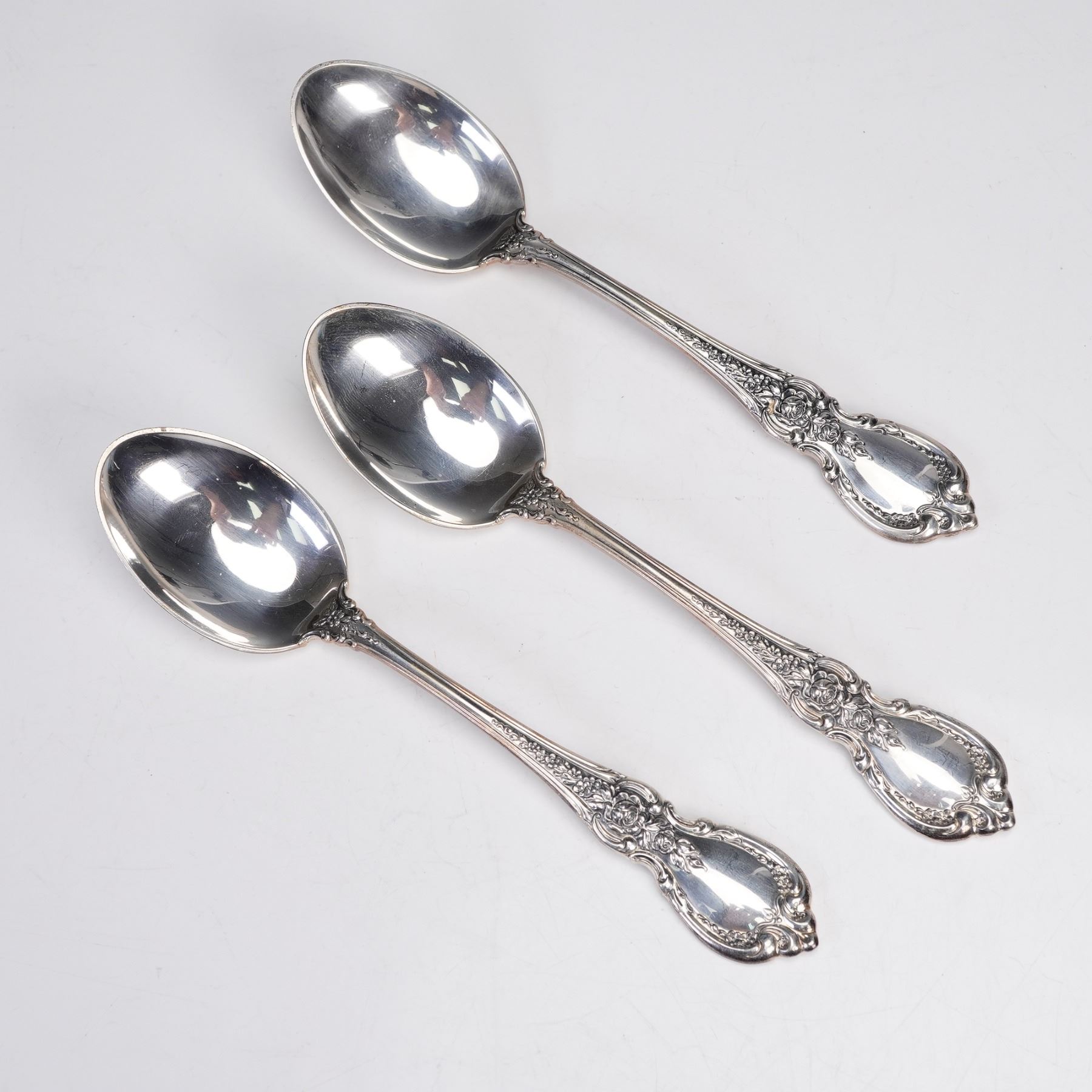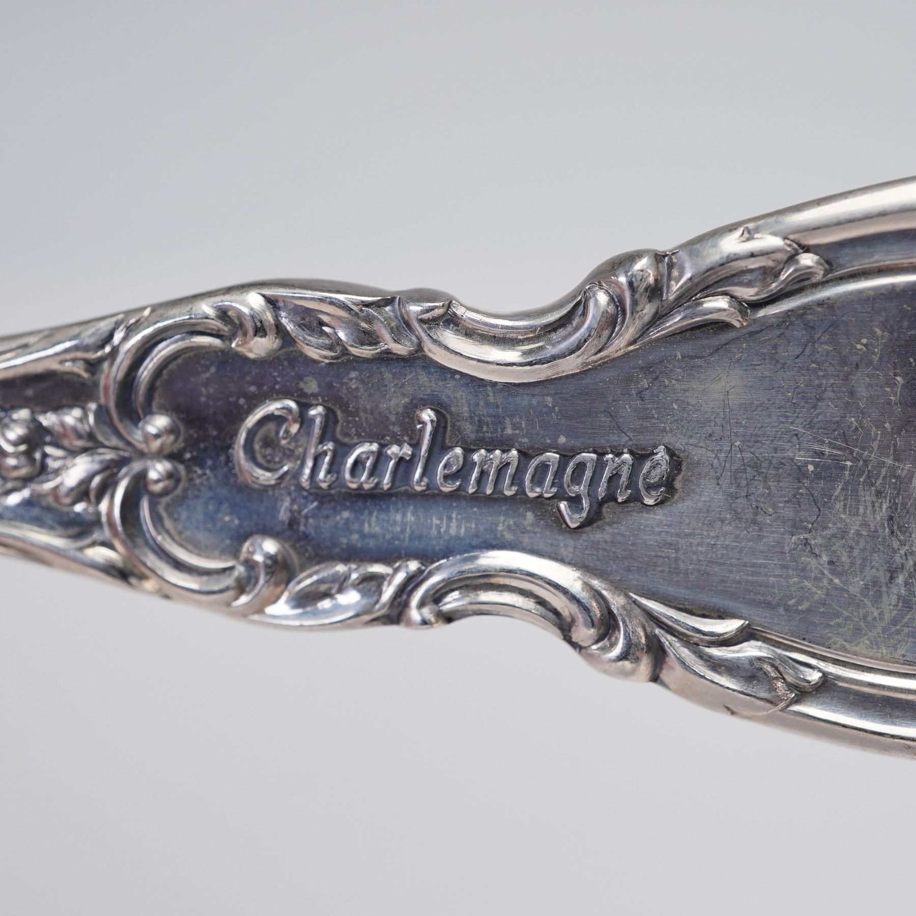 Set of three Towle Charlemagne sterling silver spoons, each crafted in the ornate Charlemagne pattern introduced in 1963. The handles feature raised floral and scroll motifs with detailed repousse work, showcasing the characteristic Towle craftsmanship. Each spoon is marked Towle Sterling 1963 with the Charlemagne pattern name on the reverse, confirming authenticity and silver content. The bowls are of standard oval form with a smooth polished finish. The net silver is 3..993ozt.