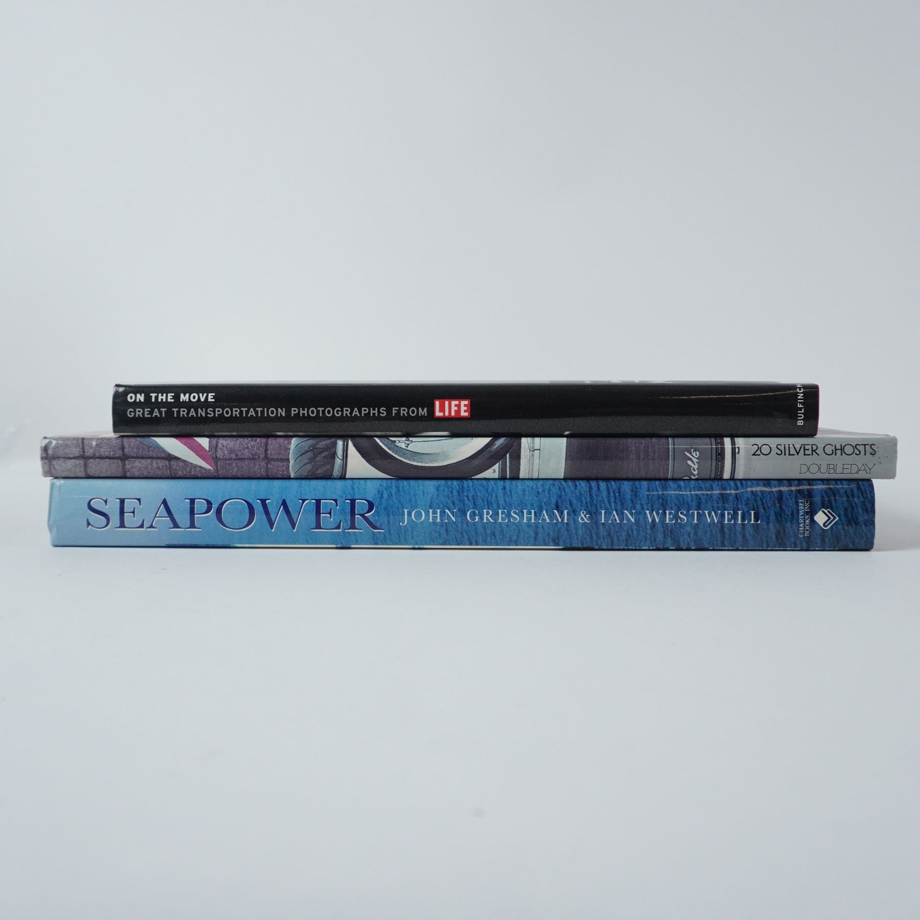 This collection of three books explores the evolution of transportation and naval dominance. Seapower by John D. Gresham and Ian Westwell examines the history and strategic impact of naval forces around the world. 20 Silver Ghosts showcases the most exquisite Rolls-Royce automobiles, featuring stunning photography and historical insights. On the Move by LIFE Magazine presents a visual journey through the history of transportation, from steam locomotives to modern innovations. A must-have set for automotive enthusiasts, naval history buffs, and collectors of transportation history. Largest book measures 17"W.