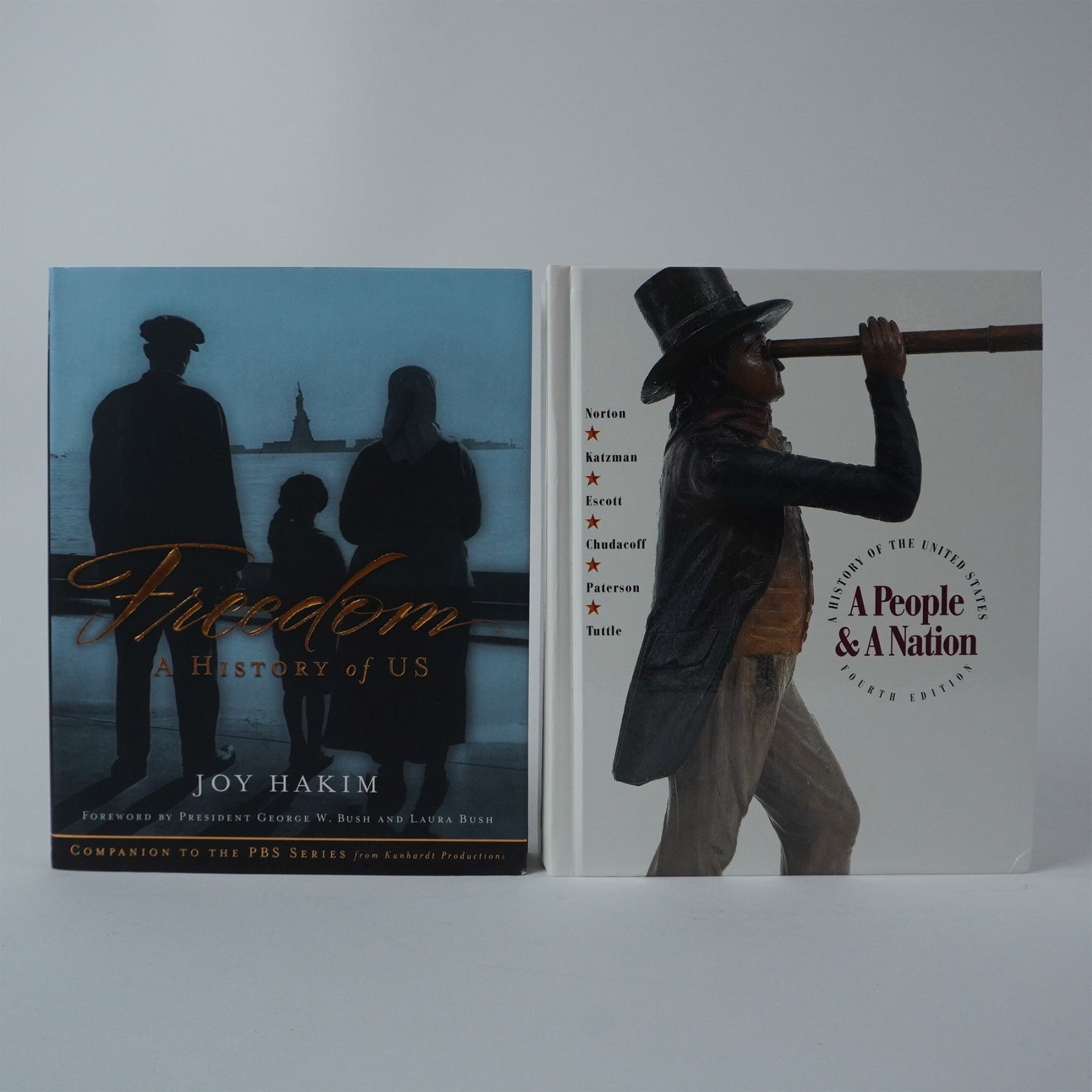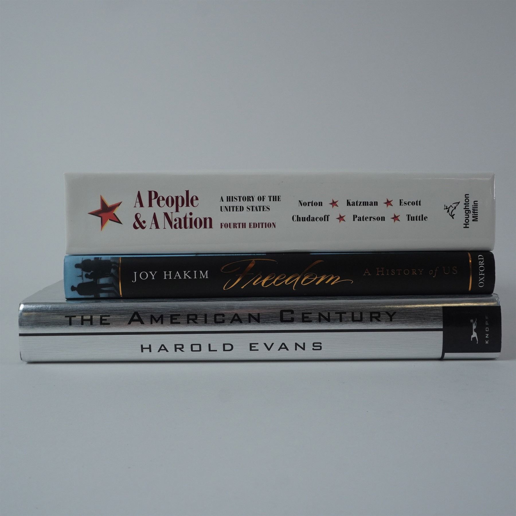 This collection includes three hardcover books that explore different aspects of U.S. history. A People & A Nation: A History of the United States (Fourth Edition), authored by Norton, Katzman, Escott, Chudacoff, Paterson, and Tuttle, provides a comprehensive analysis of American history with scholarly insights. Freedom: A History of US by Joy Hakim, published by Oxford University Press, offers a compelling narrative on the evolution of freedom in the United States, presenting key moments and figures that shaped the nation. The American Century by Harold Evans examines the major events and influential personalities that defined Americas role in the 20th century. This set is an excellent resource for historians, students, and collectors interested in the nations past. Largest book measures 11.5"H.