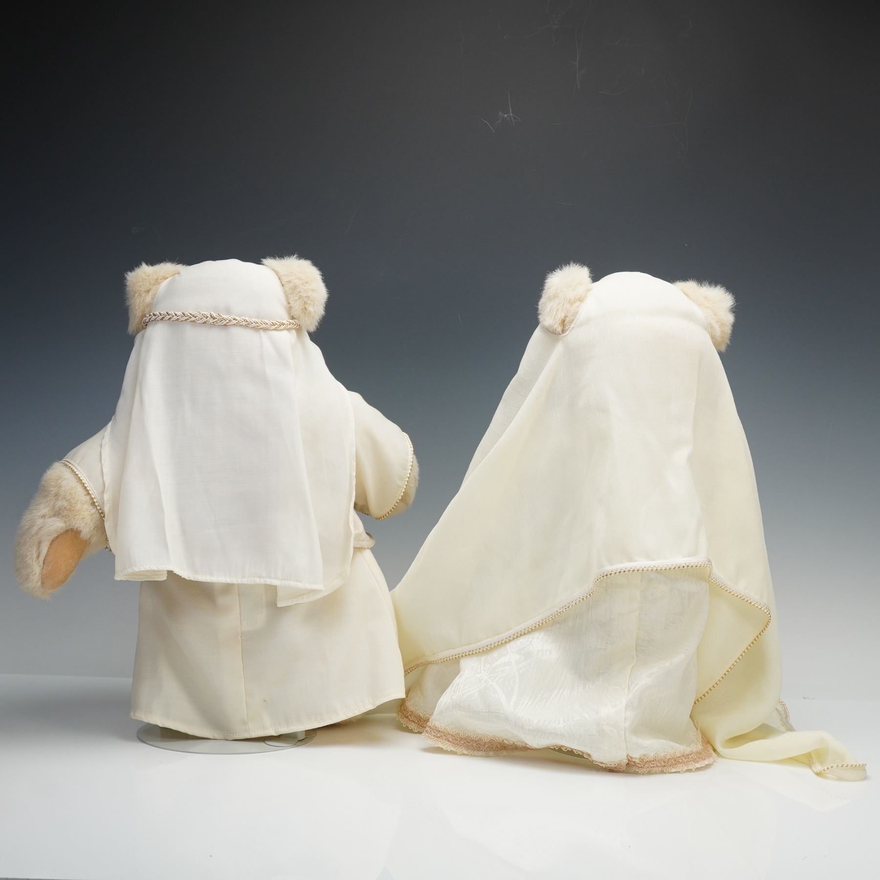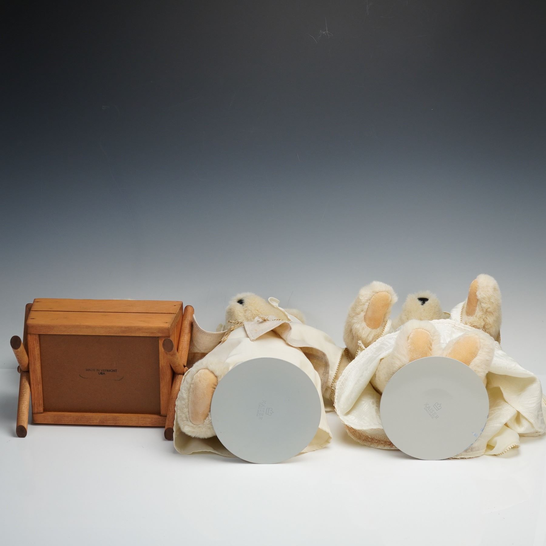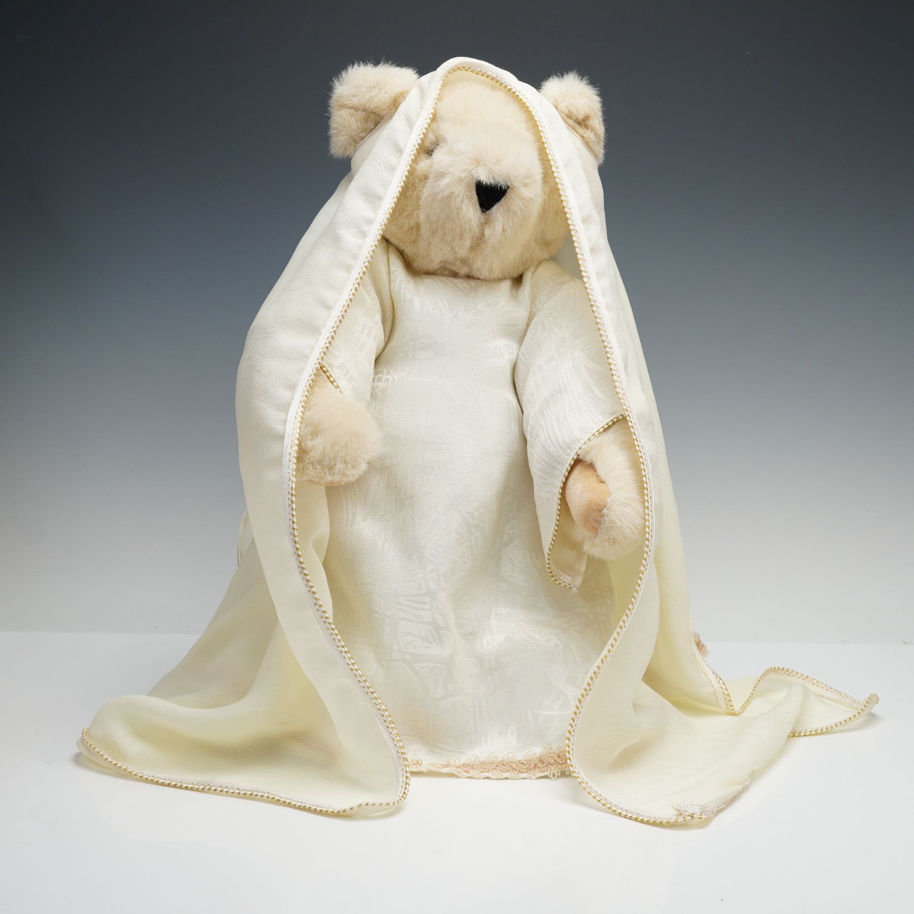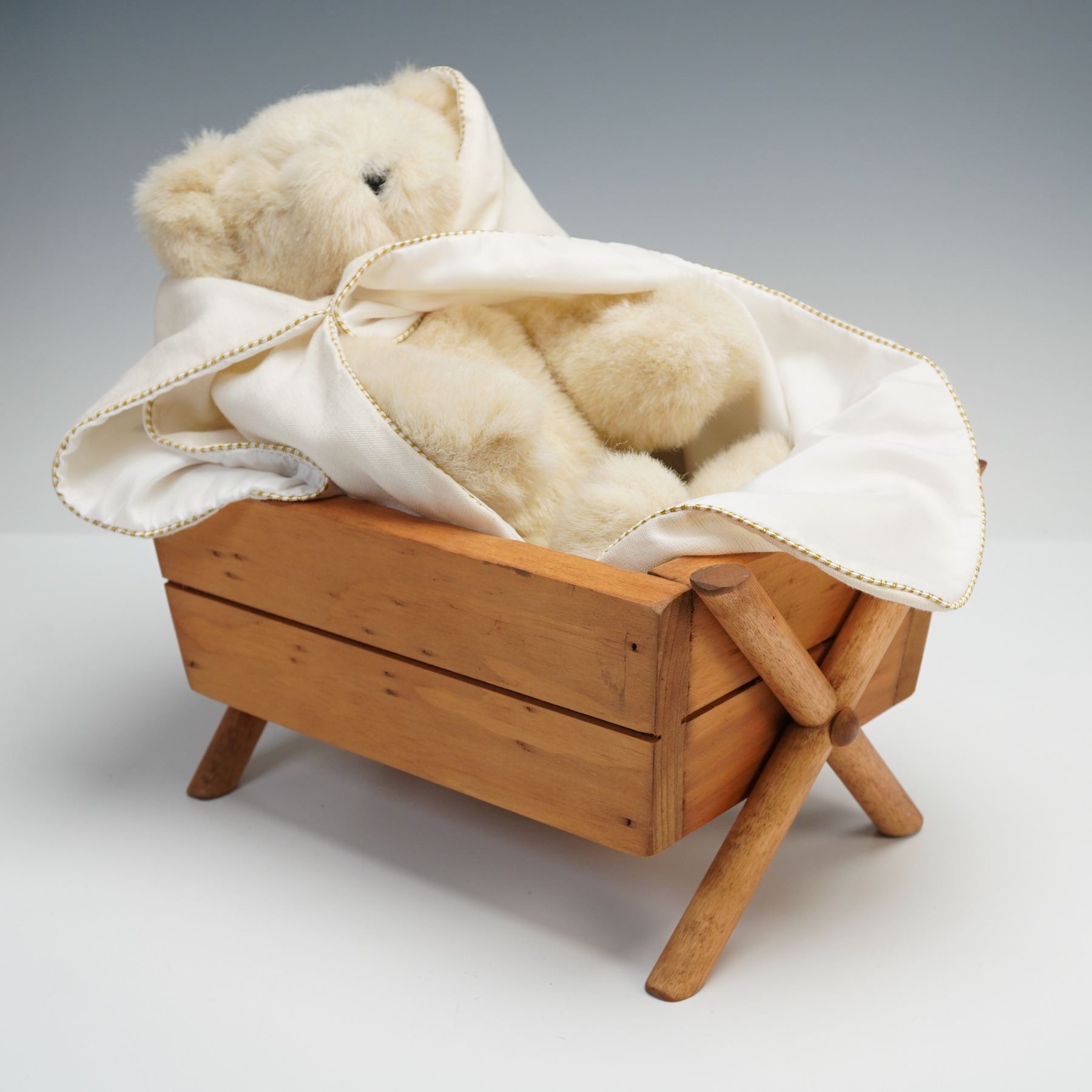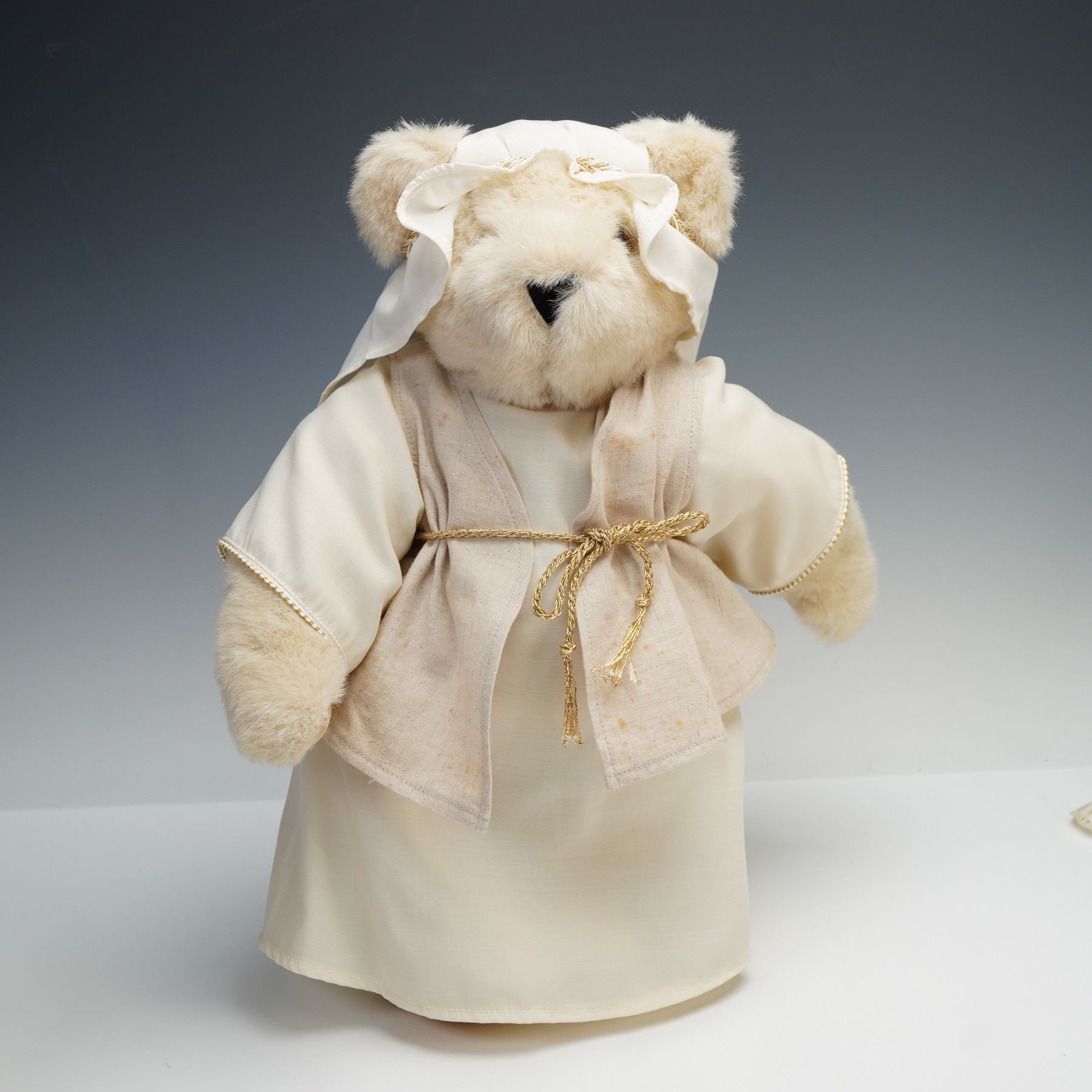 3 piece group with manger, 4 pieces total, depicting the nativity scene crafted by the Vermont Teddy Bear Company. Includes plush representations of Mary, Joseph, and baby Jesus in a wooden manger. Each bear is dressed in coordinated cream robes accented with gold-toned trim and retains its original Vermont Teddy Bear tag. Mary and Joseph come with stands for display, each stand marked Kaiser.