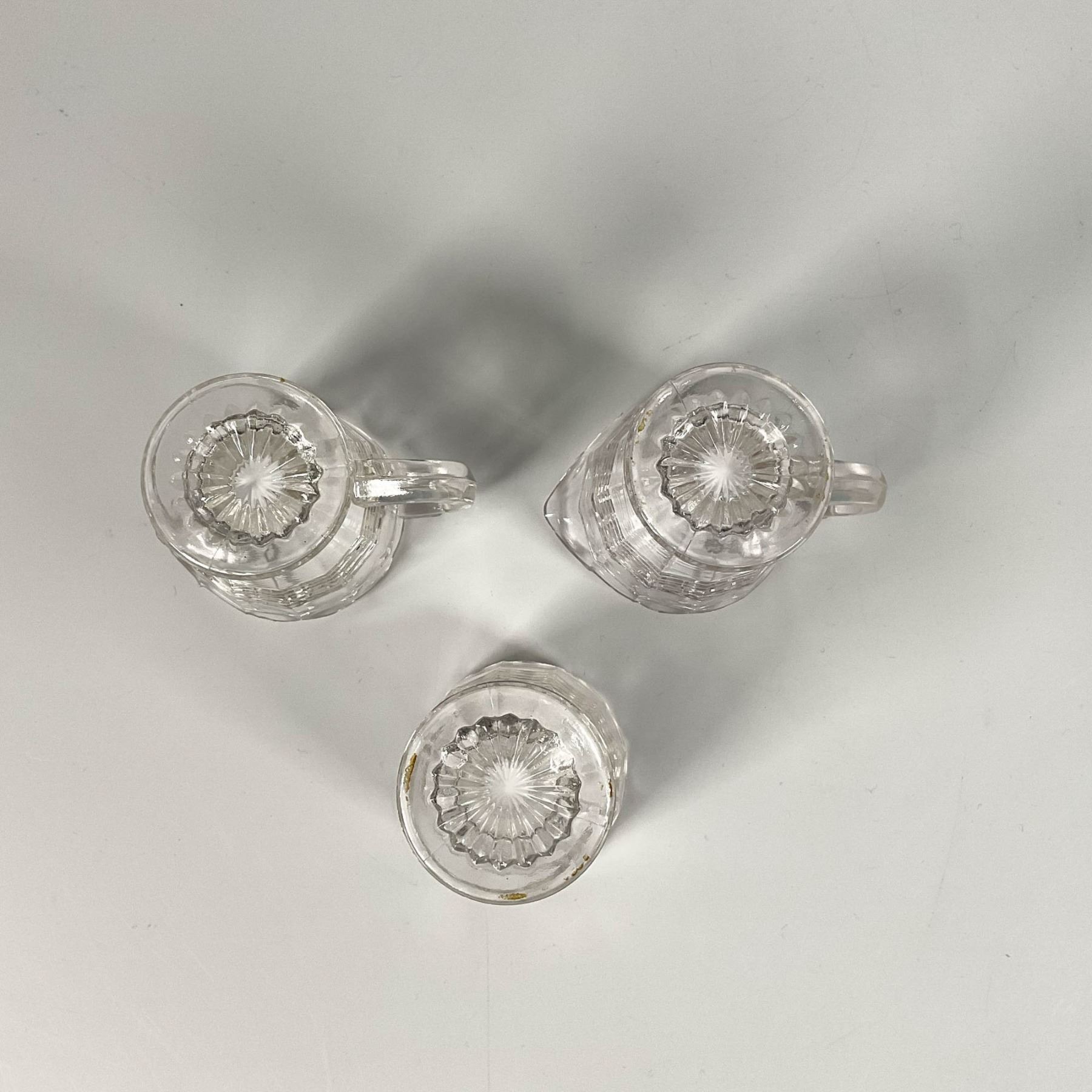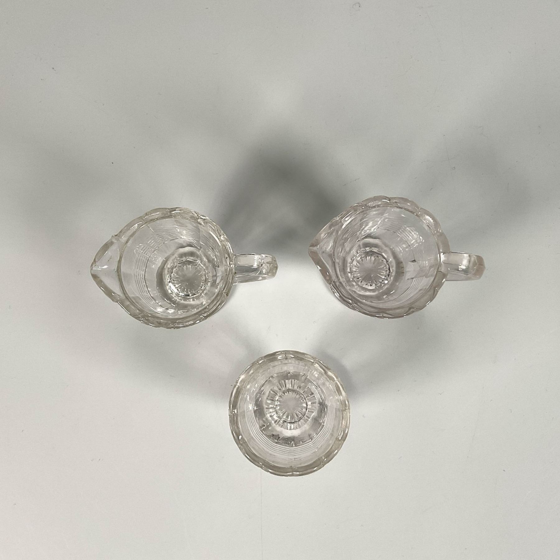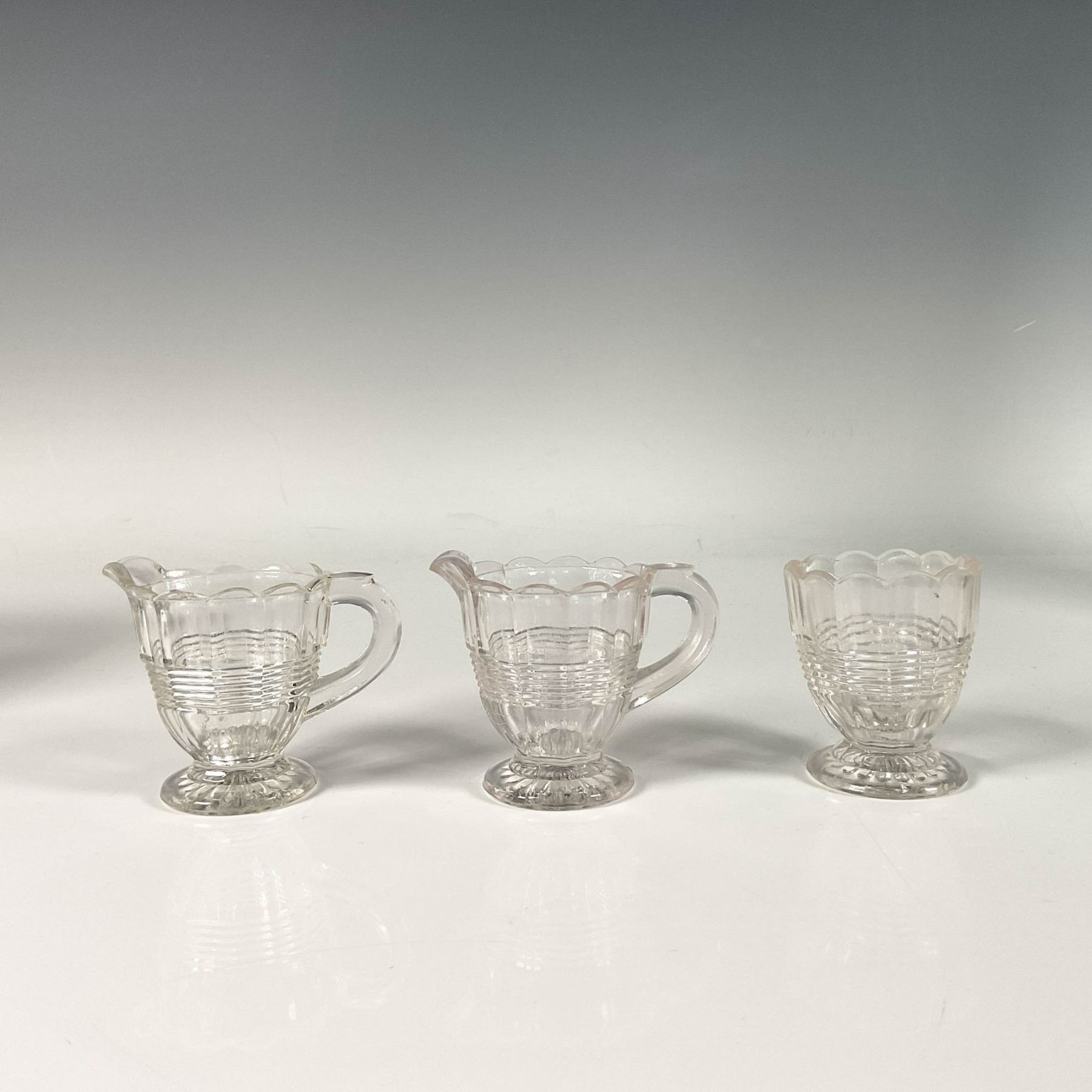Featuring floral shaped rims and a line pattern in the center as accents, includes two creamers and a spooner. Creamer: 3"L x 2"W x 2.5"H. Spooner: 1.75"W x 2.25"H