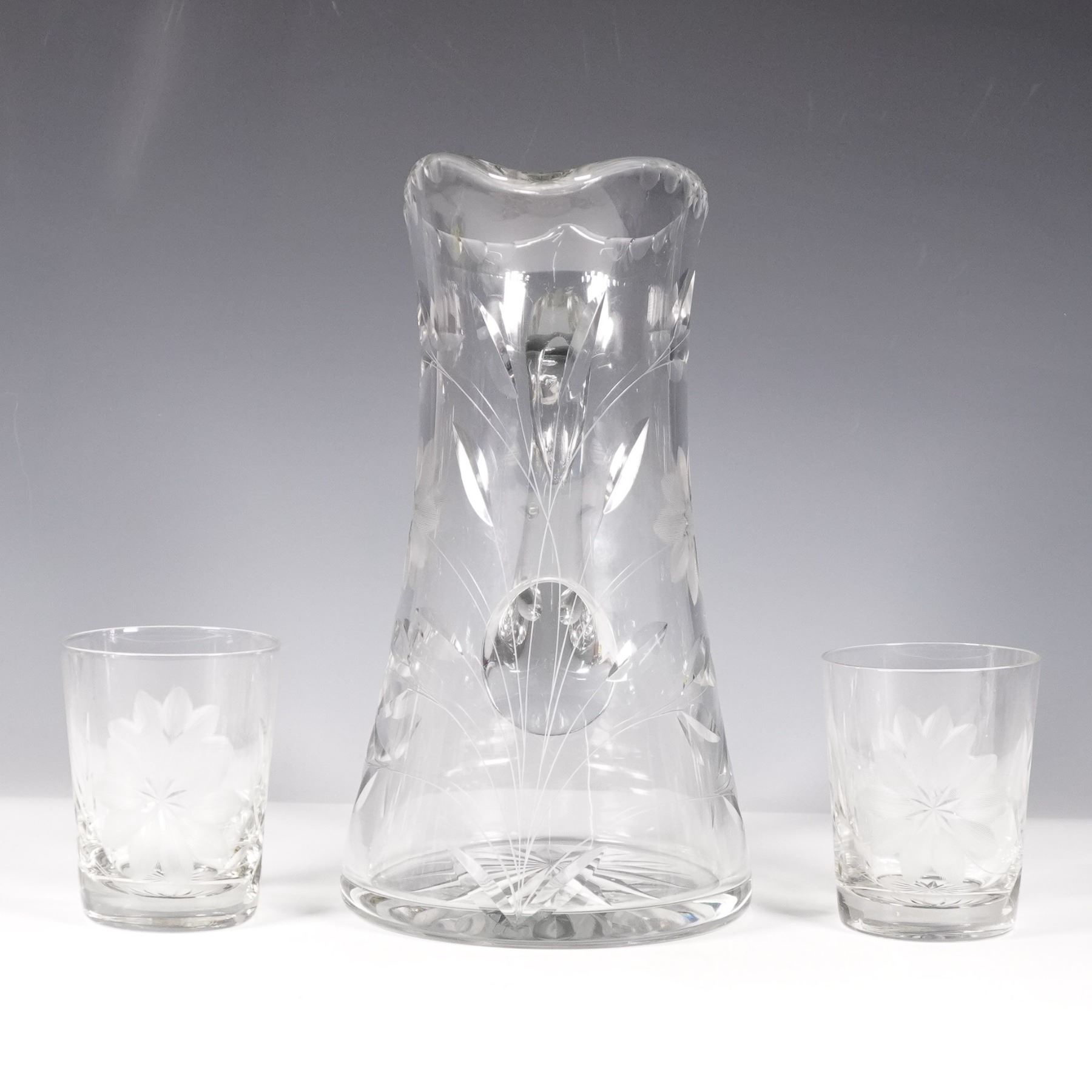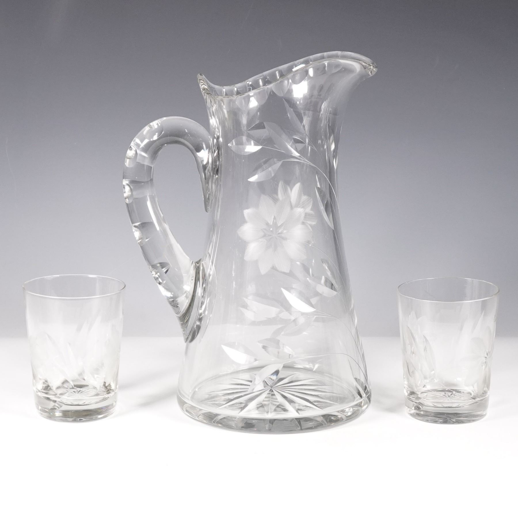 Clear glass jug with two matching cups featuring etched floral decorations. The jug has a wide, curved spout and a sturdy handle with faceted detailing. The body is adorned with frosted floral motifs surrounded by delicate foliate accents. The cups have a complementary design with matching etched floral patterns. The bases of all pieces are finished with a starburst cut. Jug: 8"L x 5.75"W x 10.75"H. Cup: 3"W x 3.75"H.