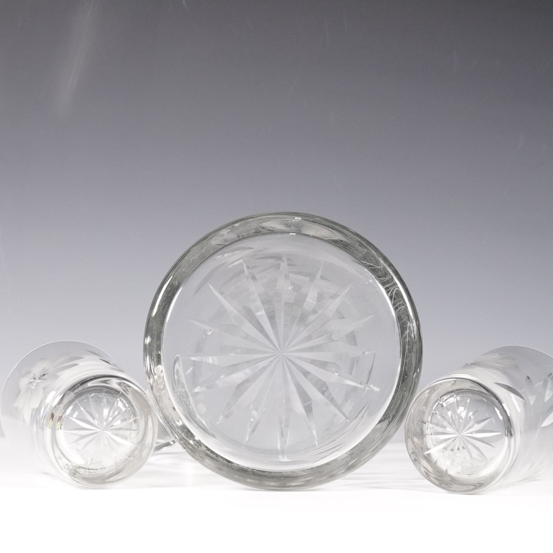 Clear glass jug with two matching cups featuring etched floral decorations. The jug has a wide, curved spout and a sturdy handle with faceted detailing. The body is adorned with frosted floral motifs surrounded by delicate foliate accents. The cups have a complementary design with matching etched floral patterns. The bases of all pieces are finished with a starburst cut. Jug: 8"L x 5.75"W x 10.75"H. Cup: 3"W x 3.75"H.