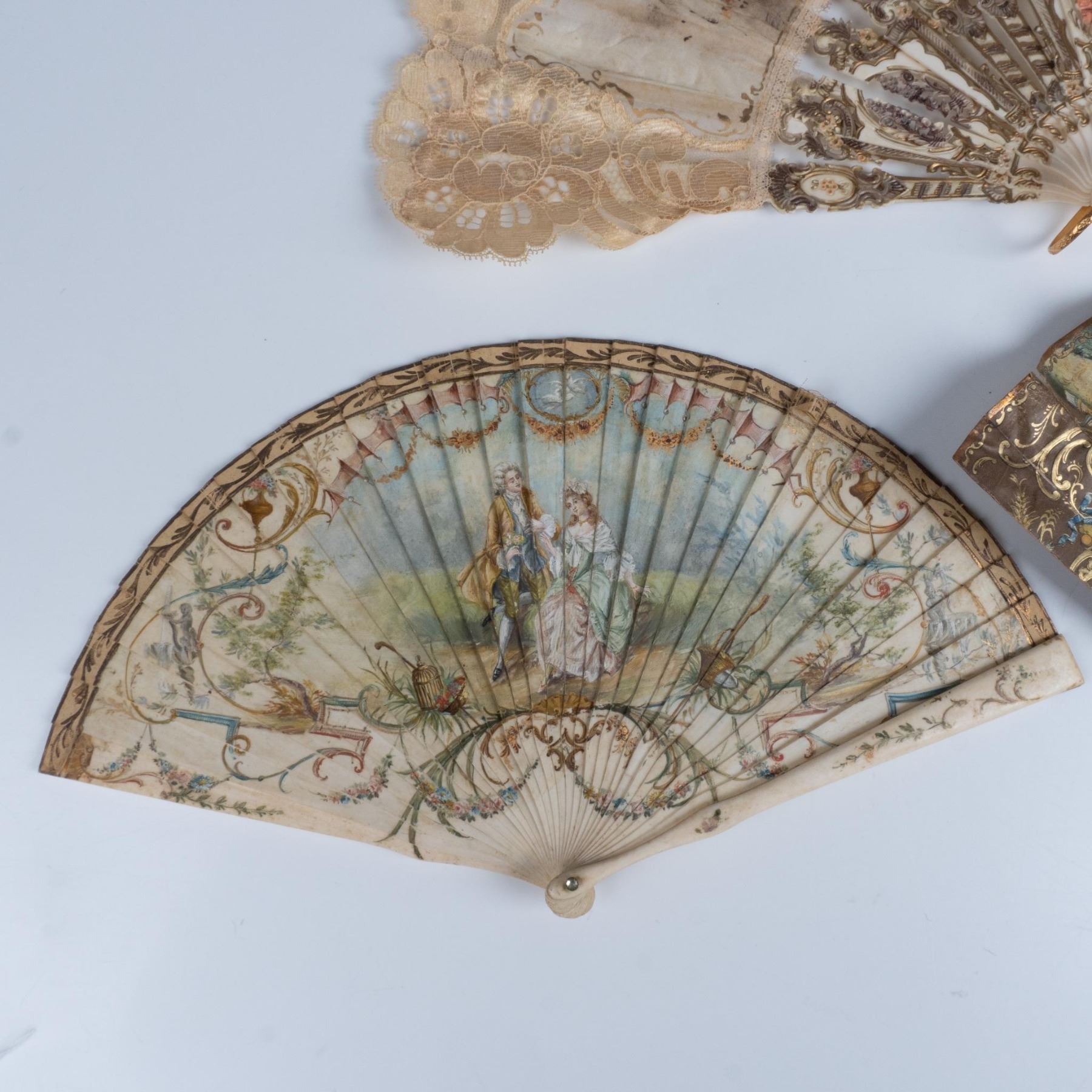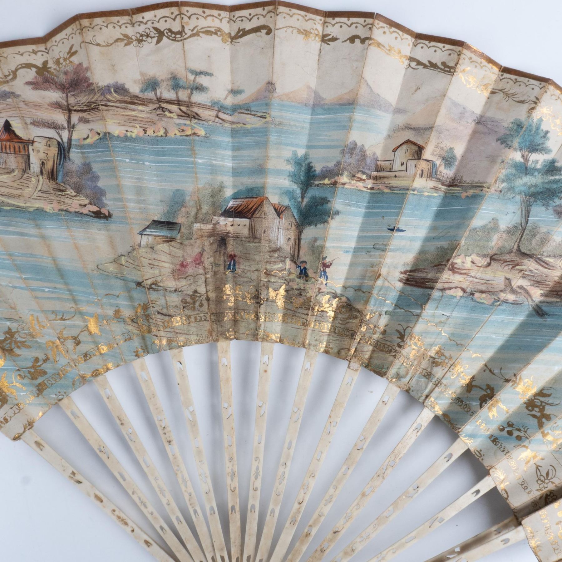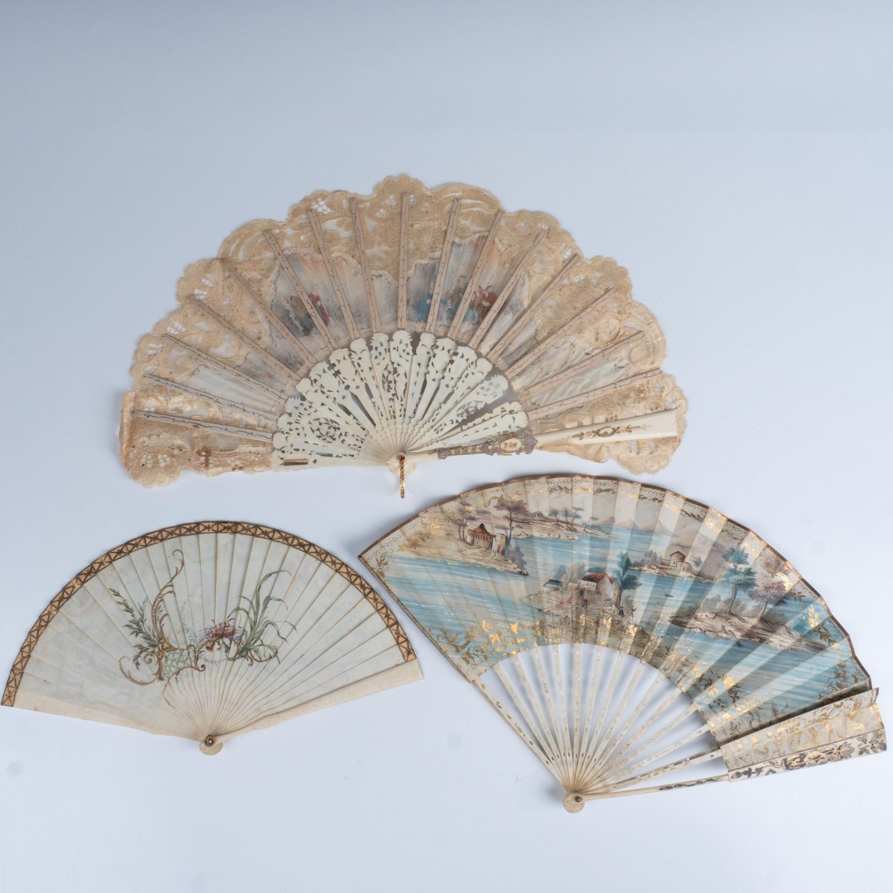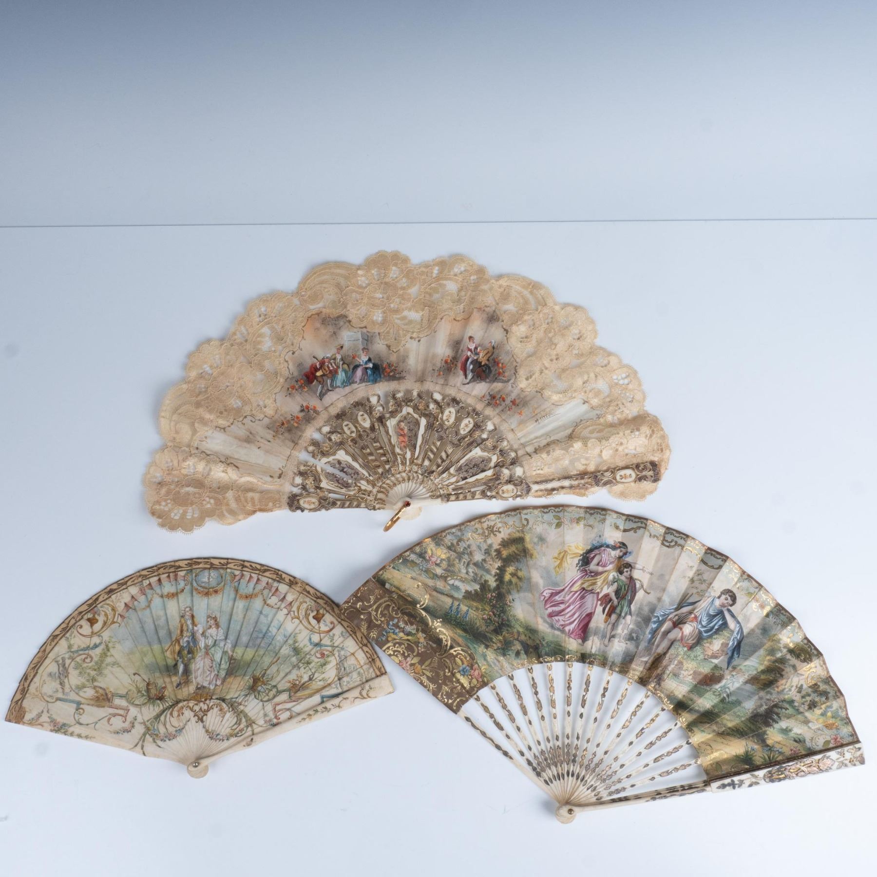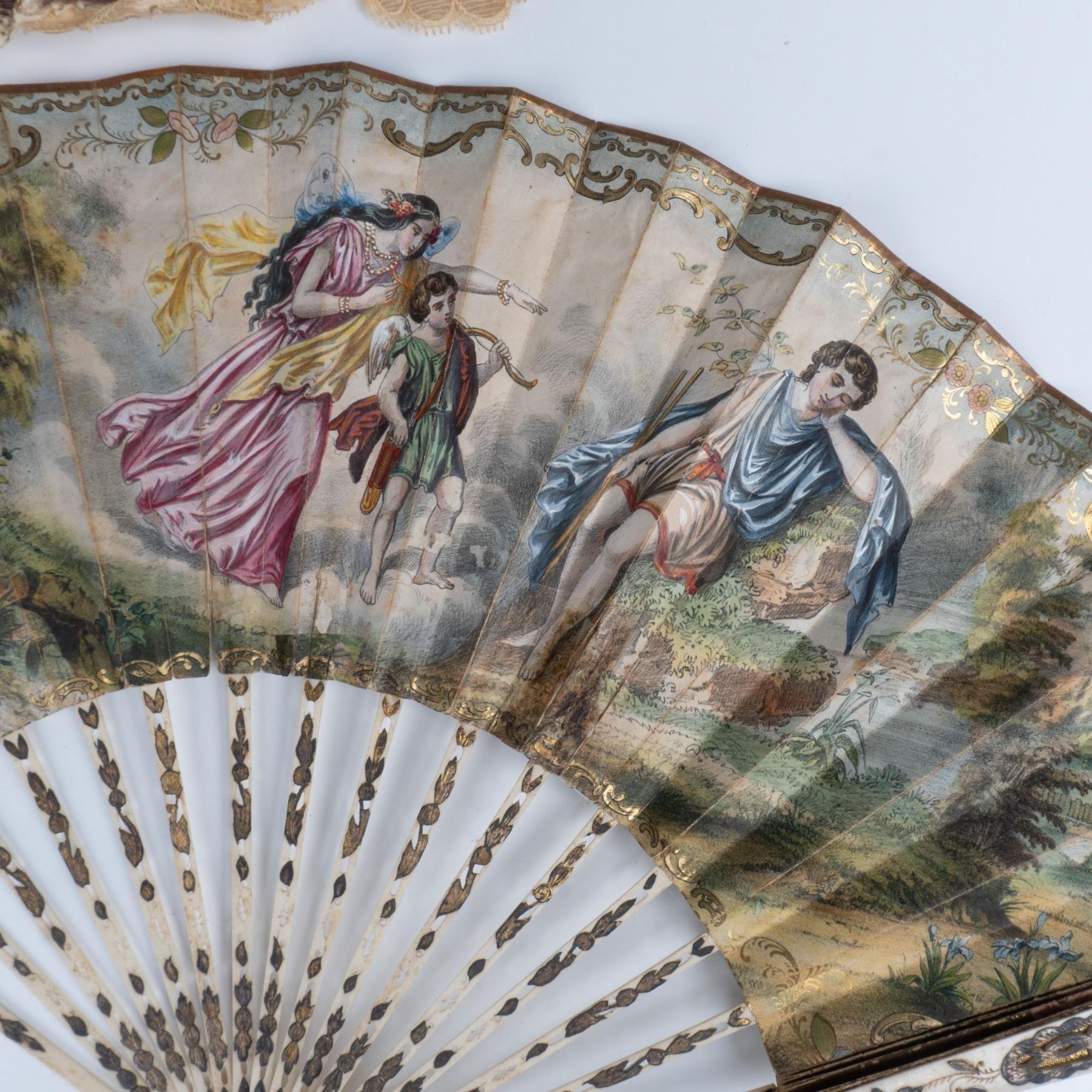 A stunning set of three hand fans, the first adorned with lace and featuring a charming scene of Victorian figures at leisure, the second depicting a Victorian couple in a field, with the man presenting flowers to his beloved on one side and a lovely floral design on the reverse, and the third illustrating a goddess instructing her cherub to strike a man with Cupid's arrow, while the back reveals a serene lakeside village. Lace fan marked M Eiteve. Dimensions of the largest item: 18.25"L x 0.25"W x 10"H.