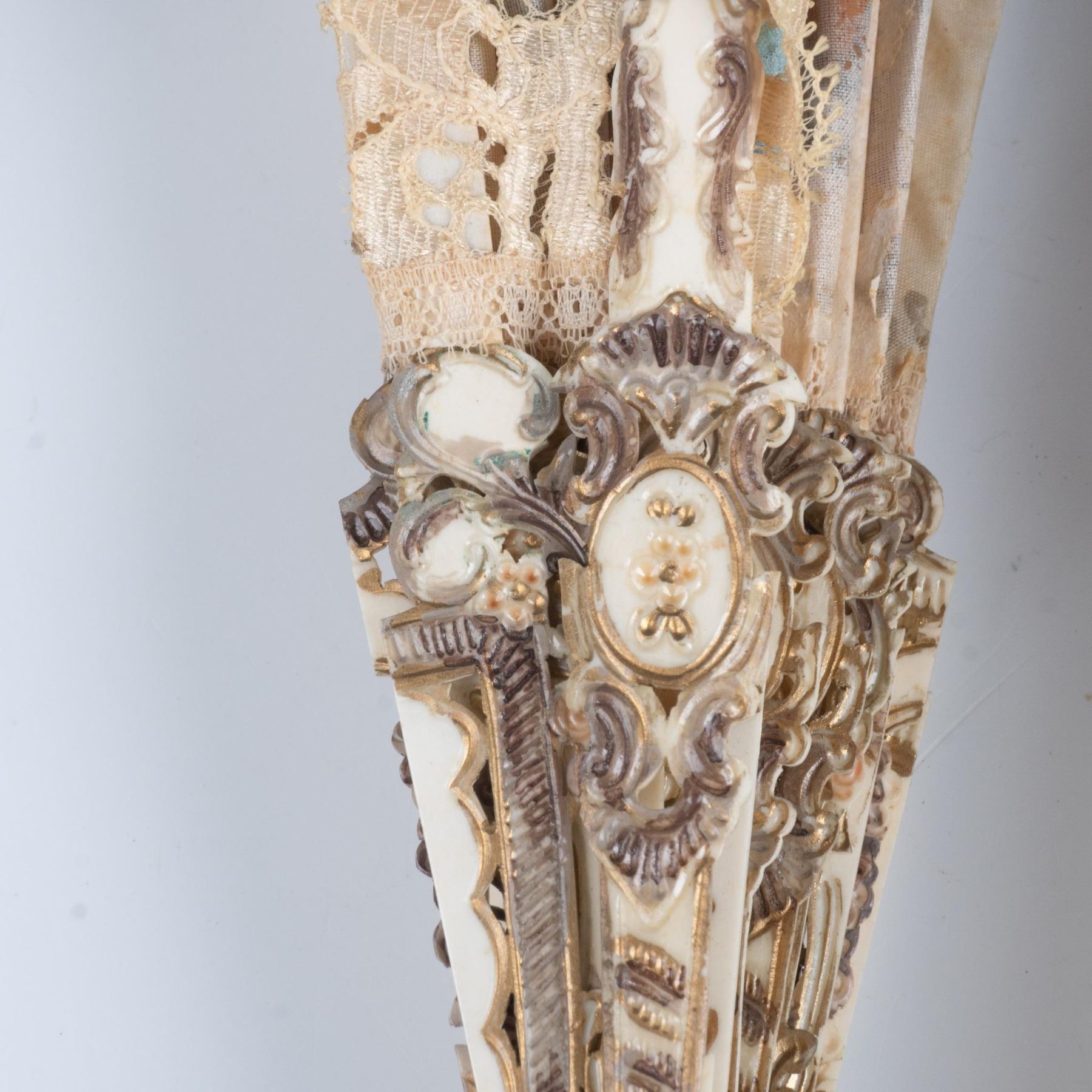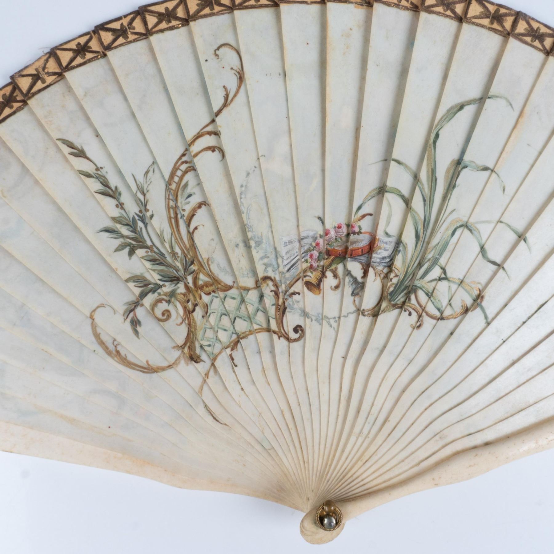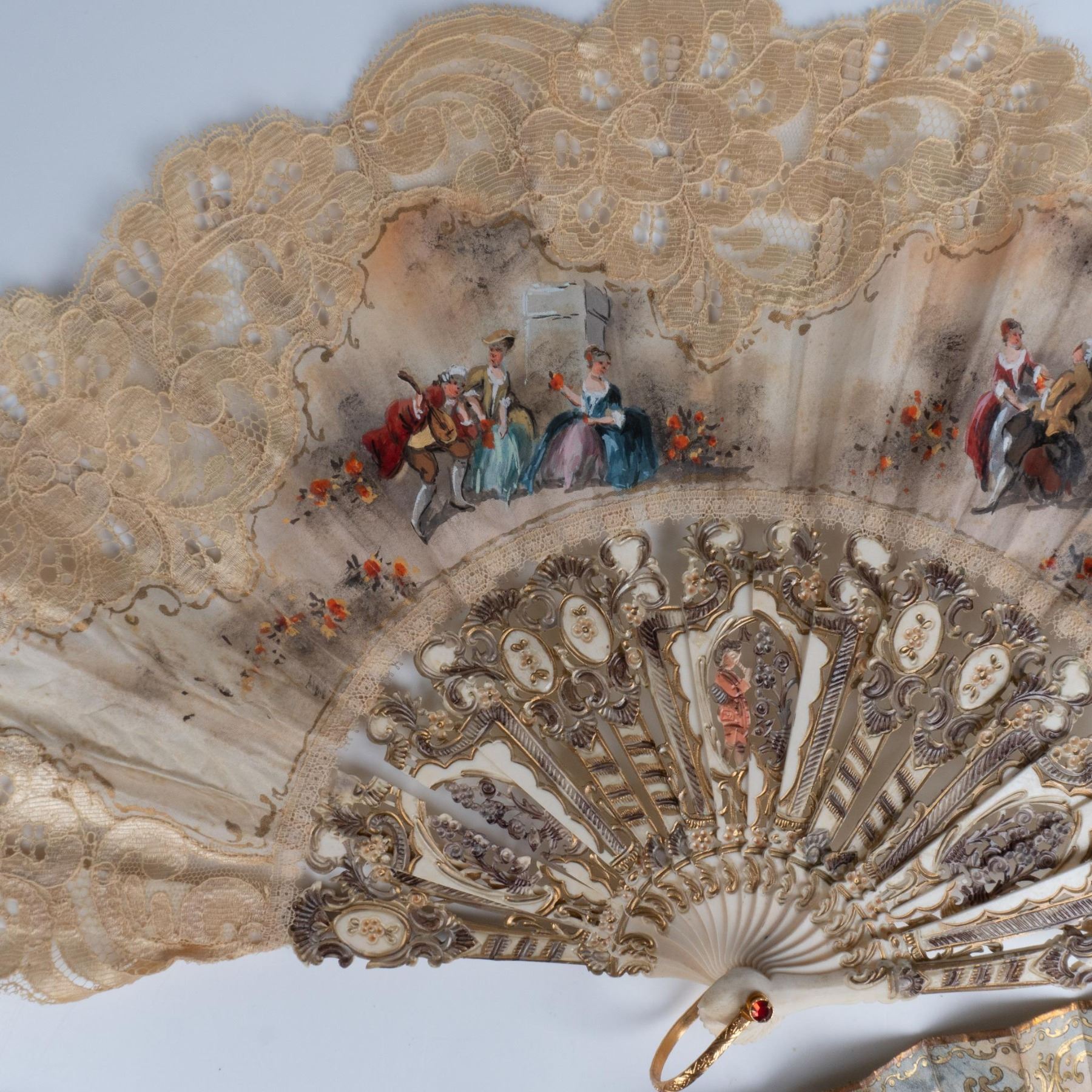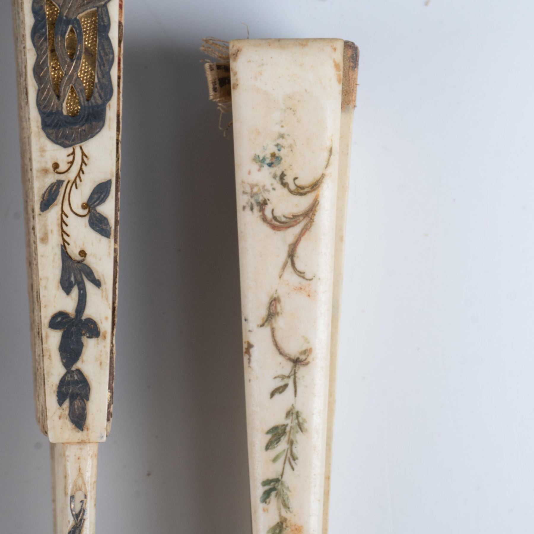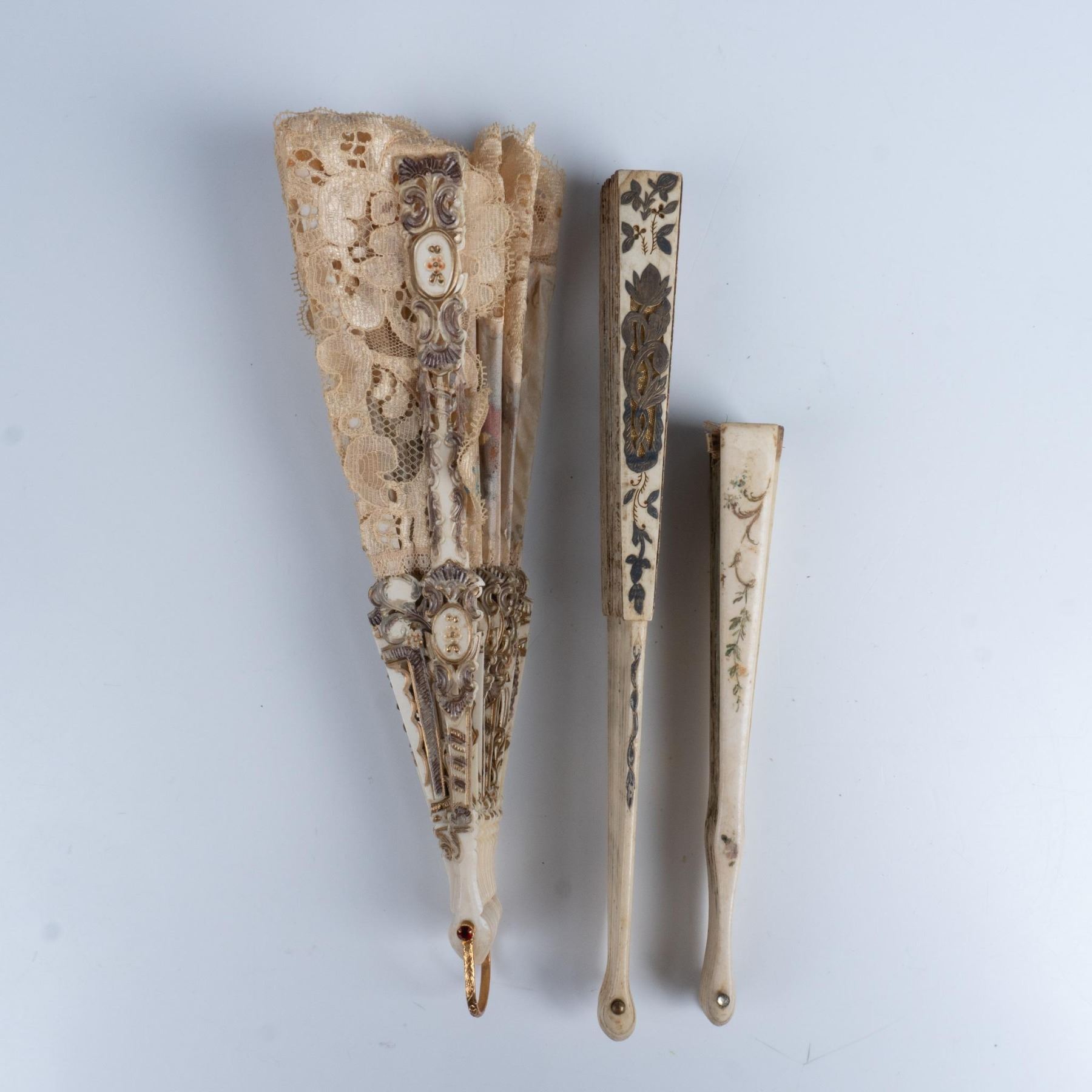 A stunning set of three hand fans, the first adorned with lace and featuring a charming scene of Victorian figures at leisure, the second depicting a Victorian couple in a field, with the man presenting flowers to his beloved on one side and a lovely floral design on the reverse, and the third illustrating a goddess instructing her cherub to strike a man with Cupid's arrow, while the back reveals a serene lakeside village. Lace fan marked M Eiteve. Dimensions of the largest item: 18.25"L x 0.25"W x 10"H.