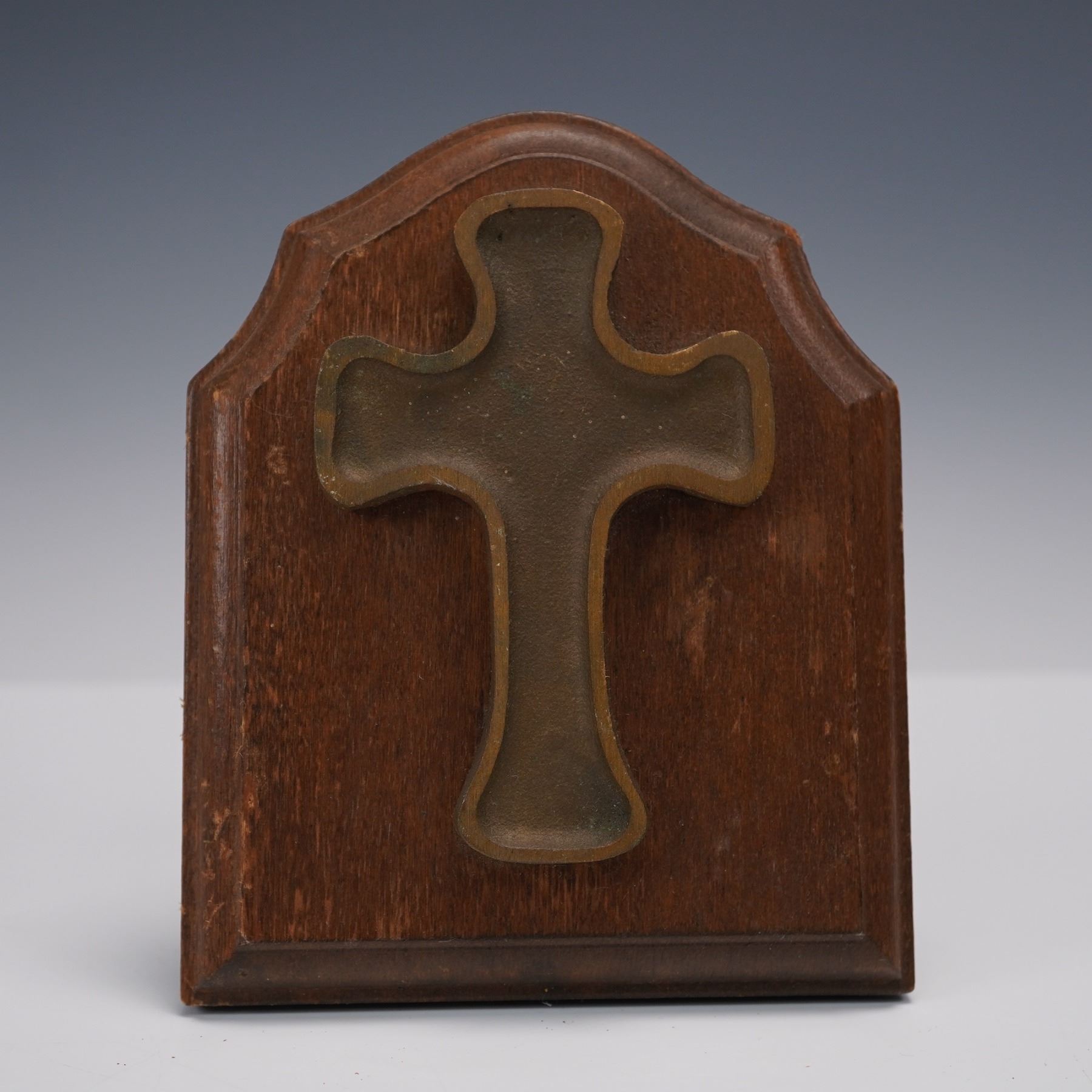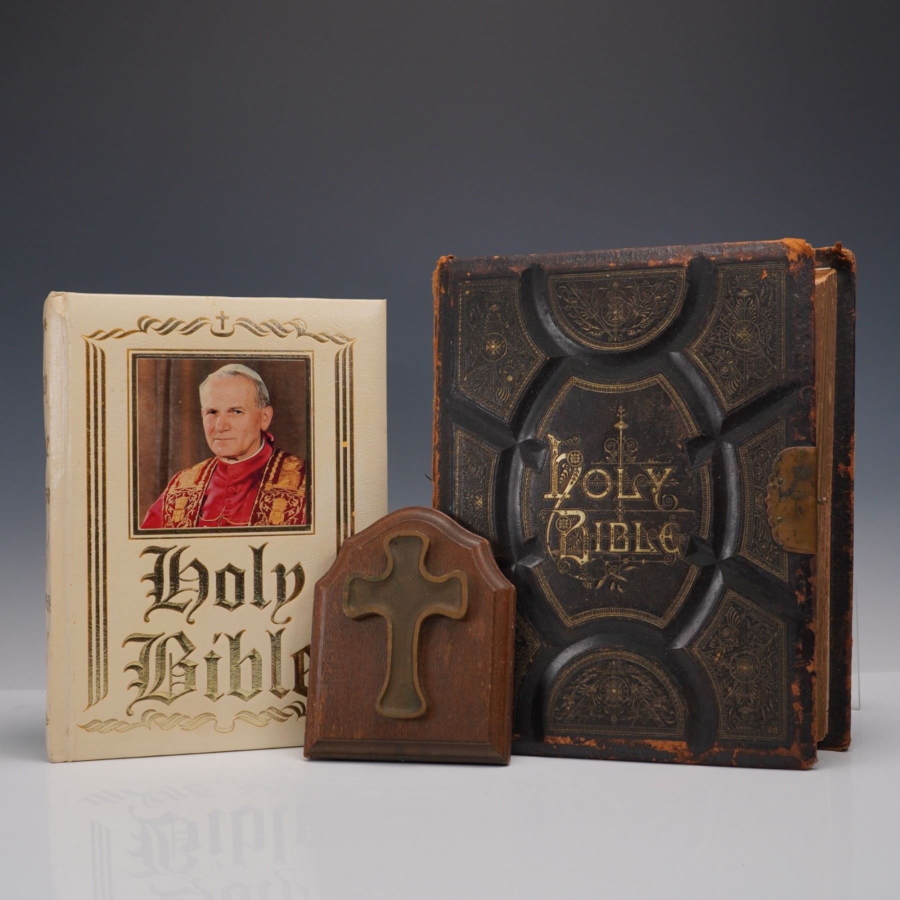 Includes one large vintage "Holy Bible" with ornate embossed black cover, one "Holy Bible Pope John Paul II Edition" in a white padded cover with photo inset, and one small wooden cross plaque. A meaningful grouping for display or spiritual study.