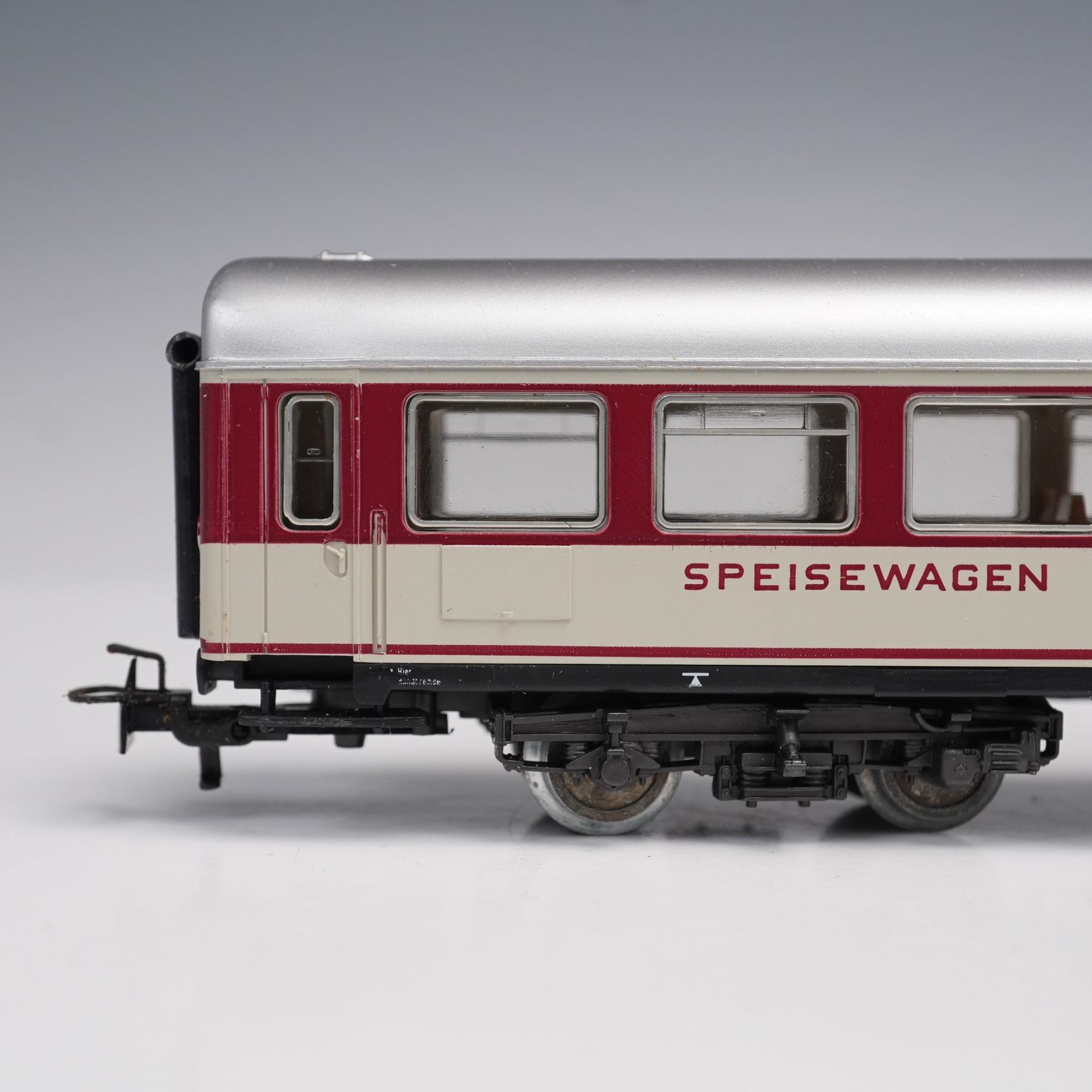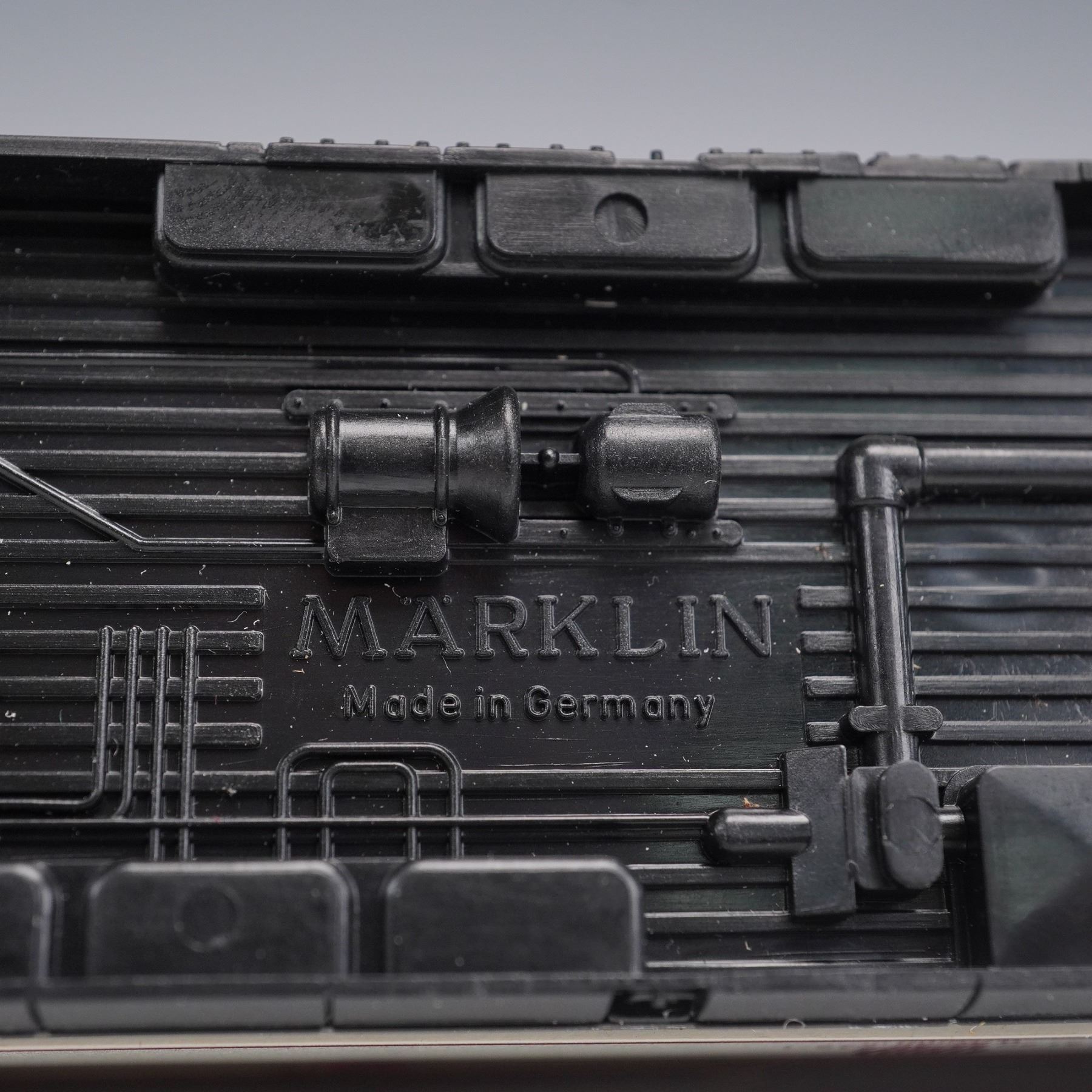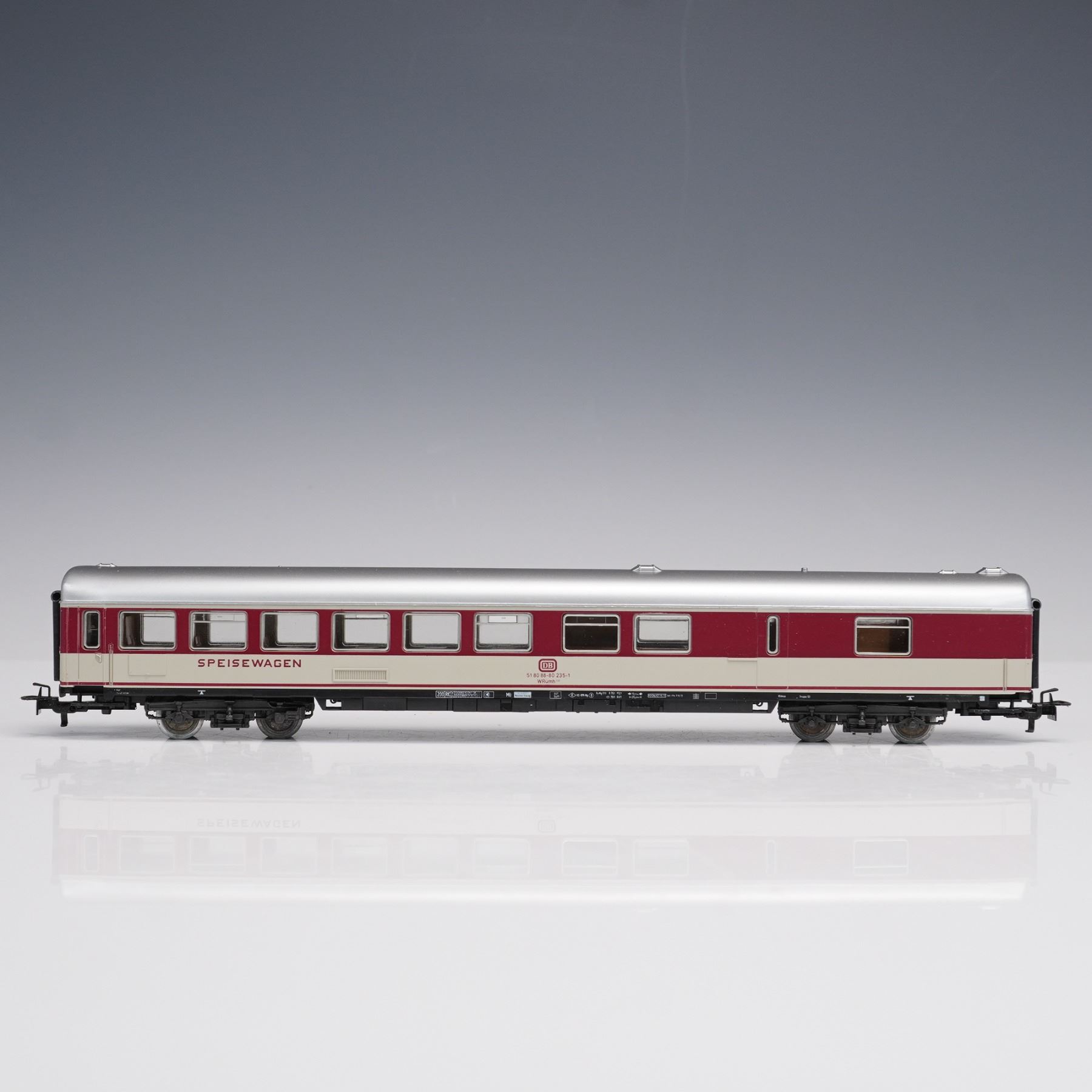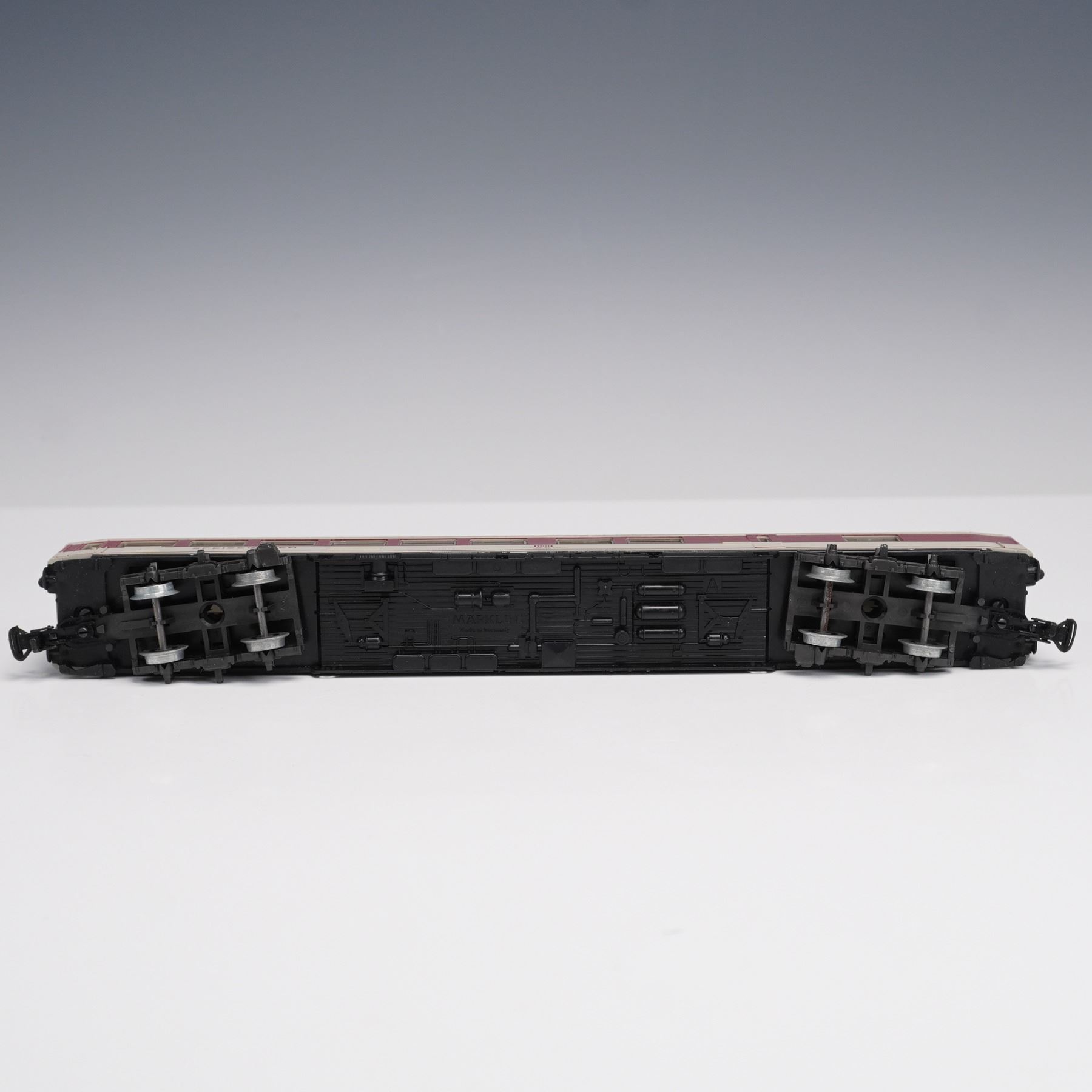 This lot offers three Marklin HO scale German passenger train cars, each crafted with the precision and quality Marklin is renowned for and marked "Marklin - Made in Germany." The set includes two Deutsche Bundesbahn passenger coaches in the classic blue and beige livery, one designated as a first-class coach and the other as a second-class coach, both showcasing finely detailed windows, crisp lettering, and intricate undercarriage components. Accompanying them is a striking dining car, or "Speisewagen," finished in the elegant red and cream livery, complete with authentic graphics and highly detailed mechanical elements beneath. All three cars feature smooth-rolling metal wheels and come in their original blue Marklin boxes, labeled with model numbers 4091, 4092, and 4094. These cars are in excellent cosmetic condition, with only light handling wear visible on the wheels and bases, making them an ideal addition for both collectors and enthusiasts looking to enhance their HO scale layouts with authentic German railway pieces.