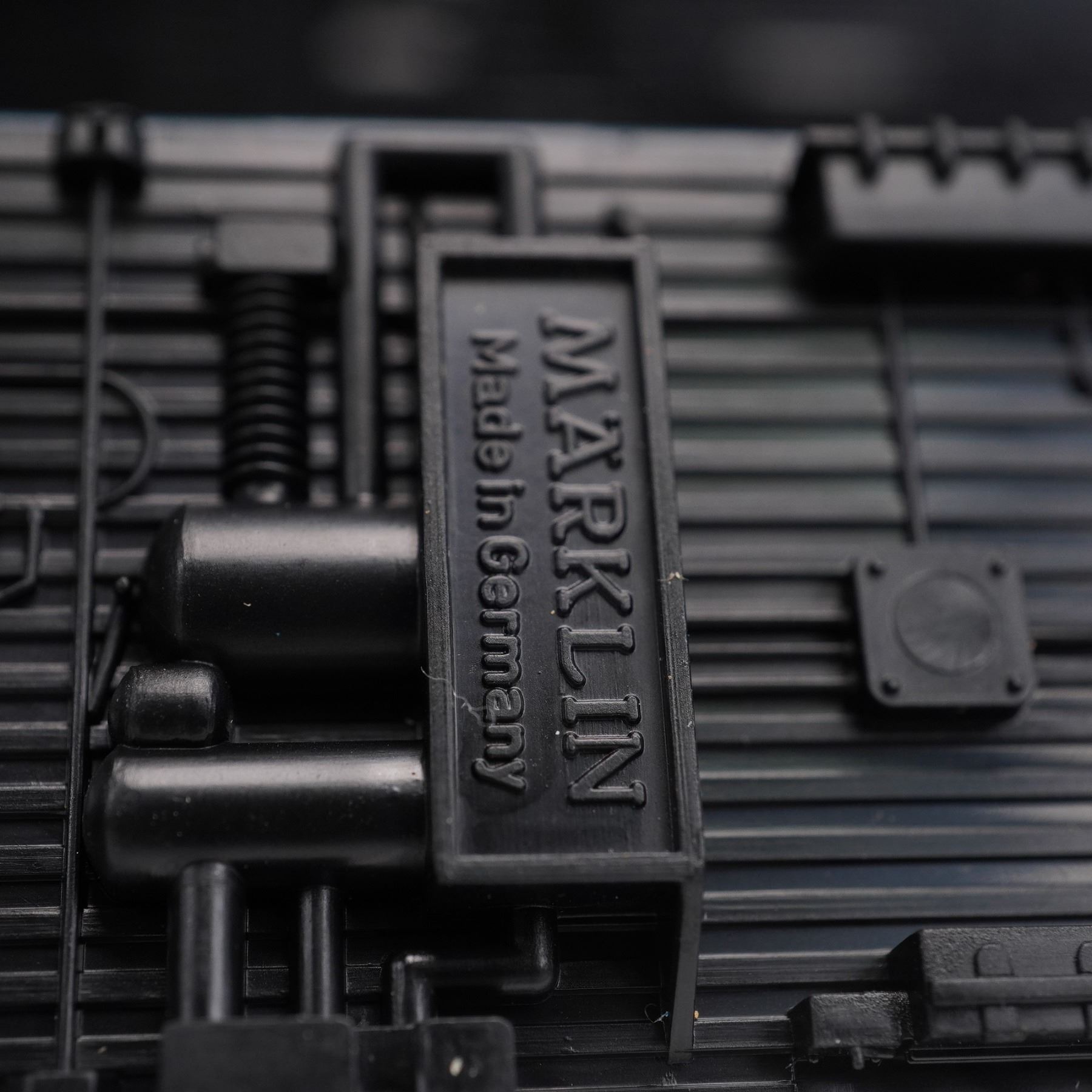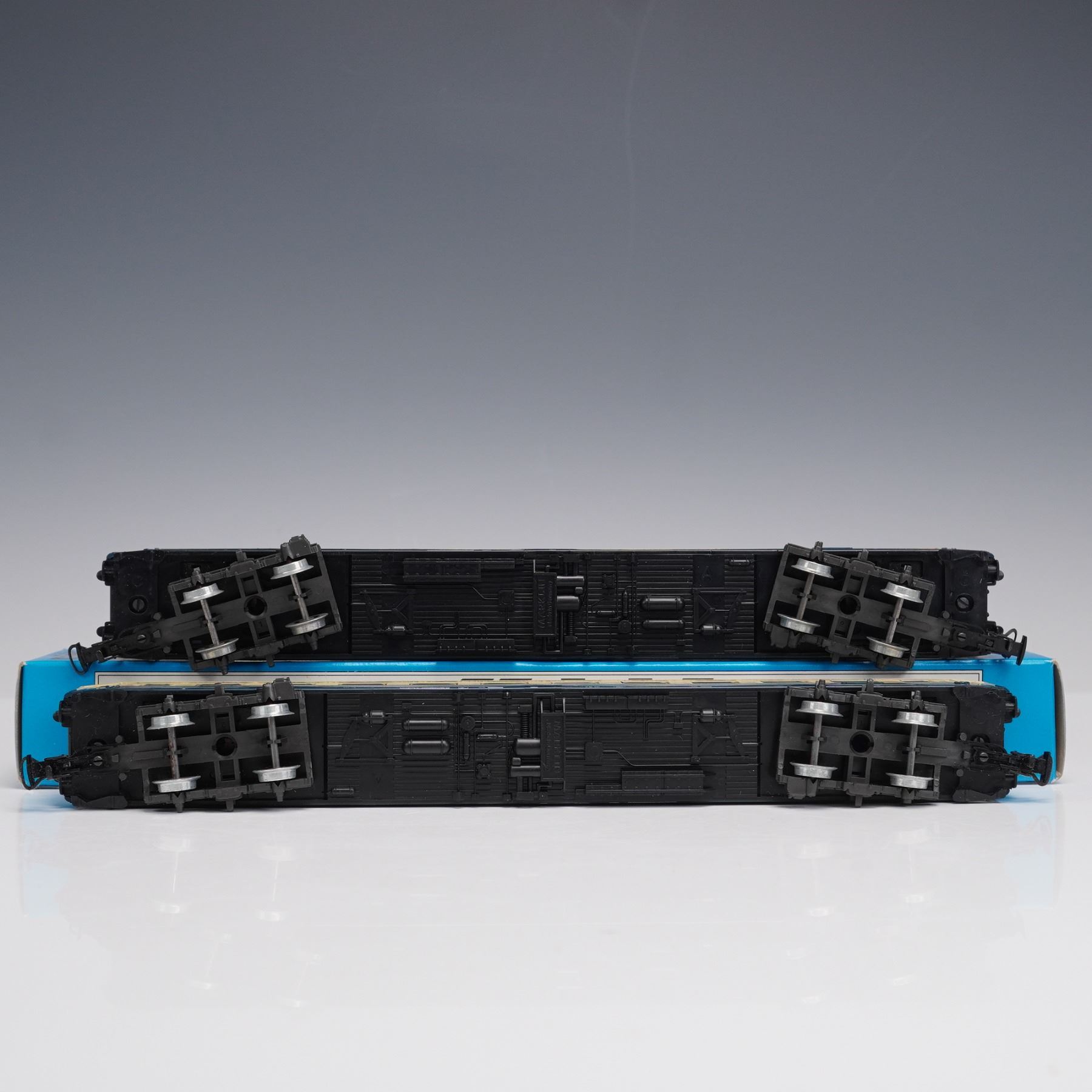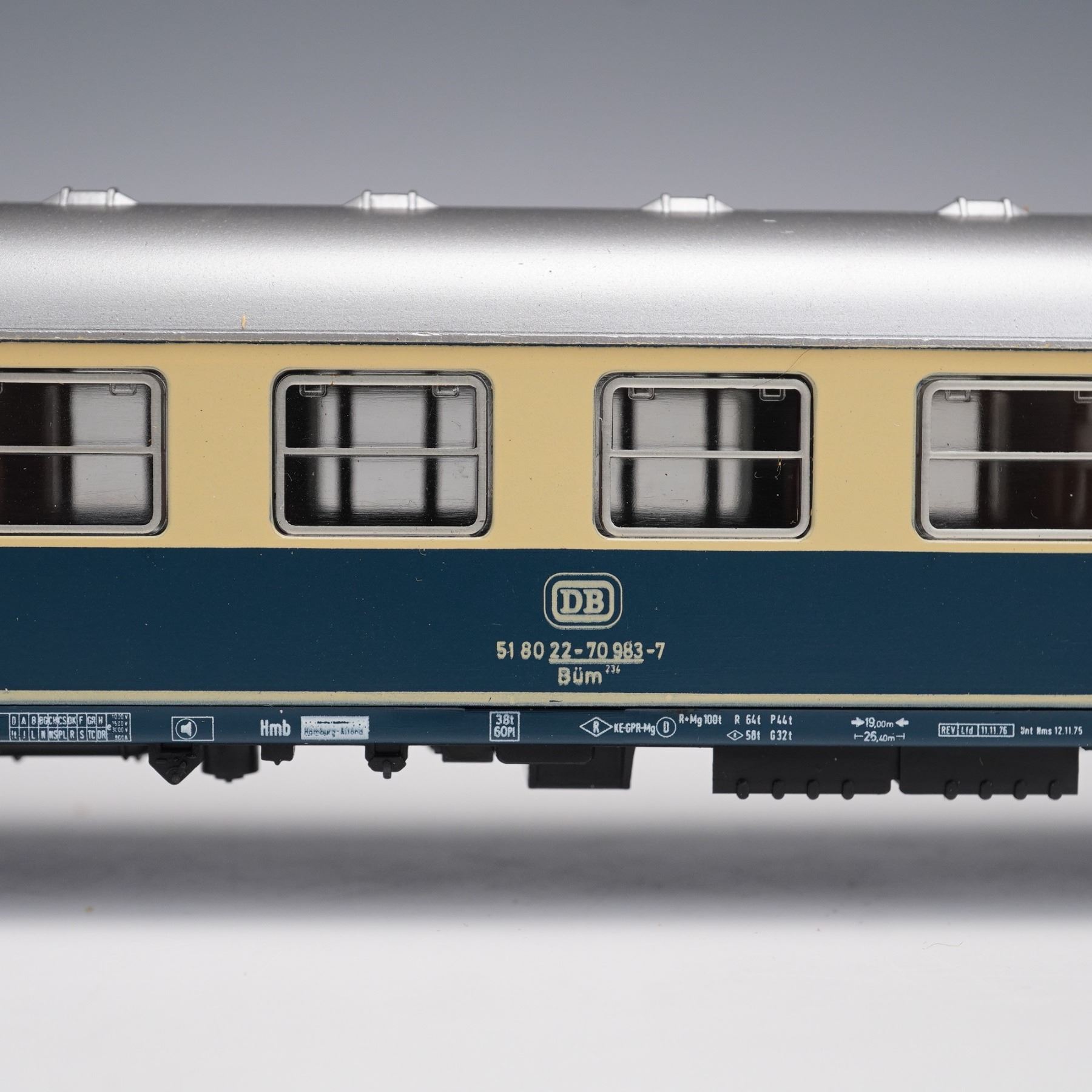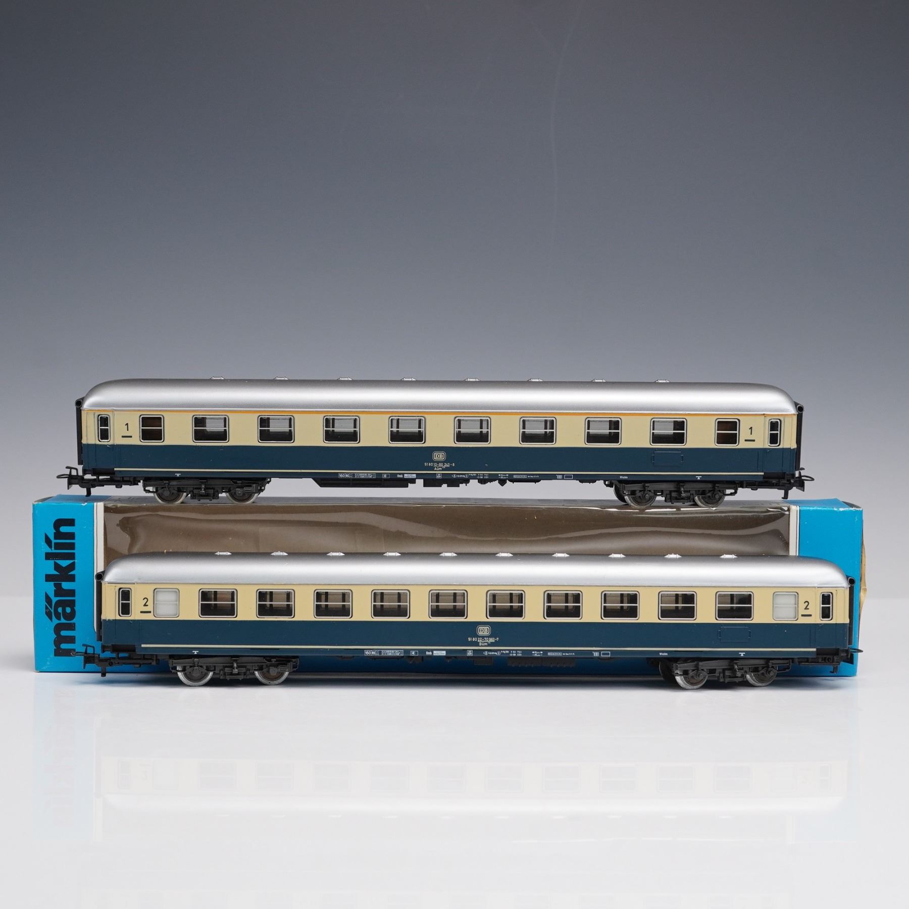 This lot offers three Marklin HO scale German passenger train cars, each crafted with the precision and quality Marklin is renowned for and marked "Marklin - Made in Germany." The set includes two Deutsche Bundesbahn passenger coaches in the classic blue and beige livery, one designated as a first-class coach and the other as a second-class coach, both showcasing finely detailed windows, crisp lettering, and intricate undercarriage components. Accompanying them is a striking dining car, or "Speisewagen," finished in the elegant red and cream livery, complete with authentic graphics and highly detailed mechanical elements beneath. All three cars feature smooth-rolling metal wheels and come in their original blue Marklin boxes, labeled with model numbers 4091, 4092, and 4094. These cars are in excellent cosmetic condition, with only light handling wear visible on the wheels and bases, making them an ideal addition for both collectors and enthusiasts looking to enhance their HO scale layouts with authentic German railway pieces.