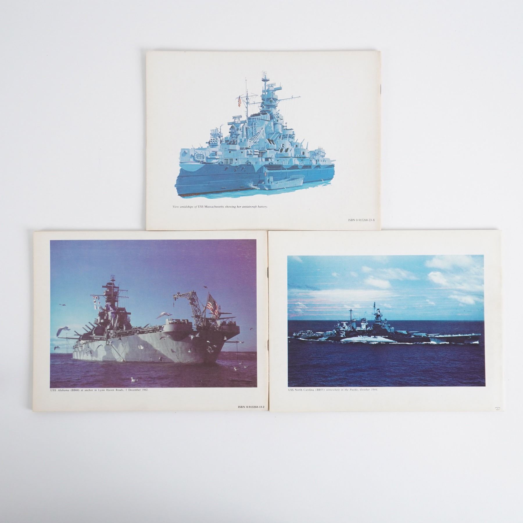 This collection of three Ships Data booklets from Leeward Publications provides detailed technical information, specifications, and history on three legendary World War II battleships. Covering the USS North Carolina (BB55), USS Alabama (BB60), and USS Massachusetts (BB59), these booklets offer insights into their design, armament, and service history. Richly illustrated and highly informative, this set is perfect for naval historians, model ship enthusiasts, and collectors of WWII military literature. Largest book measures 10.75"W.