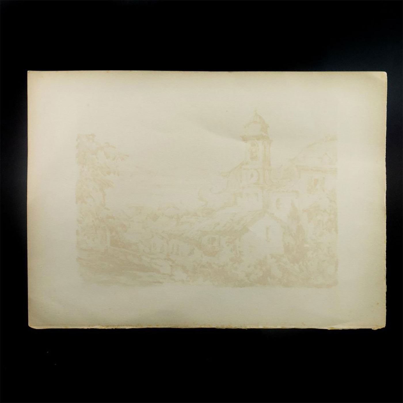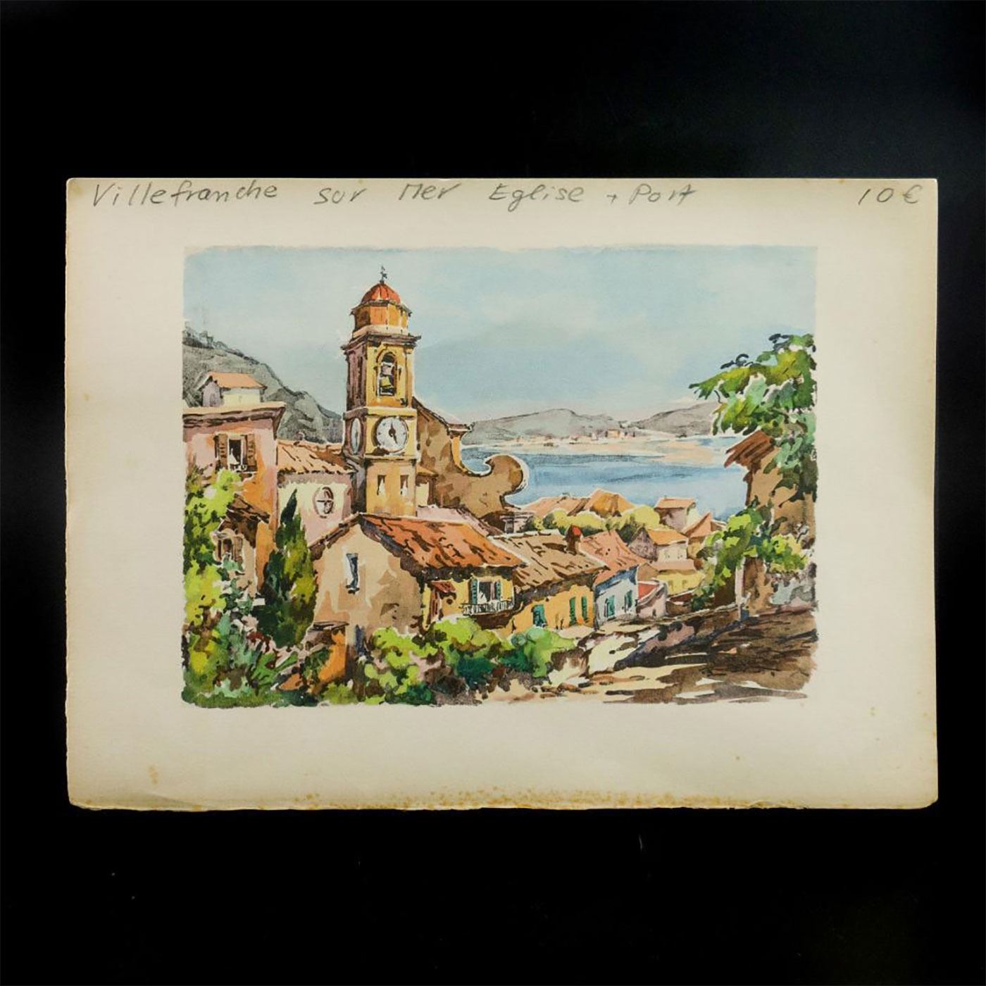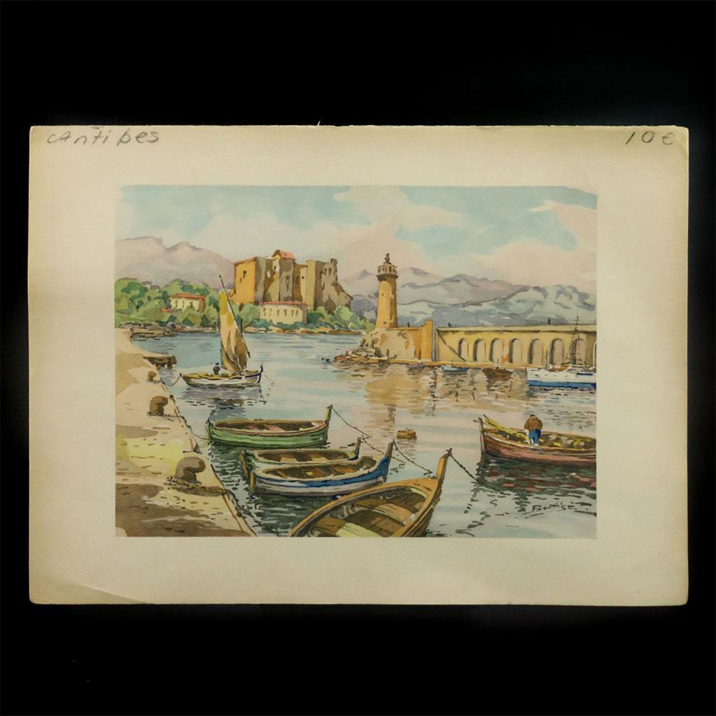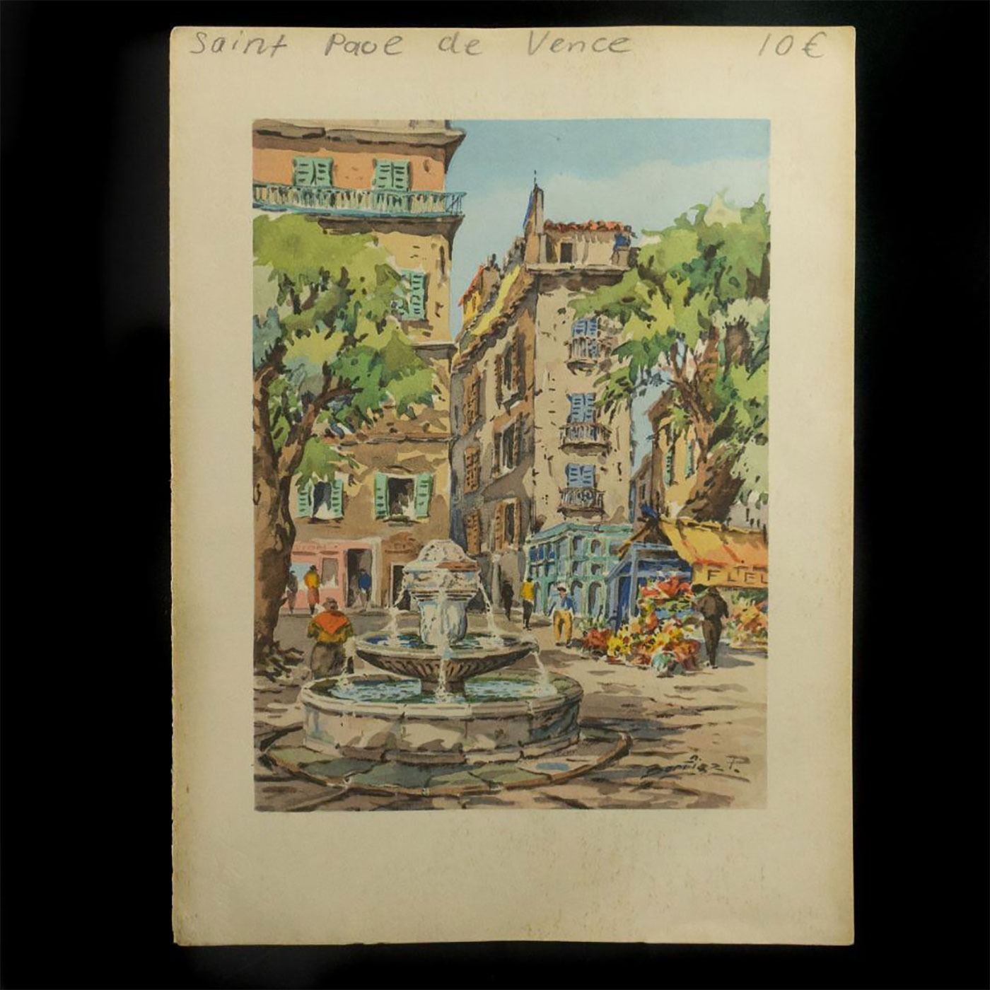 On paper featuring Saint Paul de Vence, Antibes, and Villefrance Sur Mer Eglise & Port. Signed. Artist signed front lower left corner. Some damage to edges of paper.