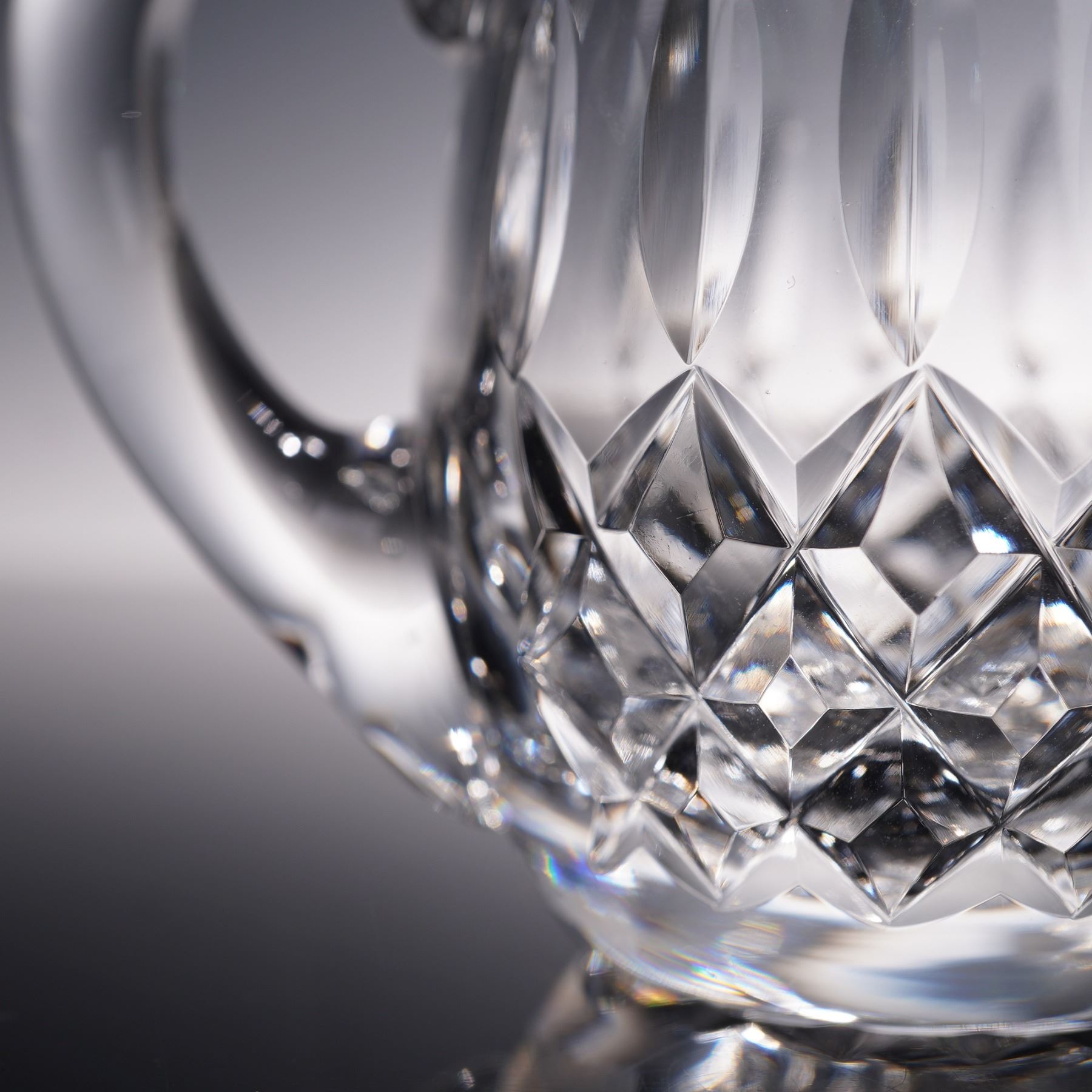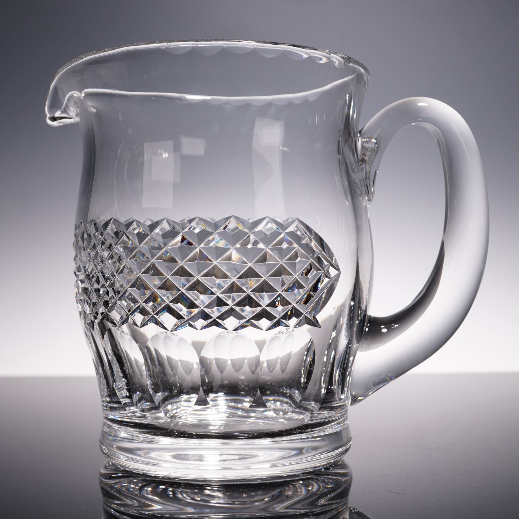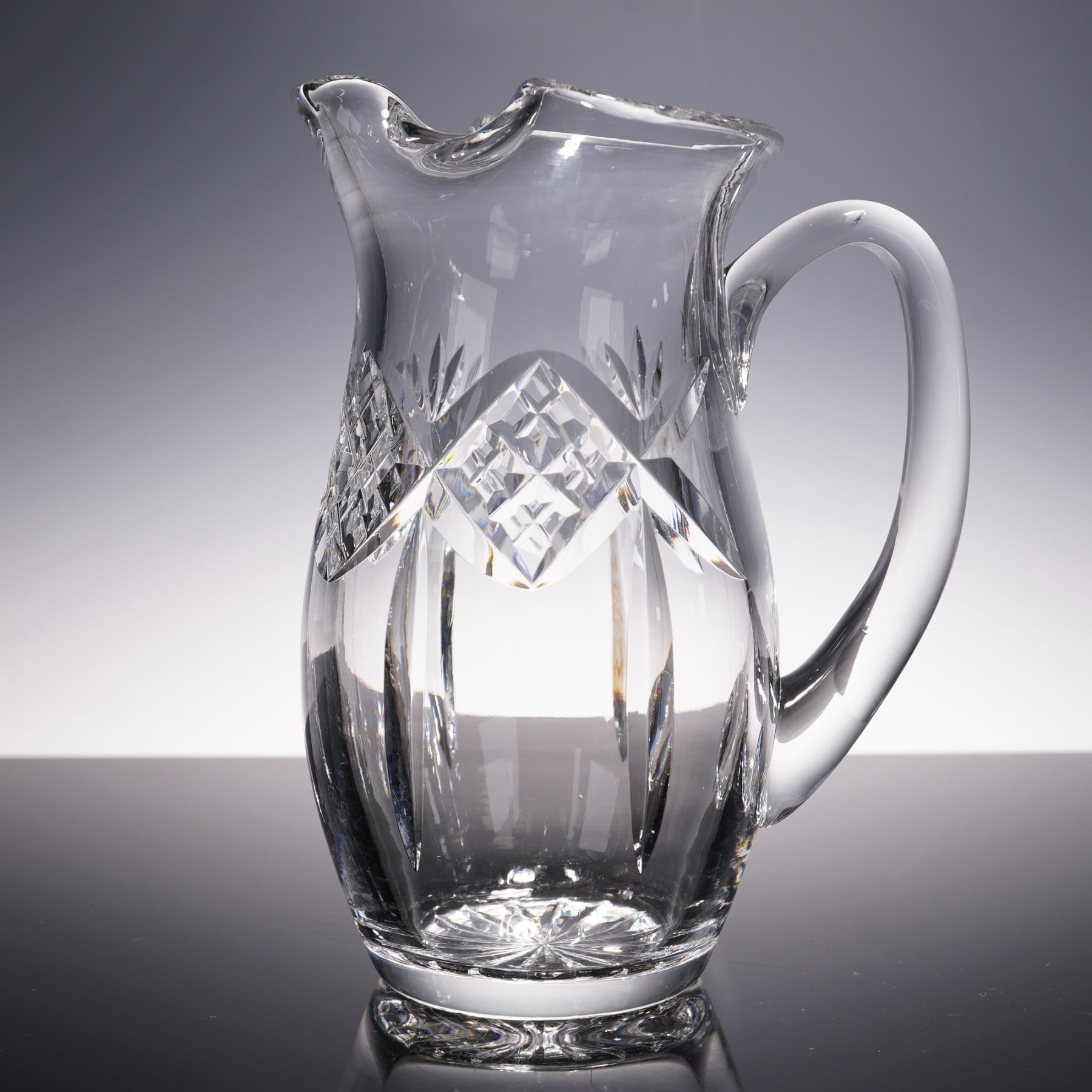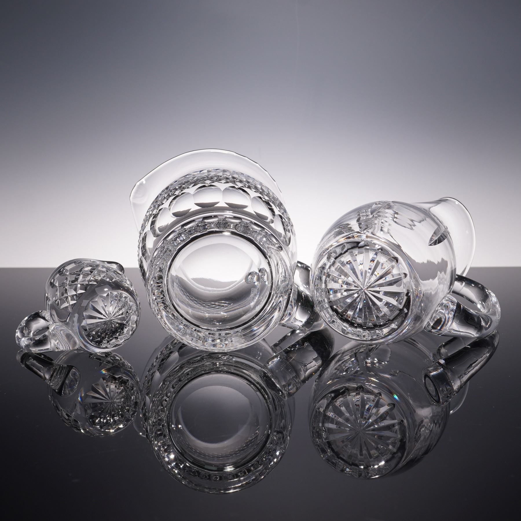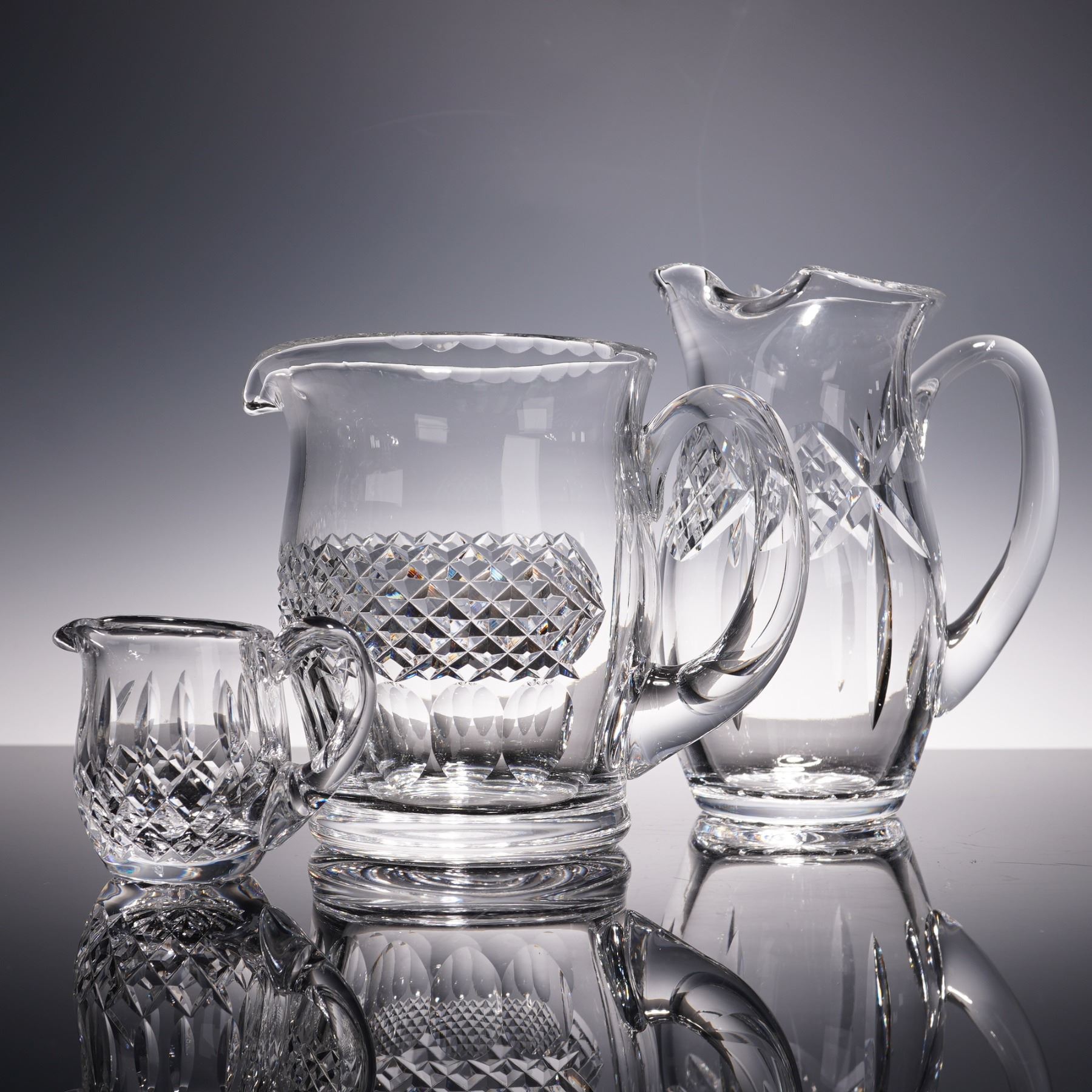 A distinguished 3-piece collection of Waterford crystal, each piece marked and showcasing the brand's renowned craftsmanship. The lot includes a Colleen jug with its signature oval and diamond cut pattern, a tall martini pitcher with clean faceted detailing, and a Lismore creamer featuring the iconic diamond and vertical cut design. Together, they form a versatile group that combines functional elegance with timeless Waterford style.