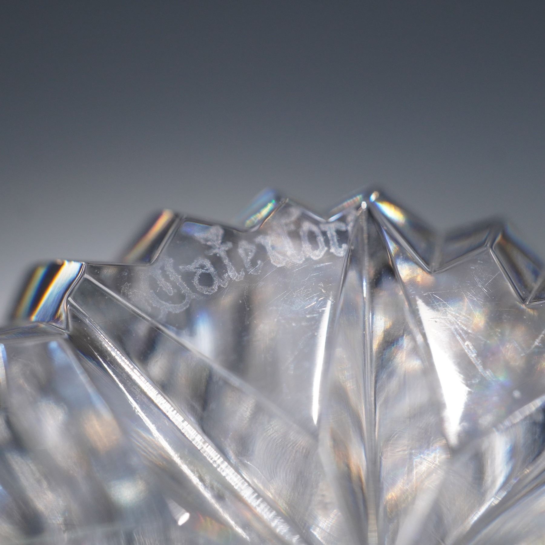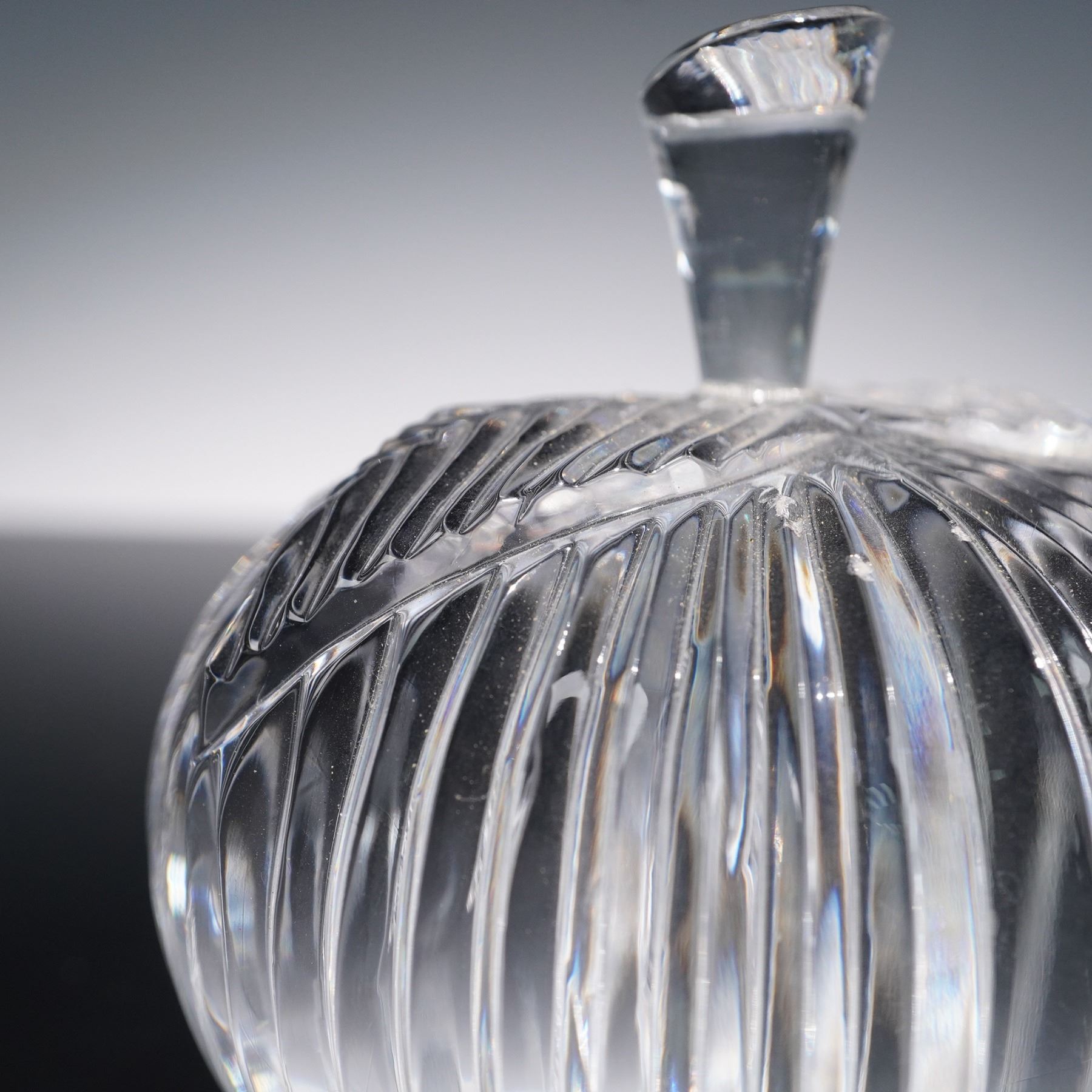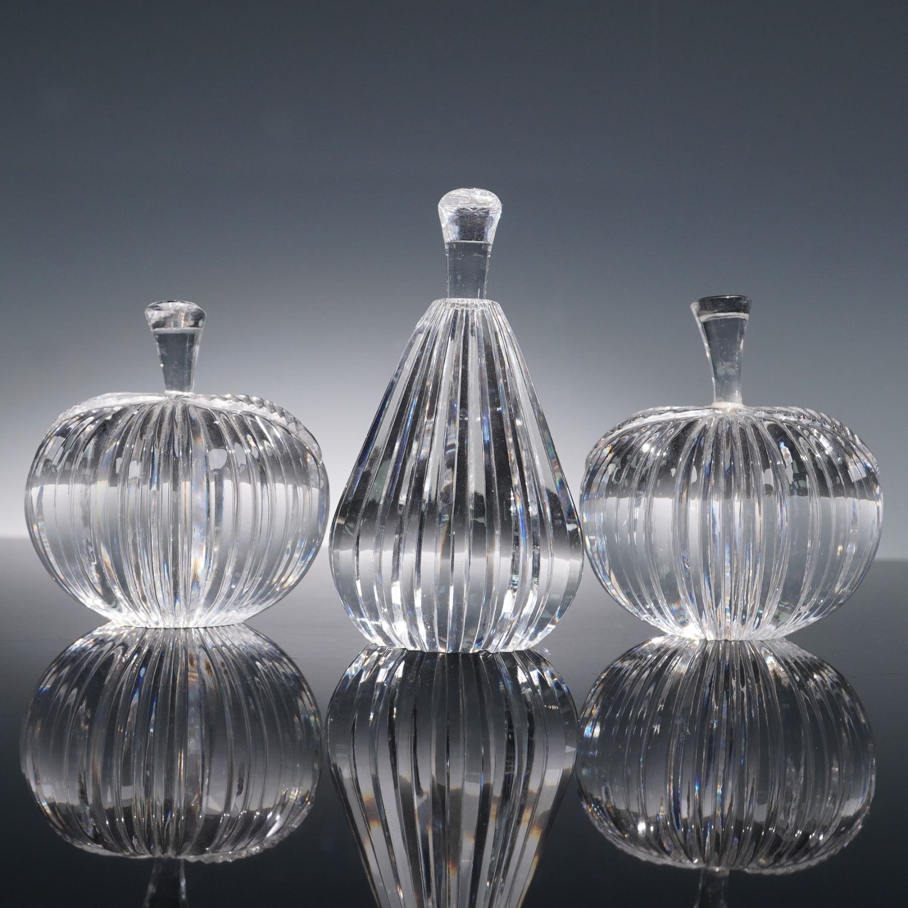 Set of three Waterford crystal paperweights in the form of fruit, including two apples and a pear. Each piece is crafted with vertical fluted cuts and faceted crystal stems, highlighting Waterford's signature brilliance and clarity. All bear the etched Waterford backstamp. A charming decorative set suitable for display or functional use as paperweights.