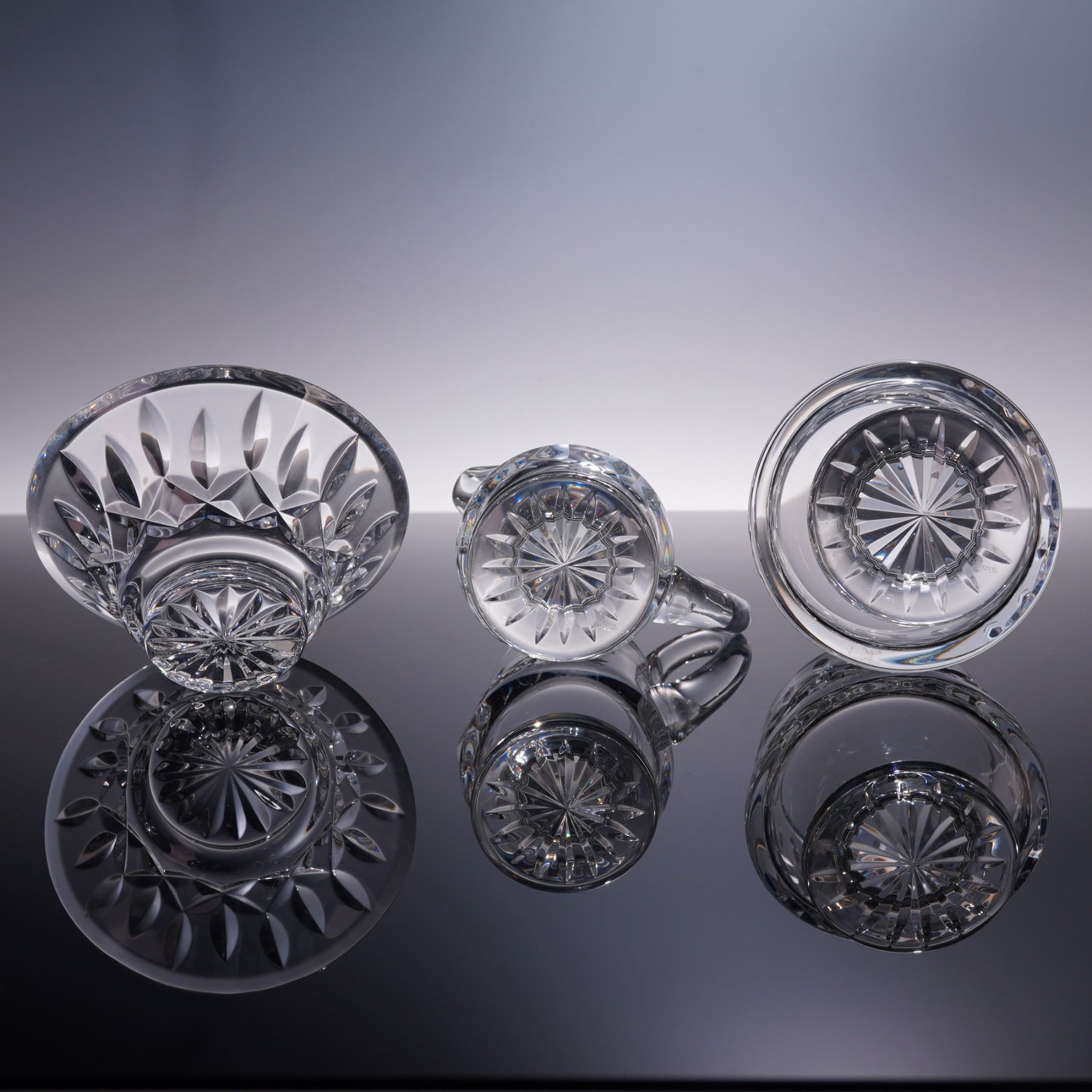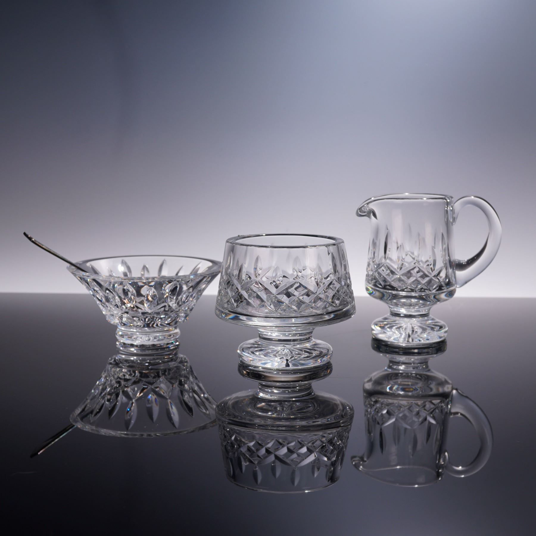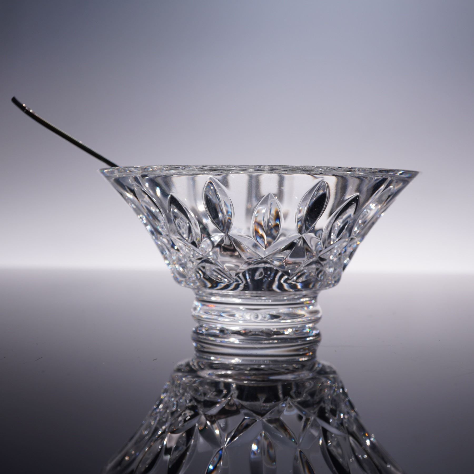 A three-piece Waterford cut crystal condiment set comprising a footed open sugar bowl, a footed creamer, and a footed condiment bowl with silverplate spoon. Each crystal piece features brilliant faceting and crosshatched cuts in Waterford's classic style, with starburst bases and a sparkling finish. The small silverplate spoon is marked EPNS (Electroplated Nickel Silver), adding an elegant touch to the ensemble. A charming and practical set, ideal for entertaining or as a collector's display.