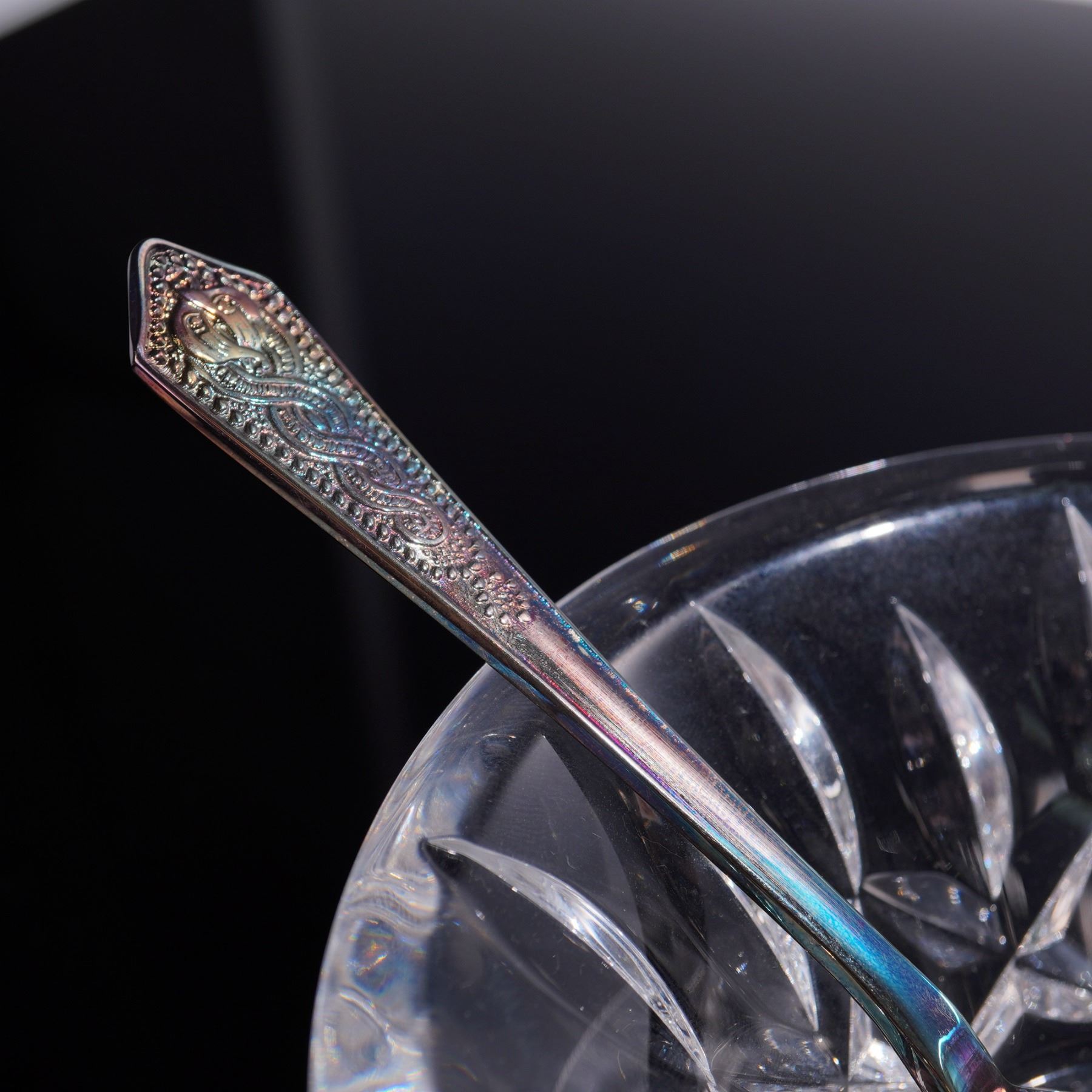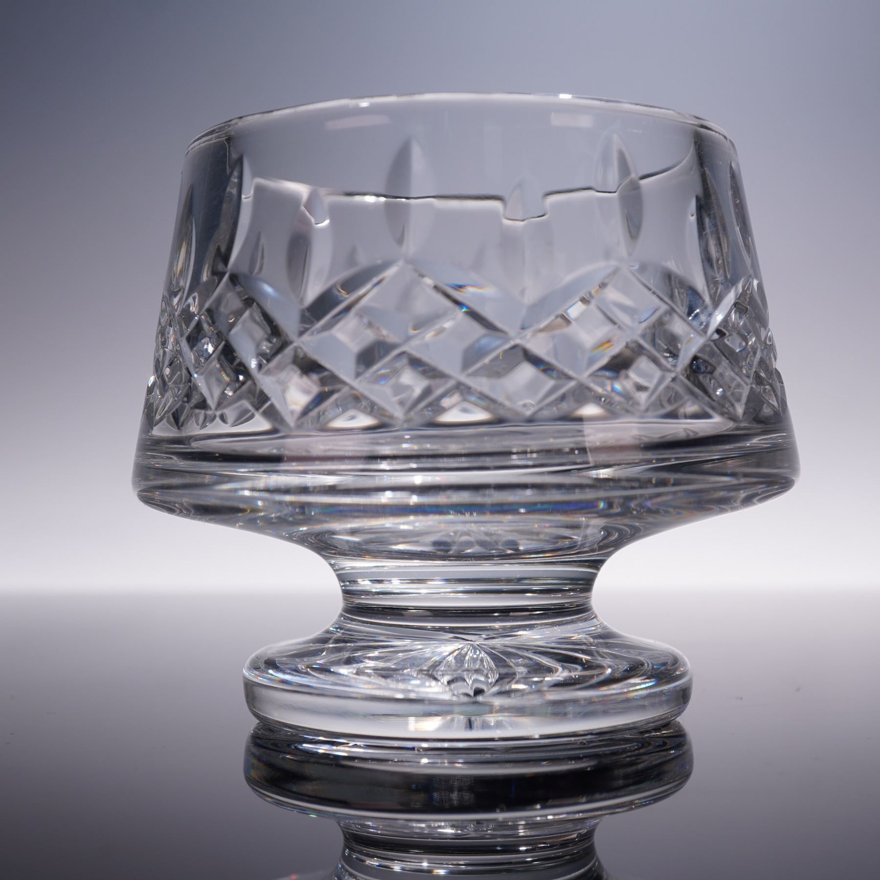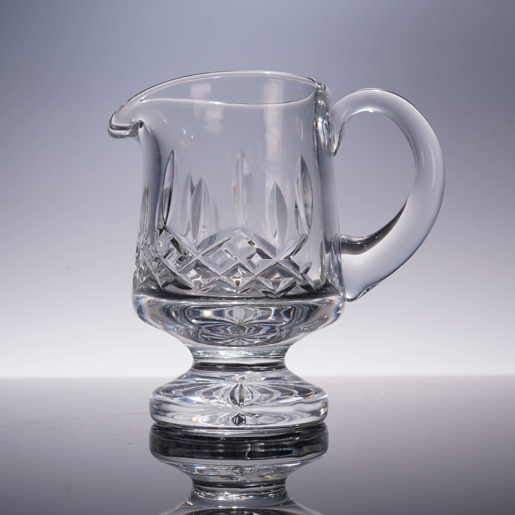 A three-piece Waterford cut crystal condiment set comprising a footed open sugar bowl, a footed creamer, and a footed condiment bowl with silverplate spoon. Each crystal piece features brilliant faceting and crosshatched cuts in Waterford's classic style, with starburst bases and a sparkling finish. The small silverplate spoon is marked EPNS (Electroplated Nickel Silver), adding an elegant touch to the ensemble. A charming and practical set, ideal for entertaining or as a collector's display.