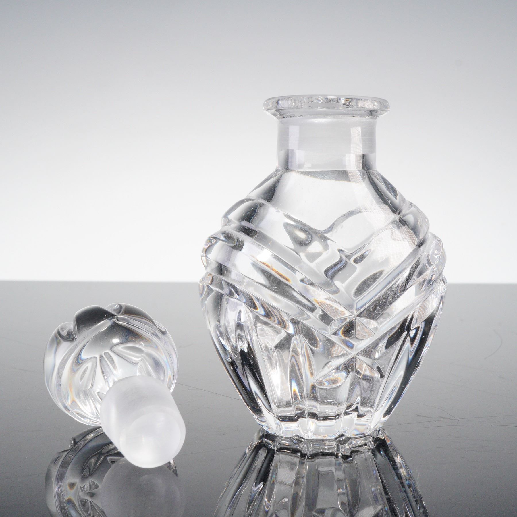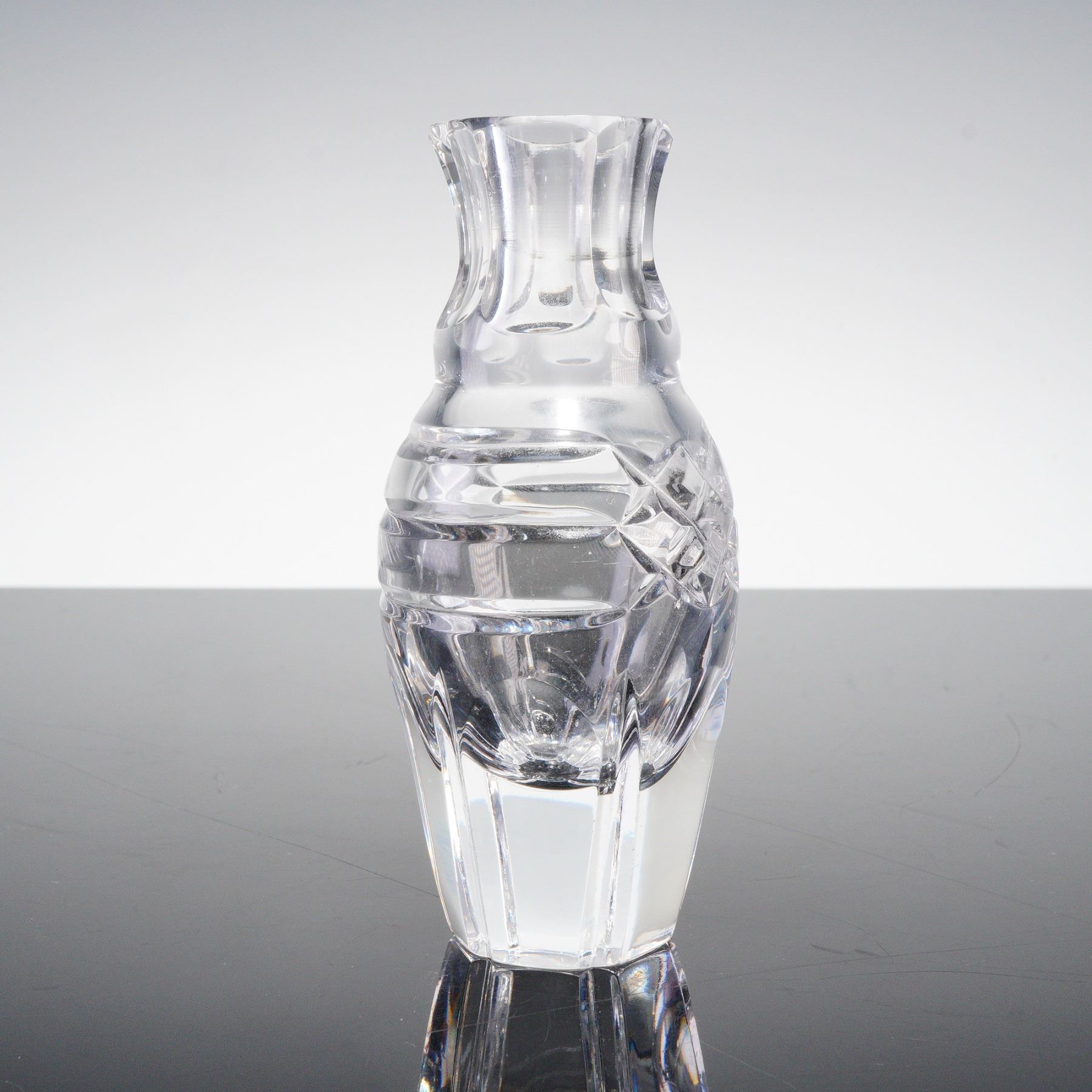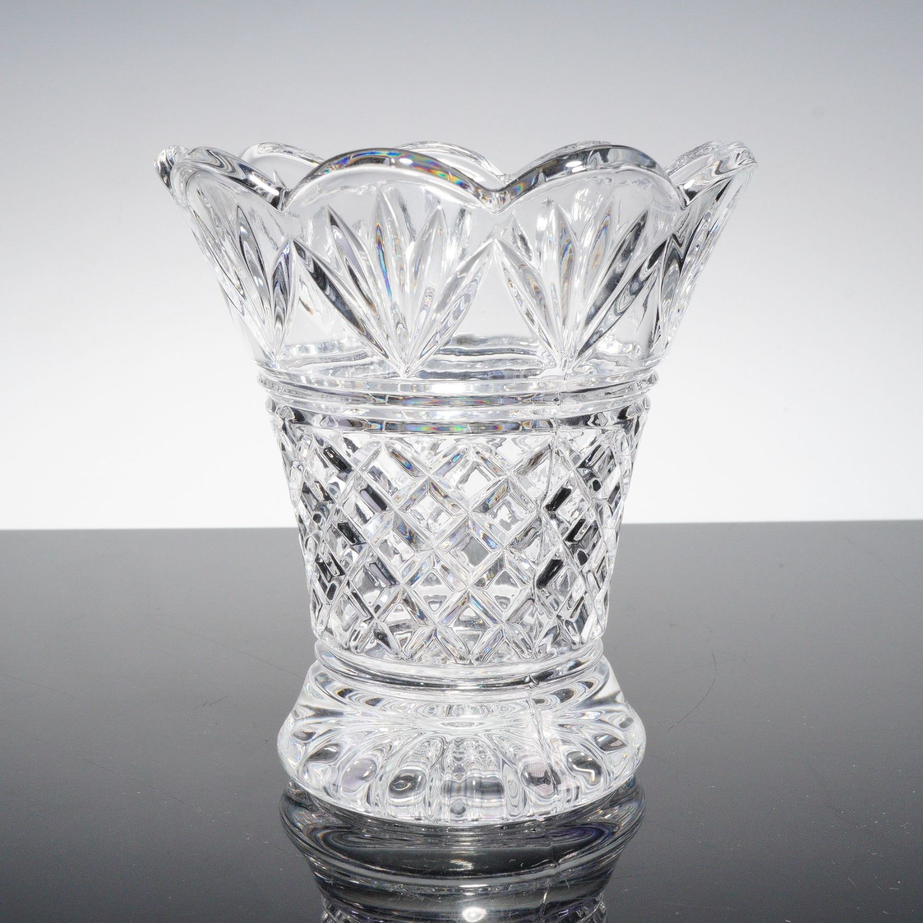 Three crystal vessels including a Waterford crystal perfume bottle with its stopper, a Rogaska crystal small vase, and a press crystal tall vase with scalloped edges and various elegant motifs. Waterford backstamp to the perfume bottle. Rogaska backstamp to the underside of vase.