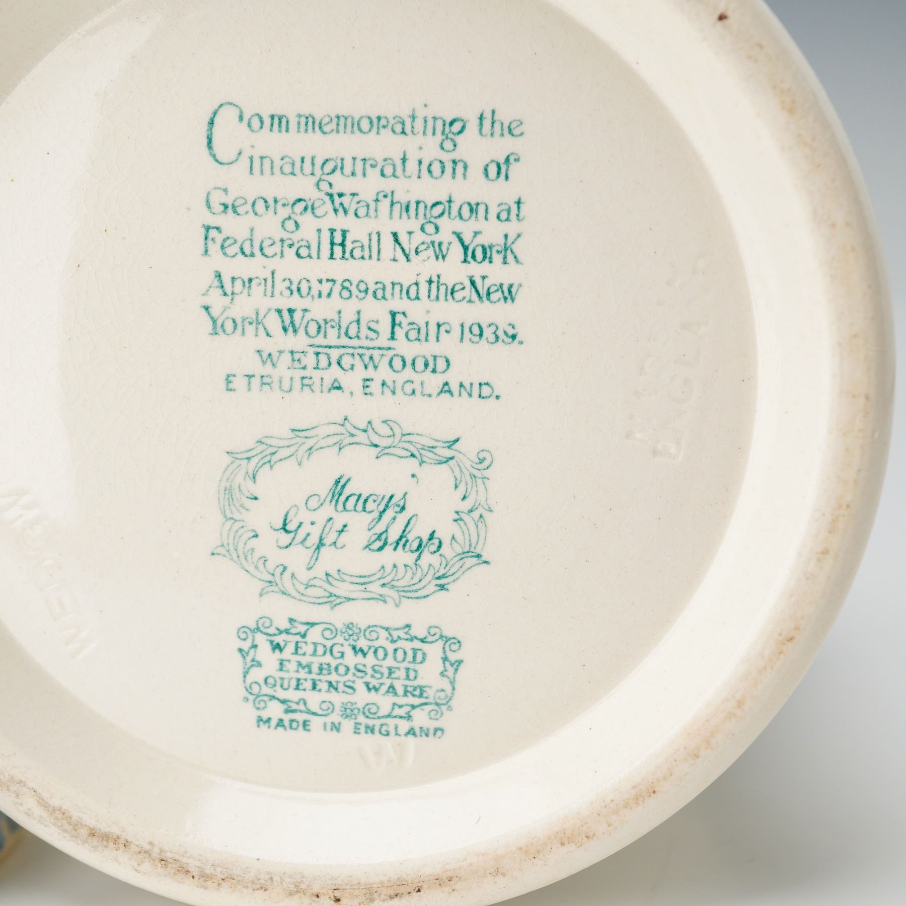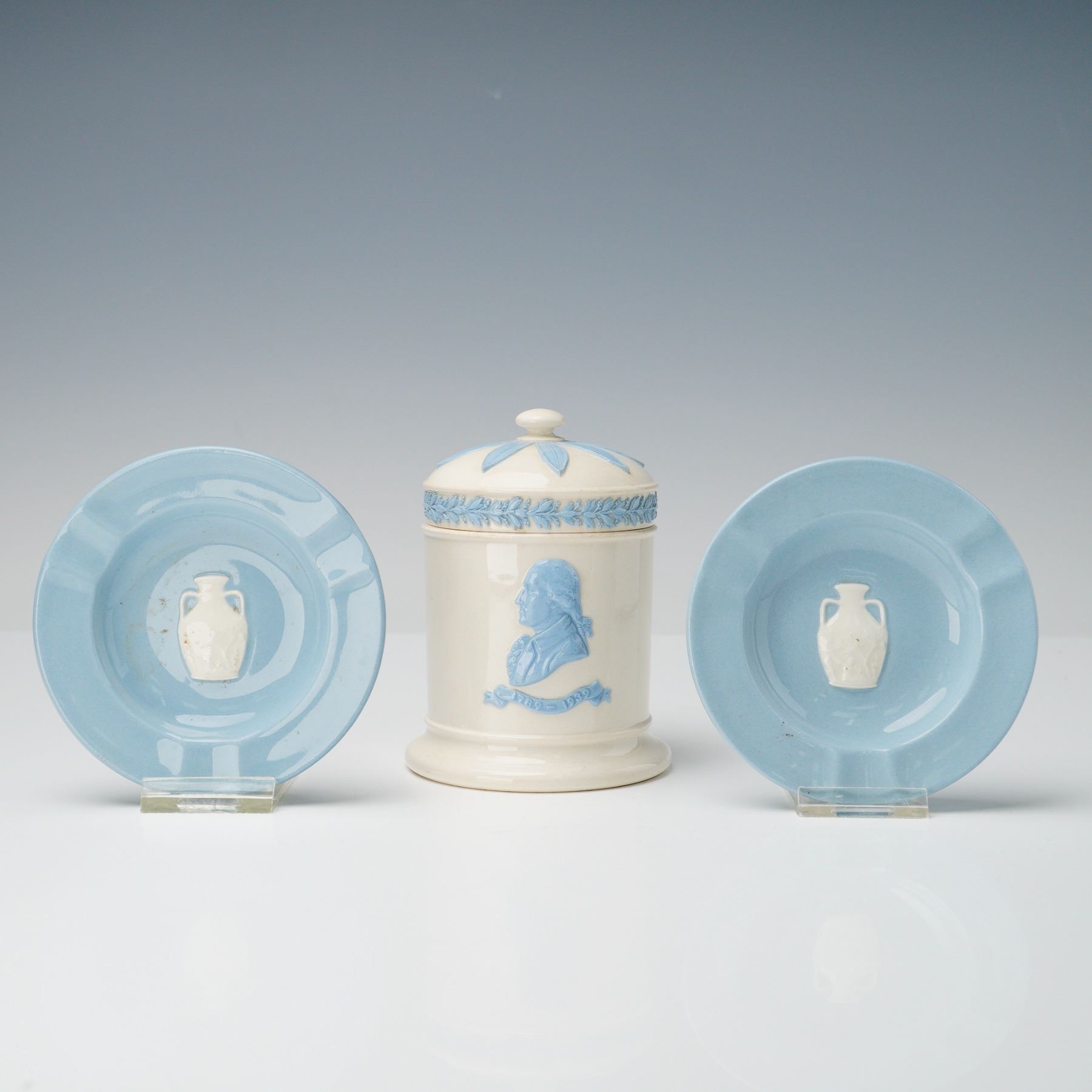 Three ceramic collectibles including a commemorative jar of the inauguration of George Washington at Federal Hall New York and is decorated with a blue facing left portrait on the obverse and was retailed by Macy's Gift Shop for the 1939 New York World's Fair. Also included are two ashtrays, each centered with applied white Portland vases. Wedgwood backstamp.