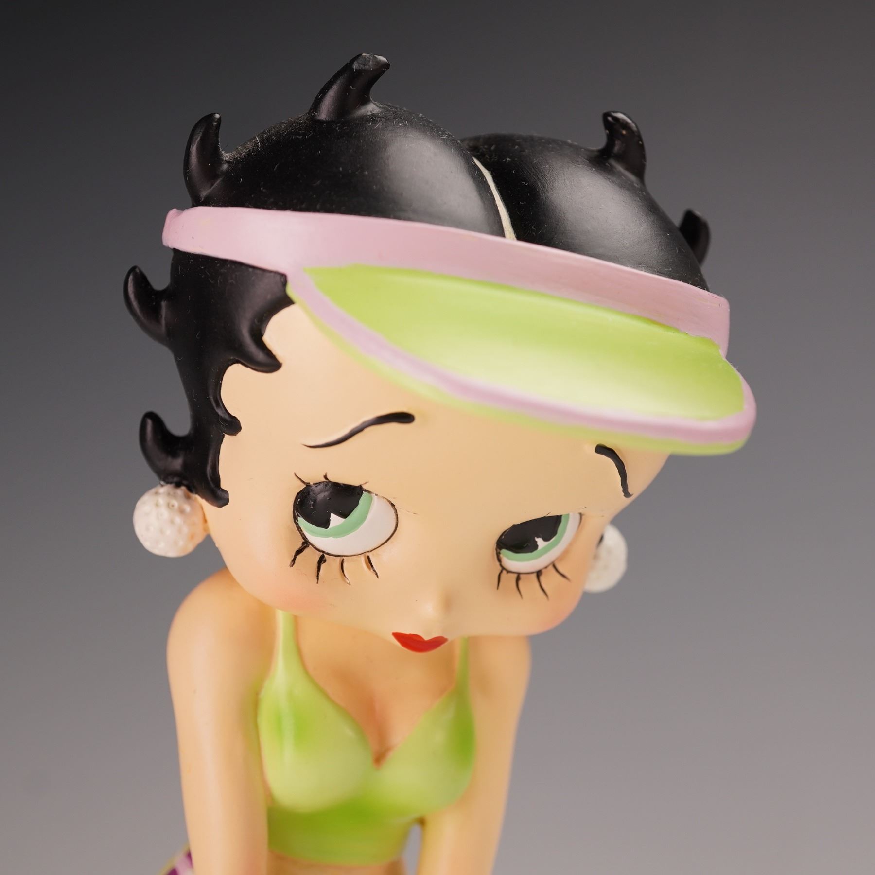 This charming trio features Betty Boop in playful sporting and Hollywood-themed poses. The first figurine, "Golfer Betty," depicts Betty in a green top and plaid shorts preparing to putt beside her dog, complete with a green base and flag marker, model number 20033. The second figurine, "Tennis Betty," shows her mid-serve in a green and red athletic outfit with tennis balls and racket, model number 20035. The third, "Hooray for Hollywood Betty Boop," by Funko, features the iconic character in her classic red dress over a black base labeled "BETTY BOOP," model number A051. Each figurine includes maker's marks and licensing details on the base, including the Westland Giftware and King Features Syndicate logos. This item has its original box.