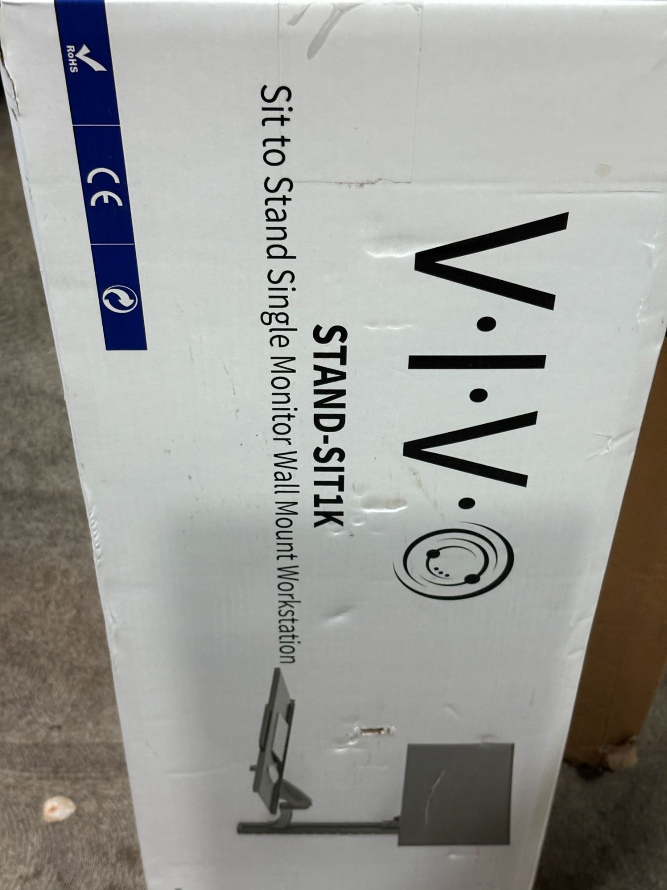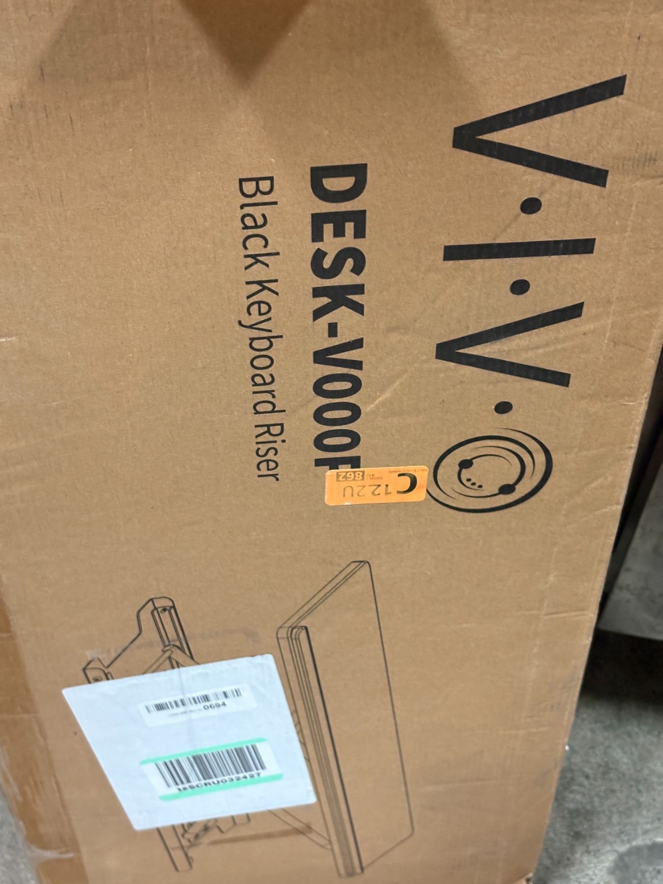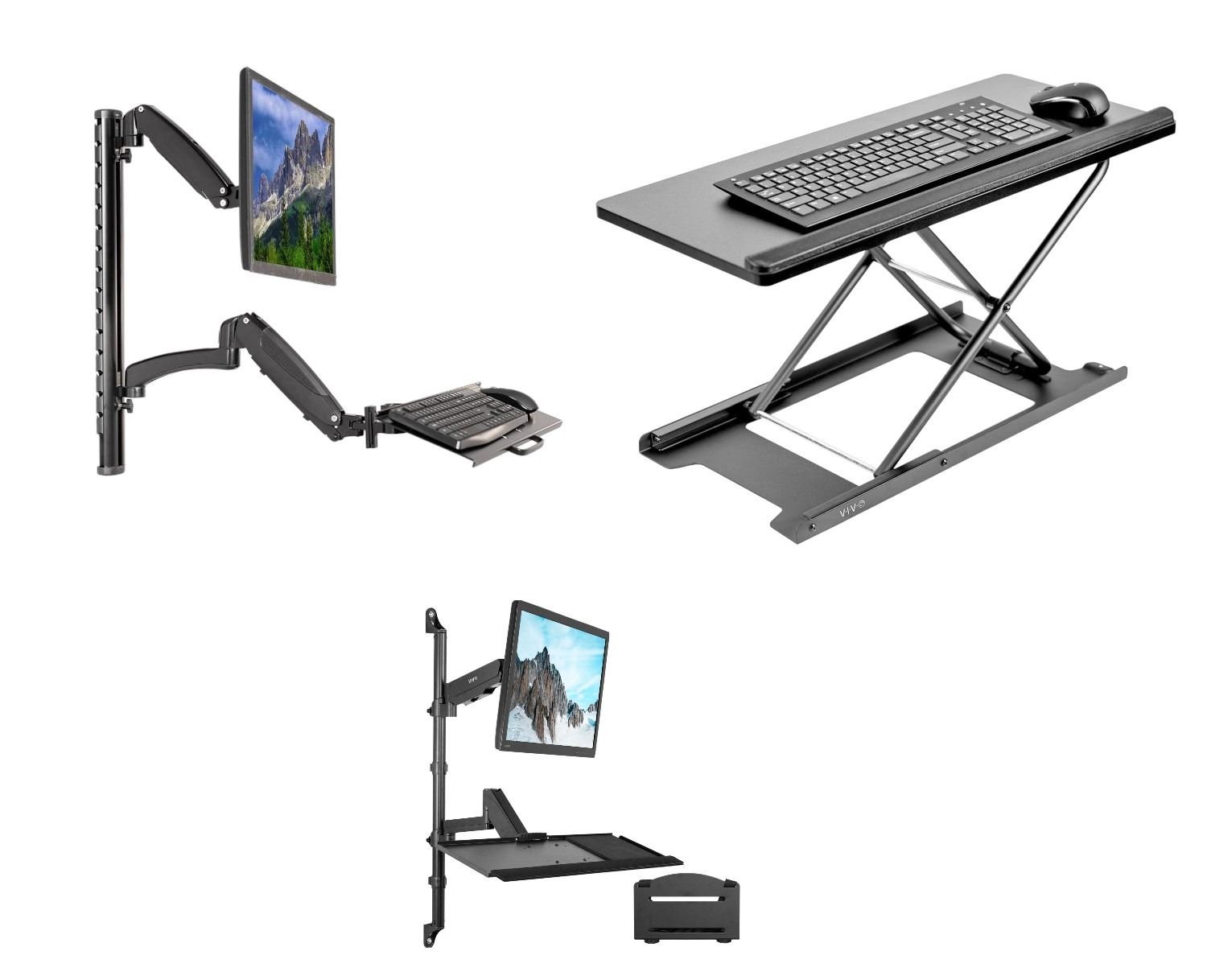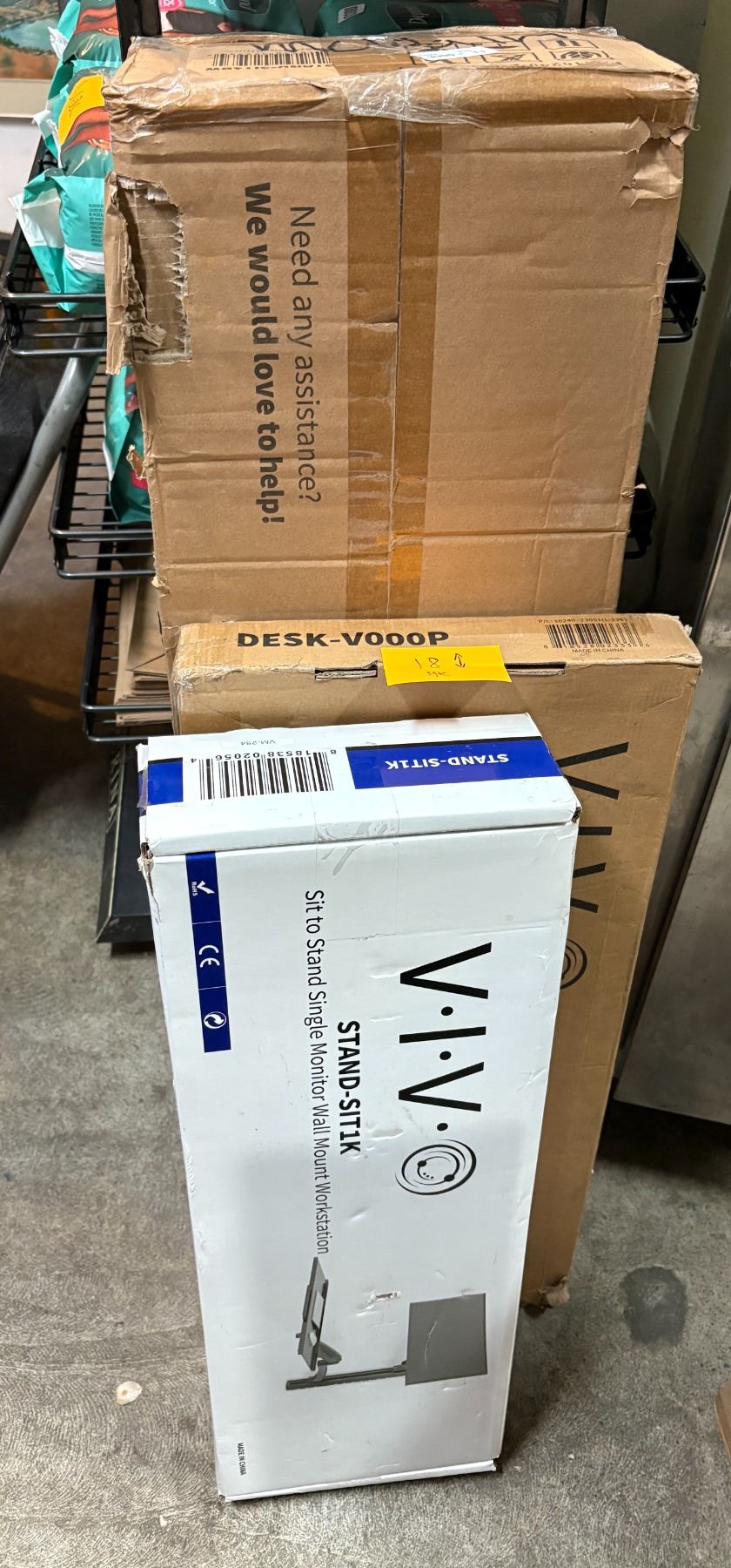 3pc assorted VIVO items - black keyboard riser & sit to stand single monitor wall mount workstations (refurbished in boxes)